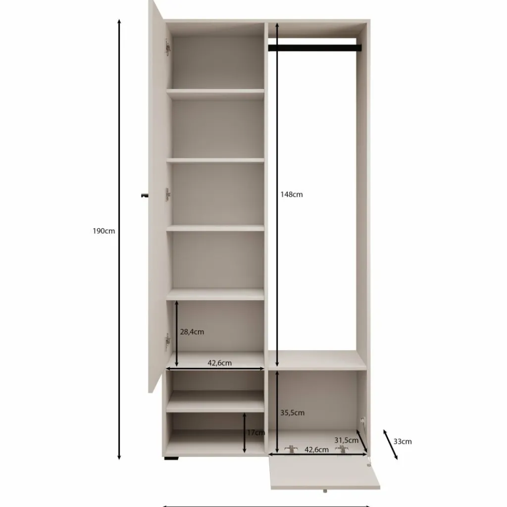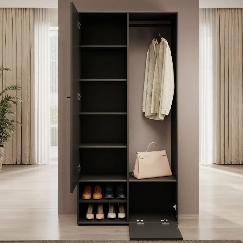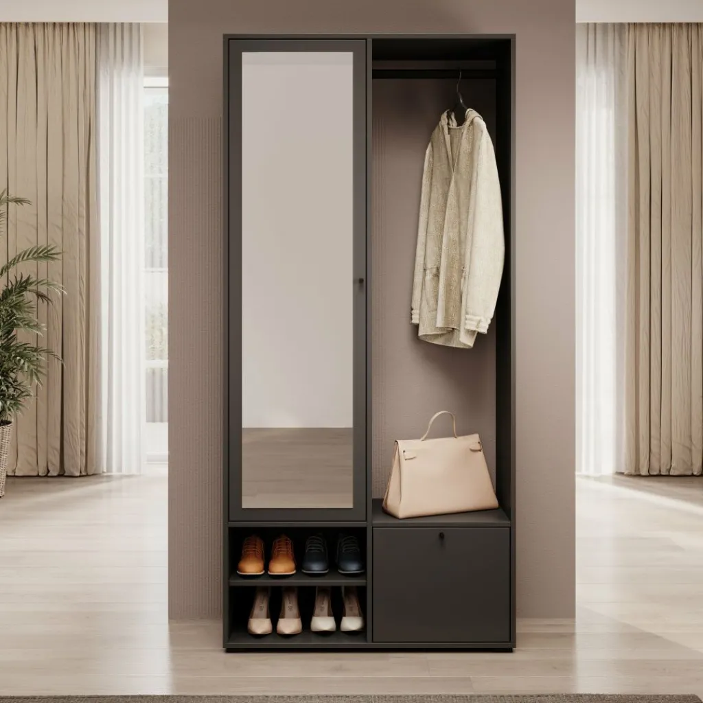 Halkast Deacon combineert een strakke uitstraling met slimme opbergruimte. Deze moderne kast in zwarte kleur is perfect voor de hal of gang en helpt je om alles overzichtelijk te houden. Achter de spiegeldeur zitten vijf ruime vakken, ideaal voor het opbergen van sjaals, handschoenen of andere accessoires. Aan de rechterzijde vind je een kledingroede voor jassen, een handig zitvlak met open vakken voor schoenen, en onderin een klepkastje voor extra opbergruimte. De zwarte knopgrepen geven de kast een strak accent.