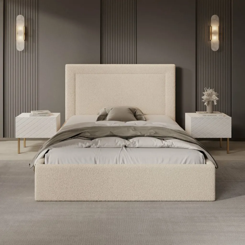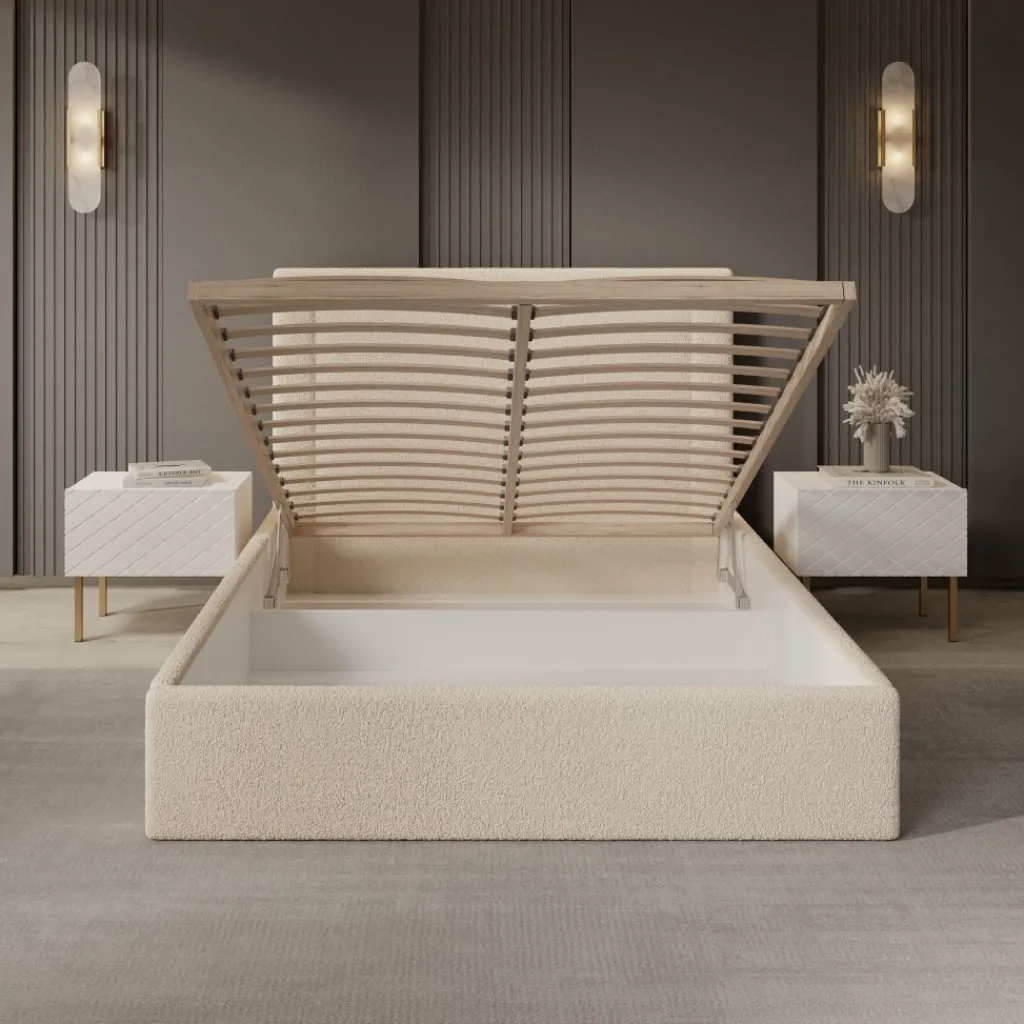 Het Dejada-bed heeft een recht ontwerp met een beklede omranding en een hoog hoofdbord. De bekleding is uitgevoerd in beige teddystof. Onder het bed zit een opbergruimte die toegankelijk is via het omhoogklapbare frame. Dit biedt extra ruimte voor bijvoorbeeld beddengoed of overige spullen. Het bed wordt zonder matras geleverd.