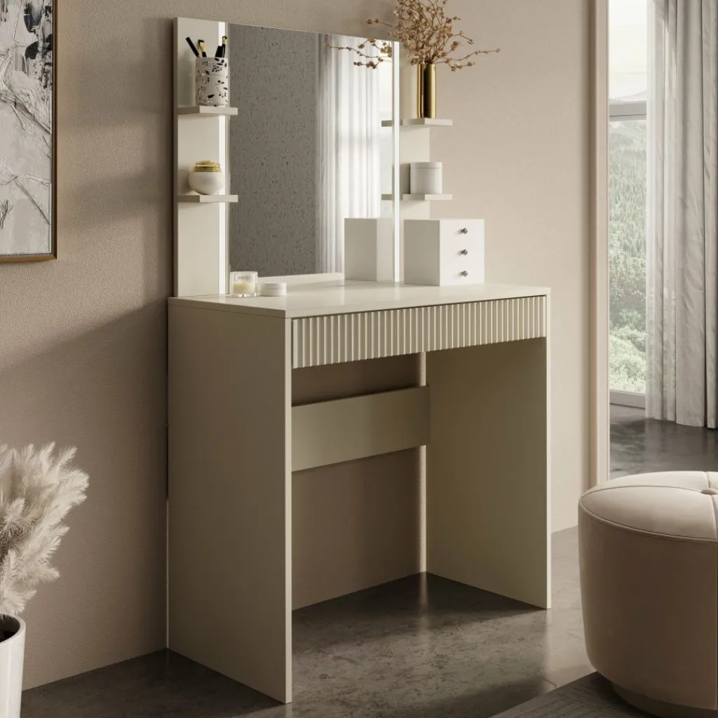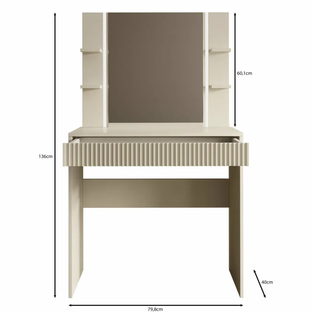 Met een breedte van 80 cm en een diepte van 40 cm is deze kaptafel compact genoeg voor kleinere ruimtes, terwijl de totale hoogte van 136 cm (inclusief spiegel) zorgt voor een mooi, functioneel geheel.