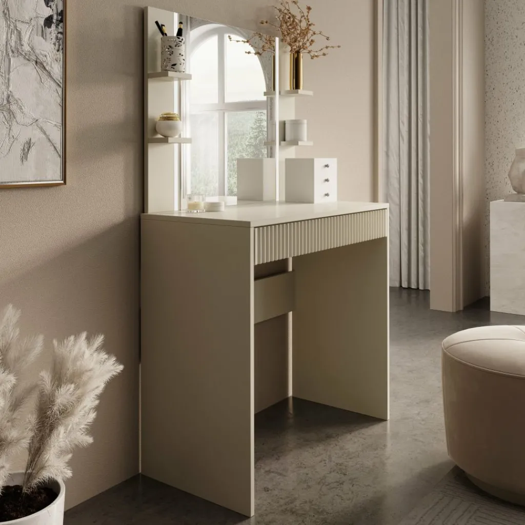 De kaptafel beschikt over één brede lade, volledig greeploos voor een strak en modern uiterlijk. De voorkant van de lade is voorzien van een verticaal lattenpatroon, wat zorgt voor een subtiele maar luxe uitstraling.