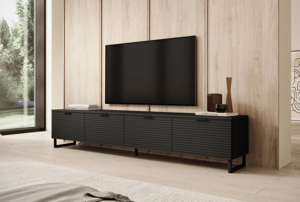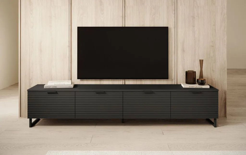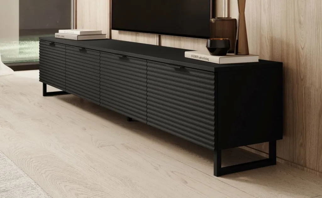 TV-Meubel Delgado is gemaakt van een stevige spaanplaat constructie in mat zwarte kleur.