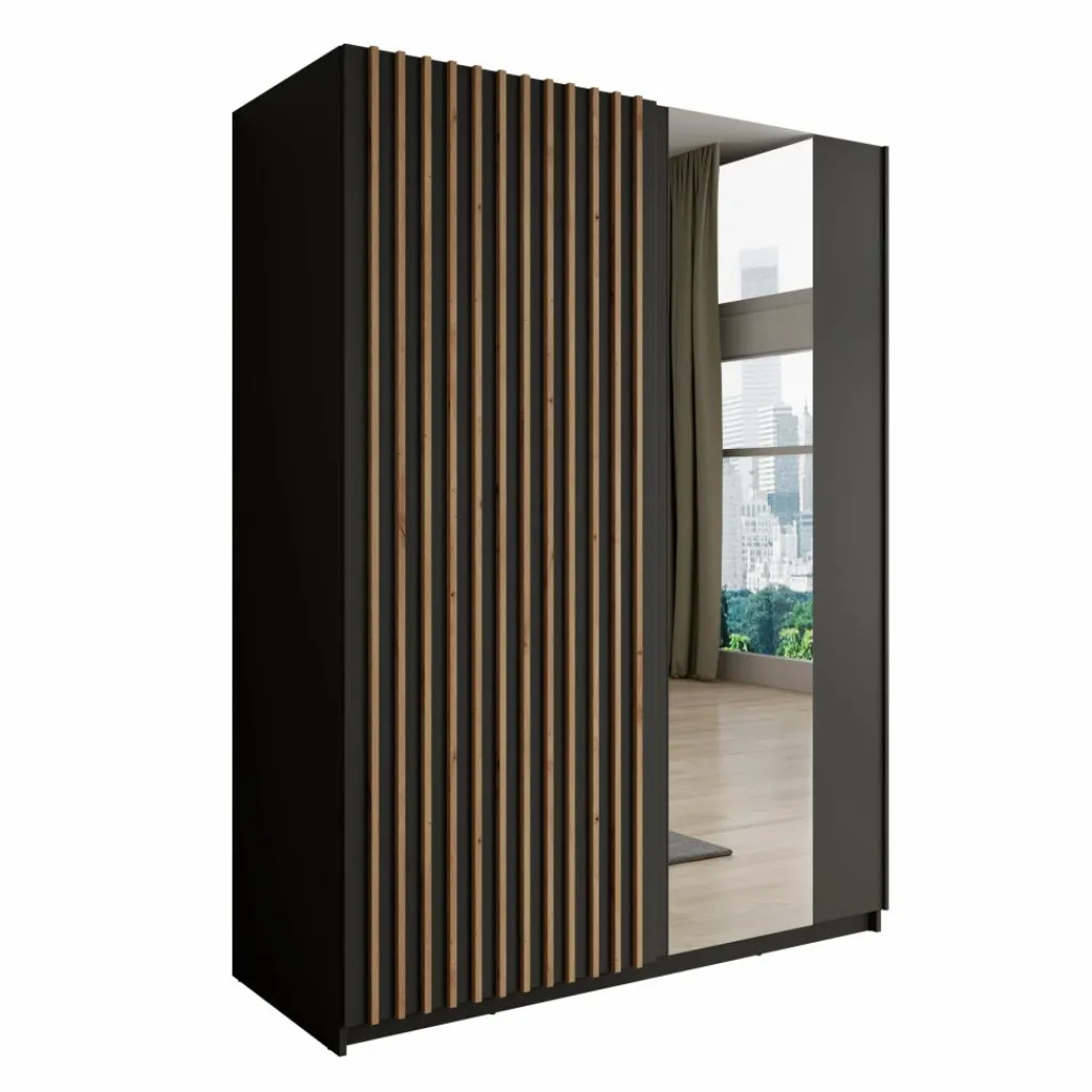 Kledingkast Deliryon is een moderne garderobekast in mat zwarte kleur. De kast is voorzien van twee schuifdeuren zonder grepen voor een minimalistische uitstraling. Eén van de deuren is afgewerkt met een grote spiegel, ideaal om snel je outfit te checken en tegelijkertijd extra licht en ruimtelijkheid in de slaapkamer te brengen. De andere deur beschikt over een trendy latten paneel.