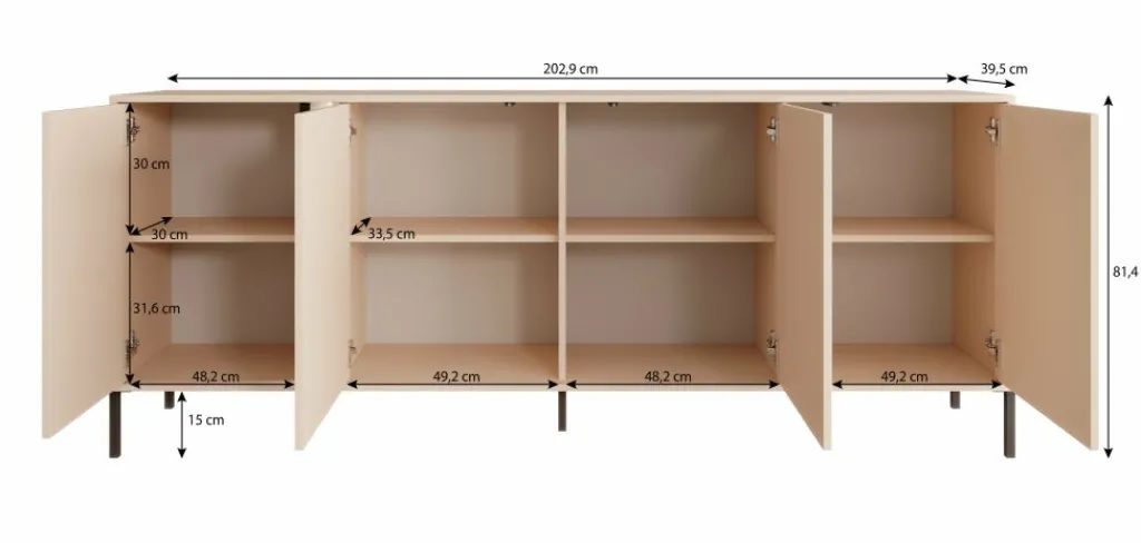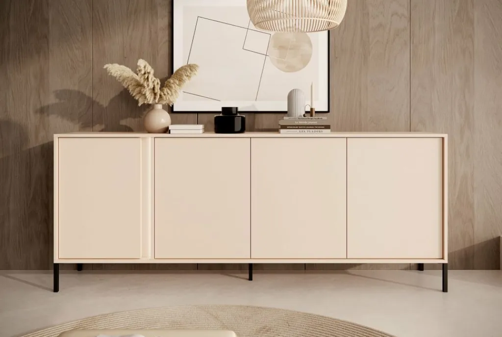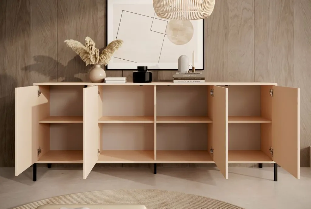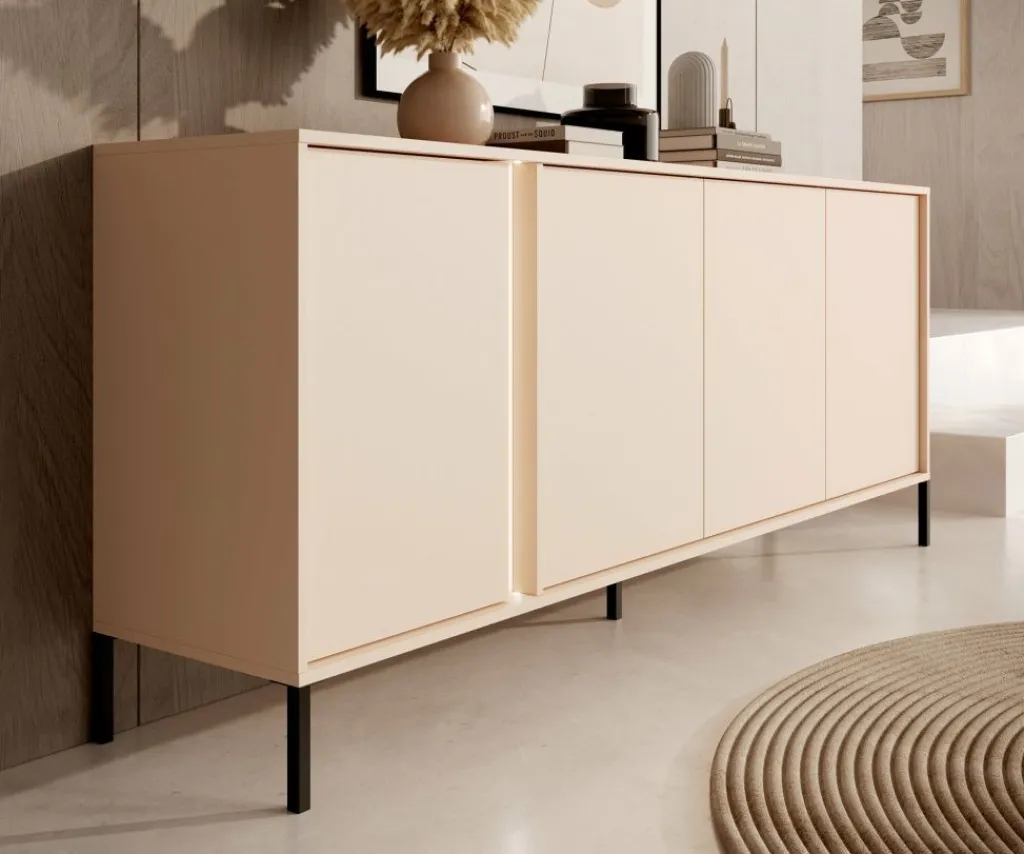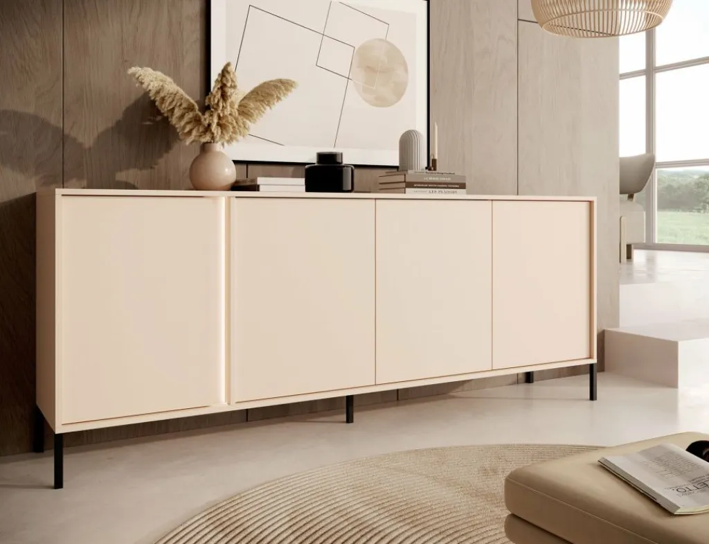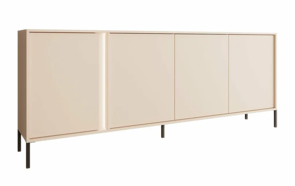 Dressoir Desert is een moderne designkast, uitgevoerd in een beige kleur. De kast staat op metalen poten en beschikt over 4 deuren. Deze zijn te openen door middel van het push-to-open systeem. Door de bijgeleverde LED-verlichting wordt het meubel een echte eye-catcher!