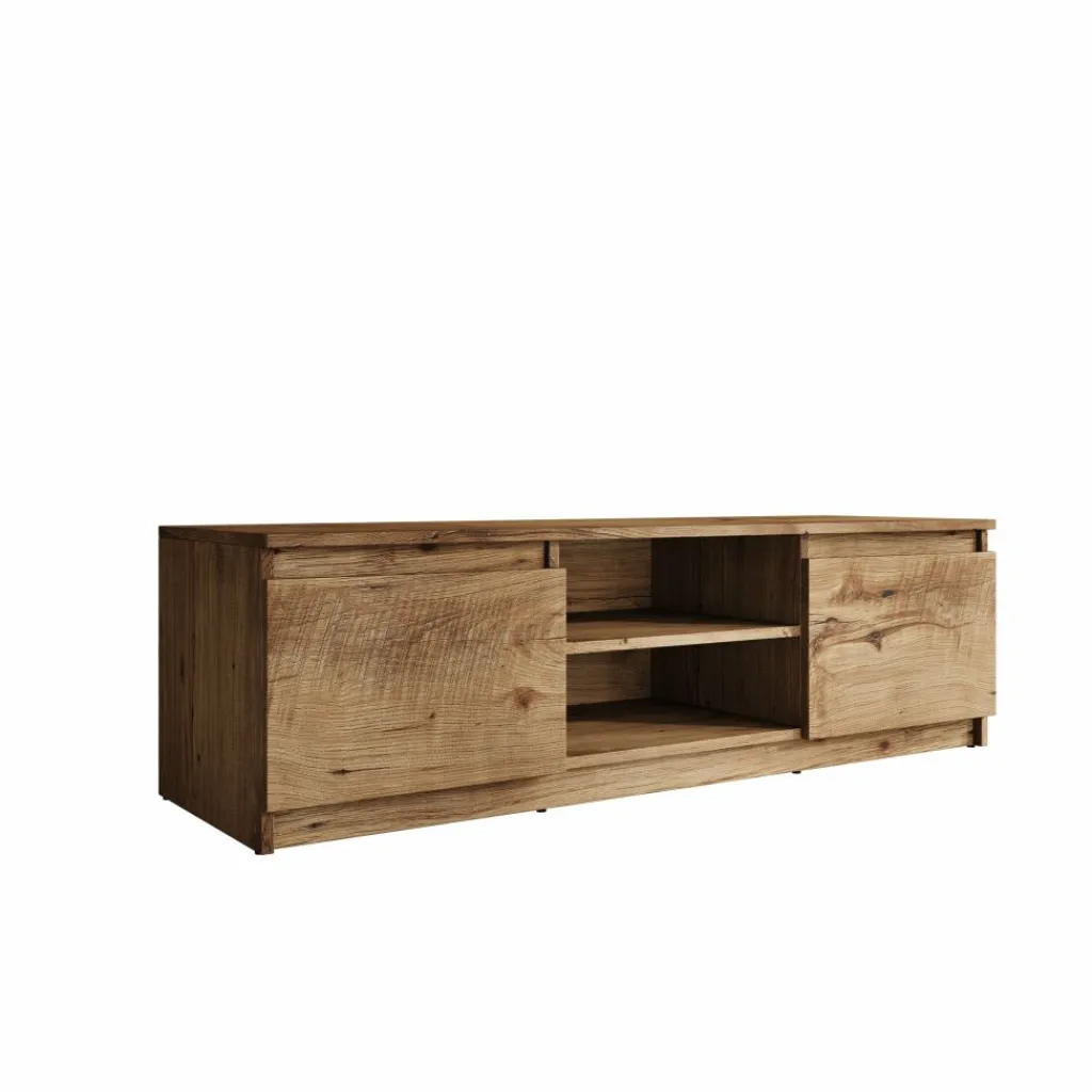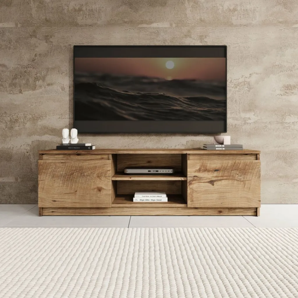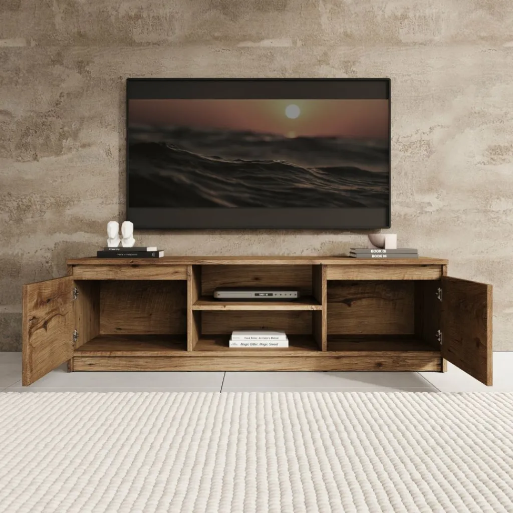 Aan de voorzijde beschikt het tv-meubel over twee dichte deuren aan de linker- en rechterzijde. In het midden bevindt zich een open vak met een extra legplank, geschikt voor het plaatsen van media-apparatuur zoals een decoder, spelconsole of receiver. De open indeling maakt apparatuur direct toegankelijk zonder dat kabels in het zicht liggen.