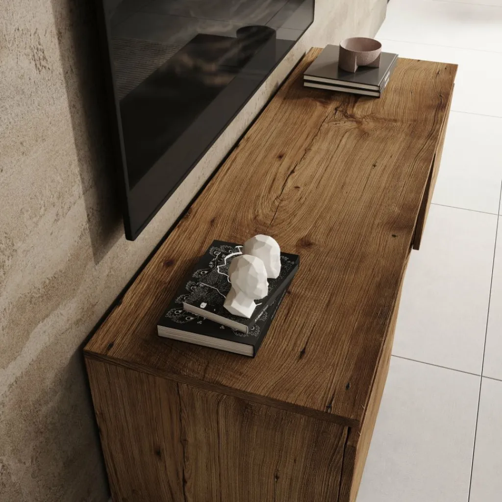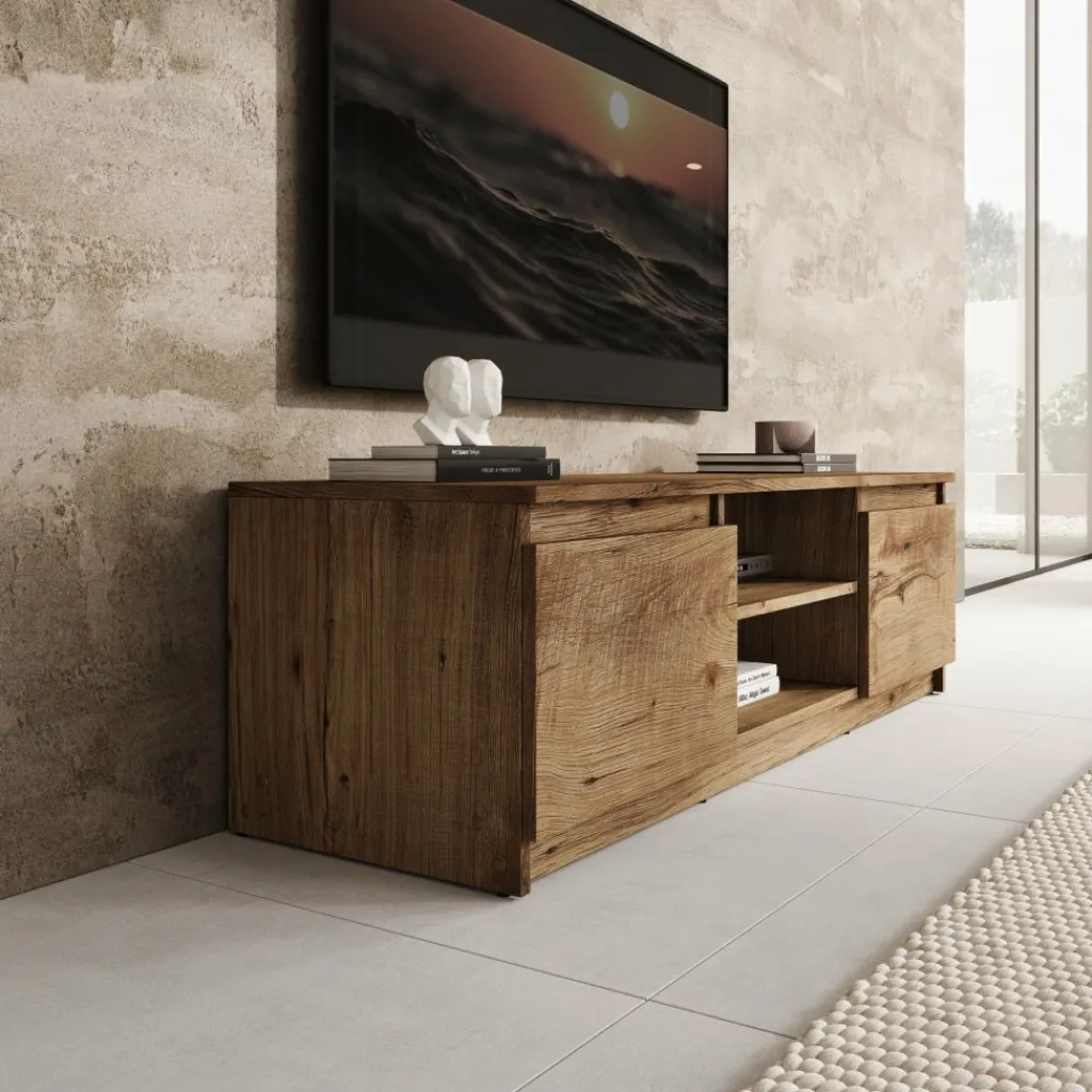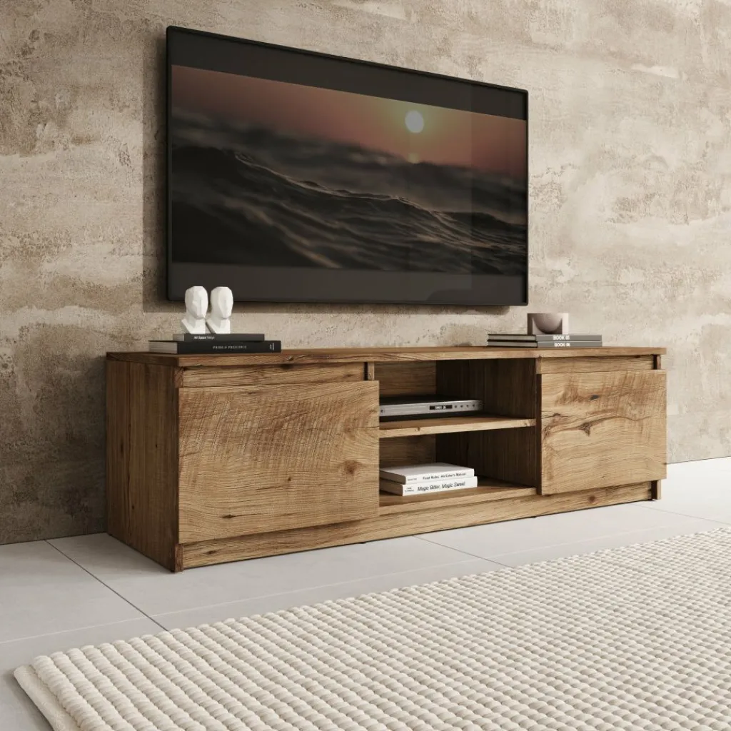Aan de voorzijde beschikt het tv-meubel over twee dichte deuren aan de linker- en rechterzijde. In het midden bevindt zich een open vak met een extra legplank, geschikt voor het plaatsen van media-apparatuur zoals een decoder, spelconsole of receiver. De open indeling maakt apparatuur direct toegankelijk zonder dat kabels in het zicht liggen.