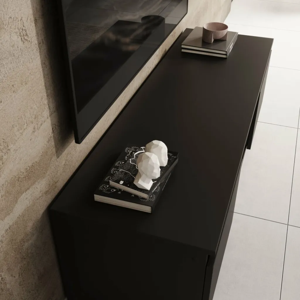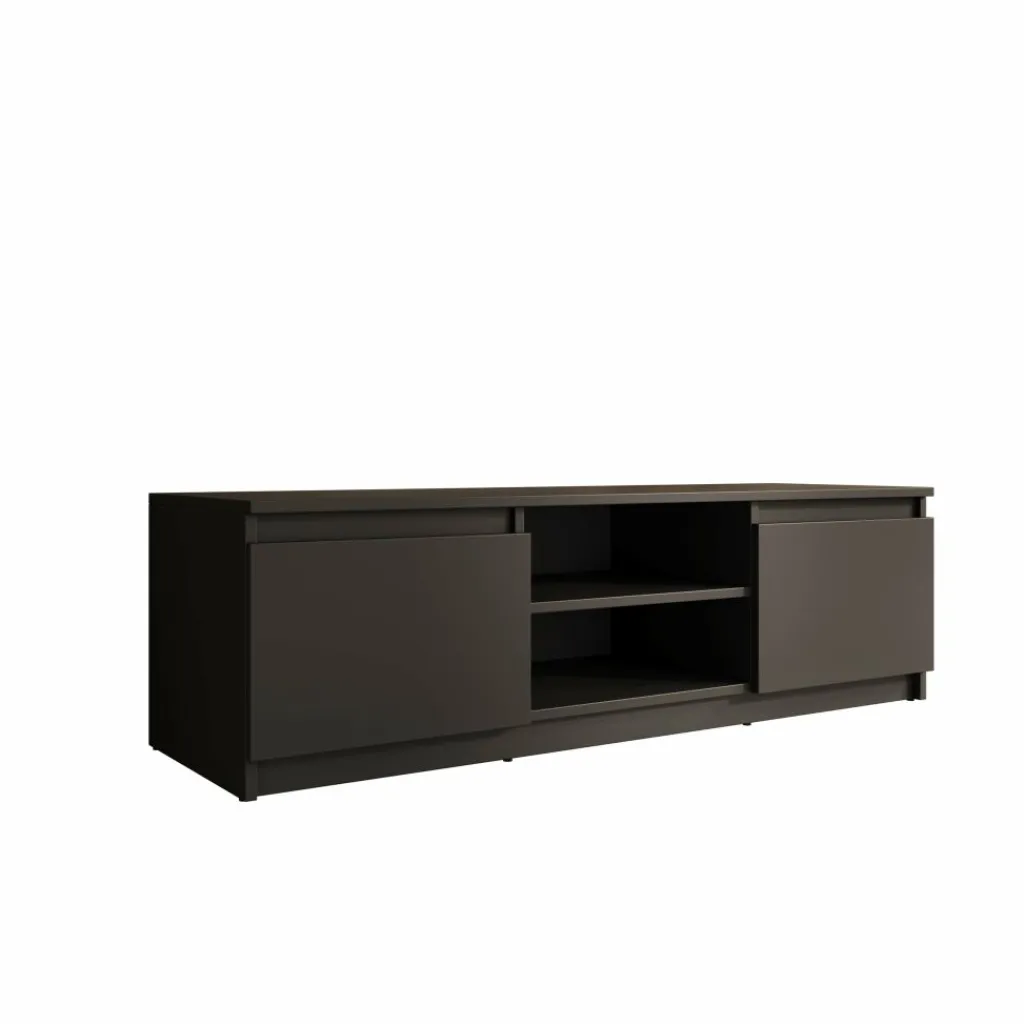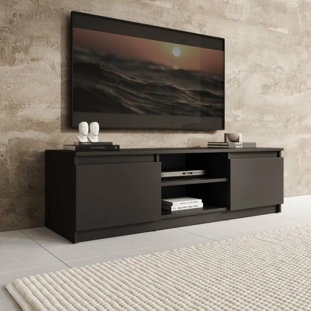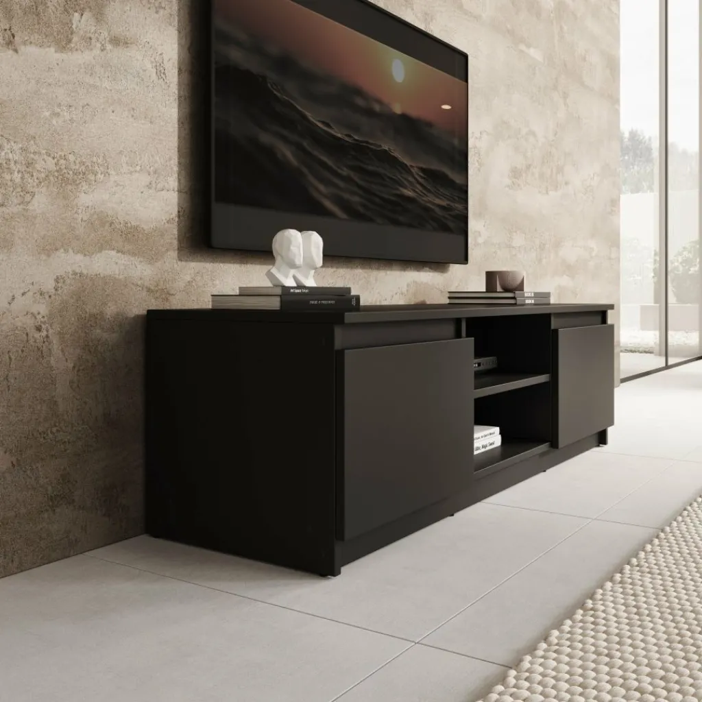 Diaz is geschikt voor gebruik in de woonkamer, slaapkamer of andere compacte ruimtes waar een functioneel tv-meubel gewenst is met een strakke, donkere afwerking.