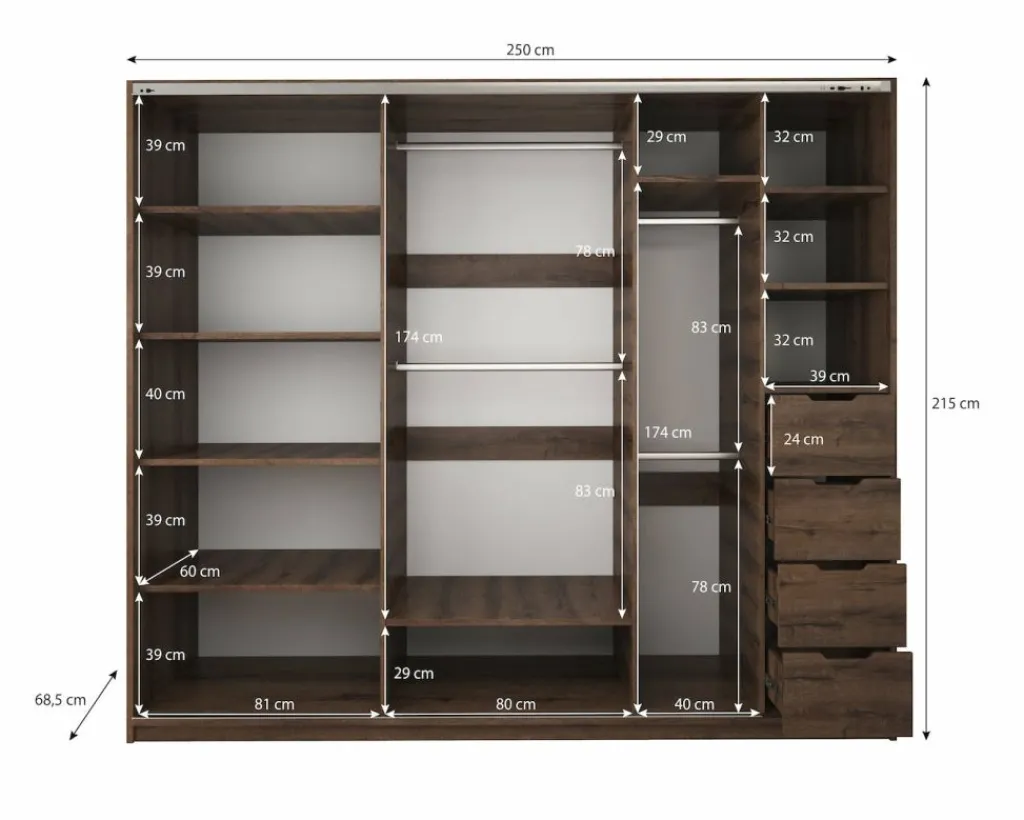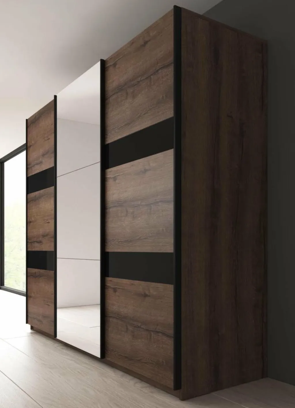 Garderobekast Diplo is een grote, praktische kledingkast uitgevoerd in eiken. De kledingkast beschikt over 3 schuifdeuren waardoor ruimte wordt bespaard. De middelste schuifdeur is een grote spiegel. Het binnenwerk beschikt over veel opbergruimte met 4 metalen stangen om kleding aan om te hangen. In de kast zitten ook 4 handige opberglades.