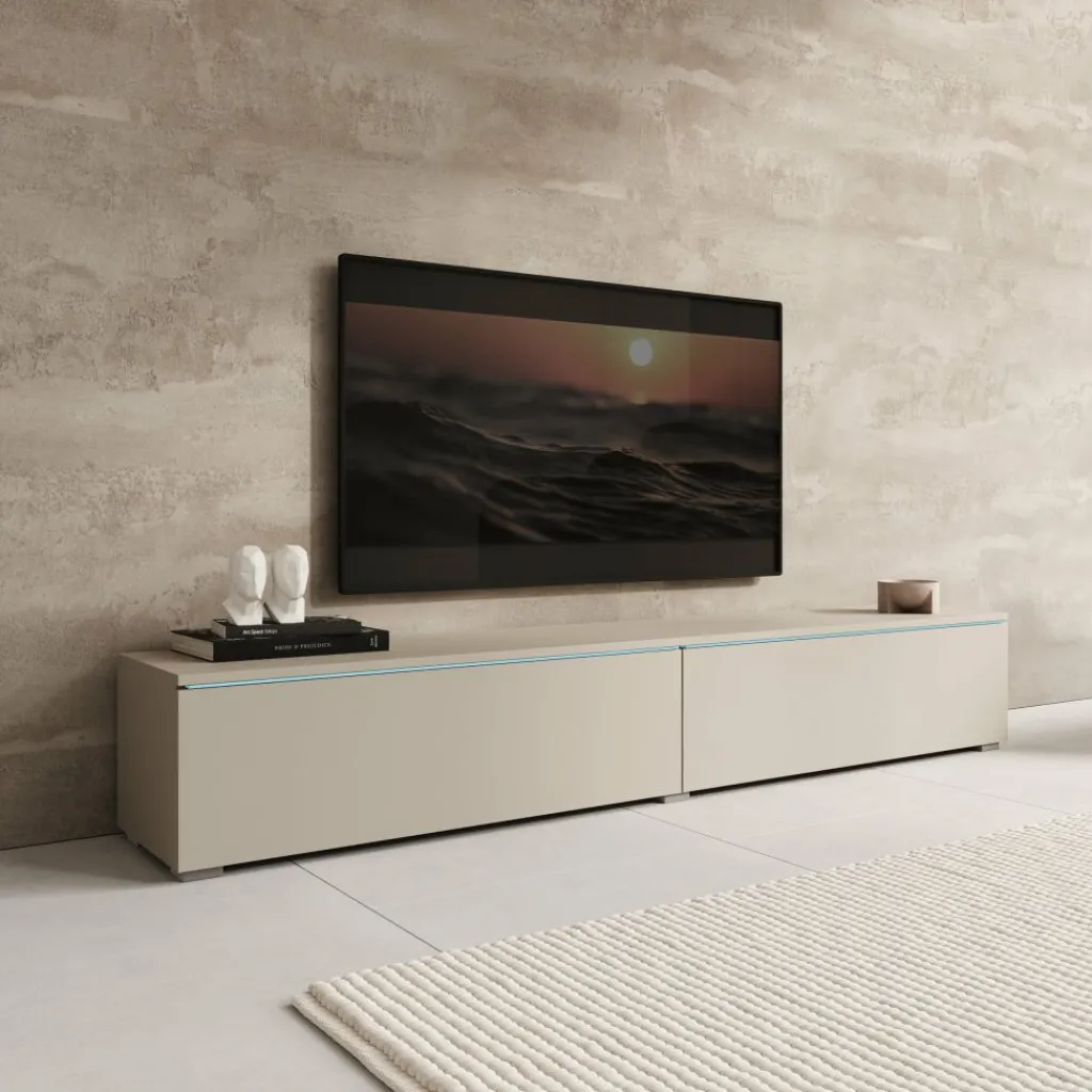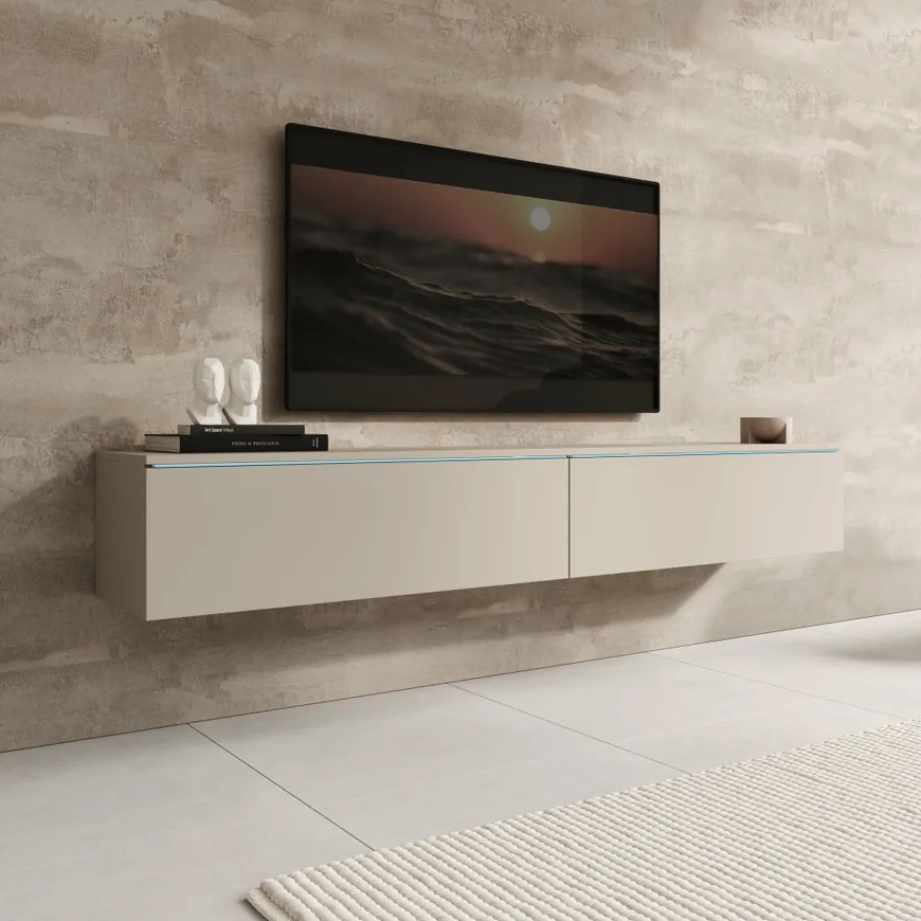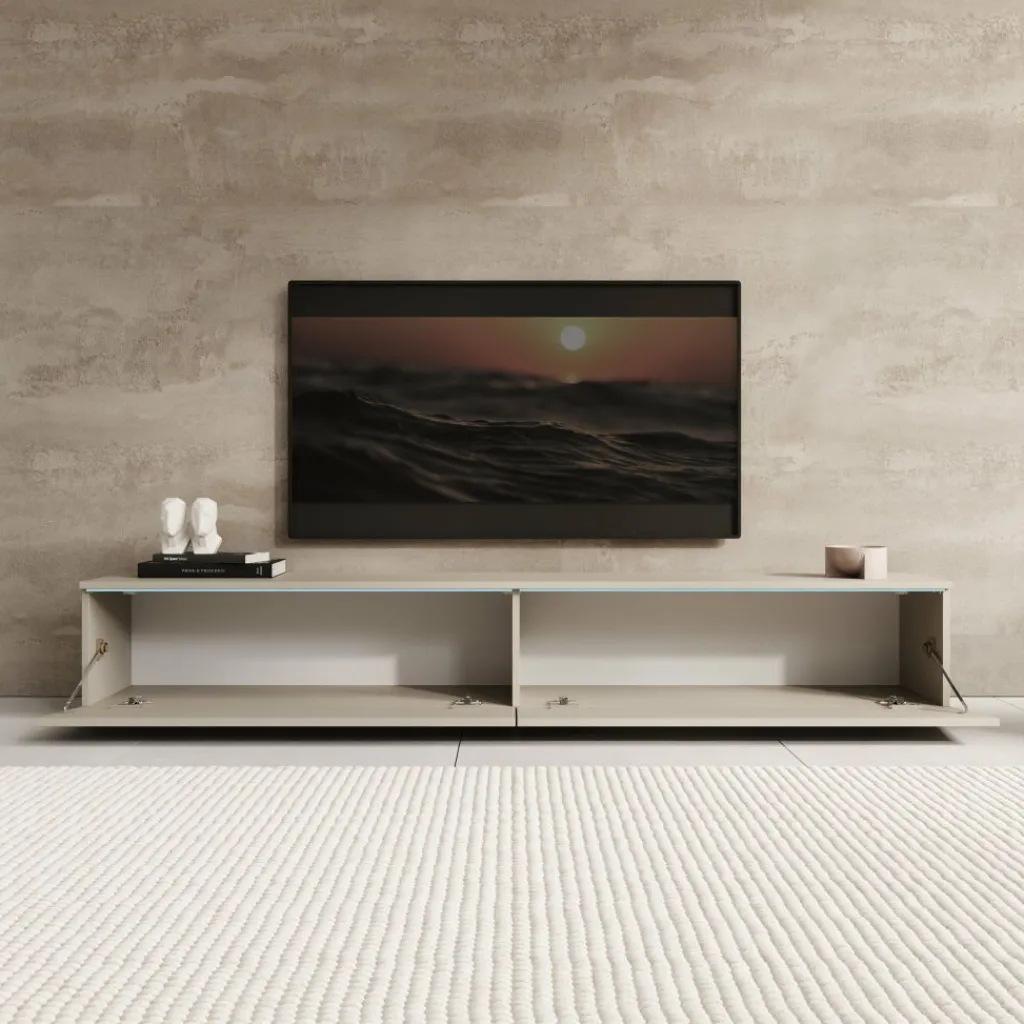 Het Dixon TV-meubel in beige heeft een strak en modern ontwerp dat goed aansluit bij verschillende woonstijlen. Boven de kleppen is LED-verlichting geïntegreerd, die een zachte gloed op de muur geeft en het meubel extra laat opvallen.