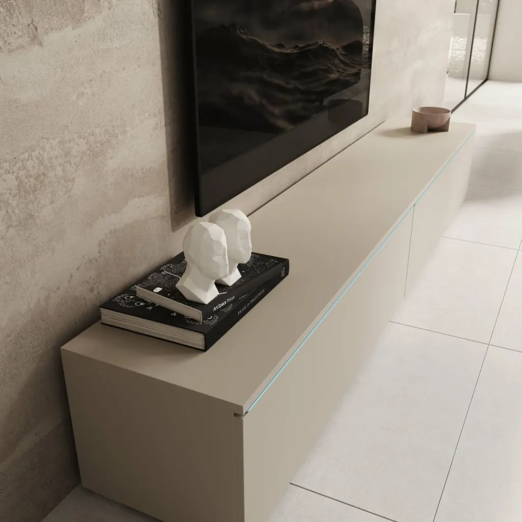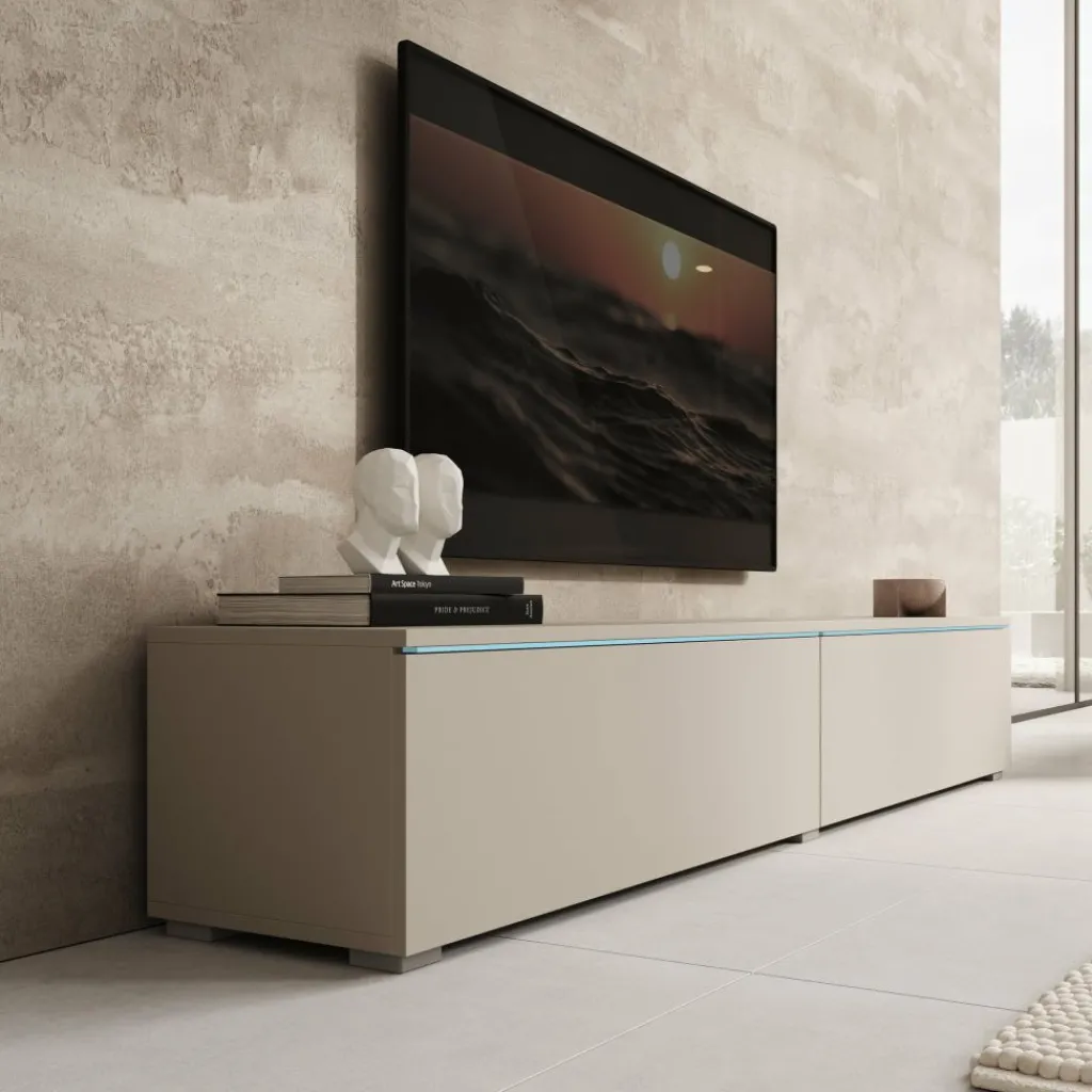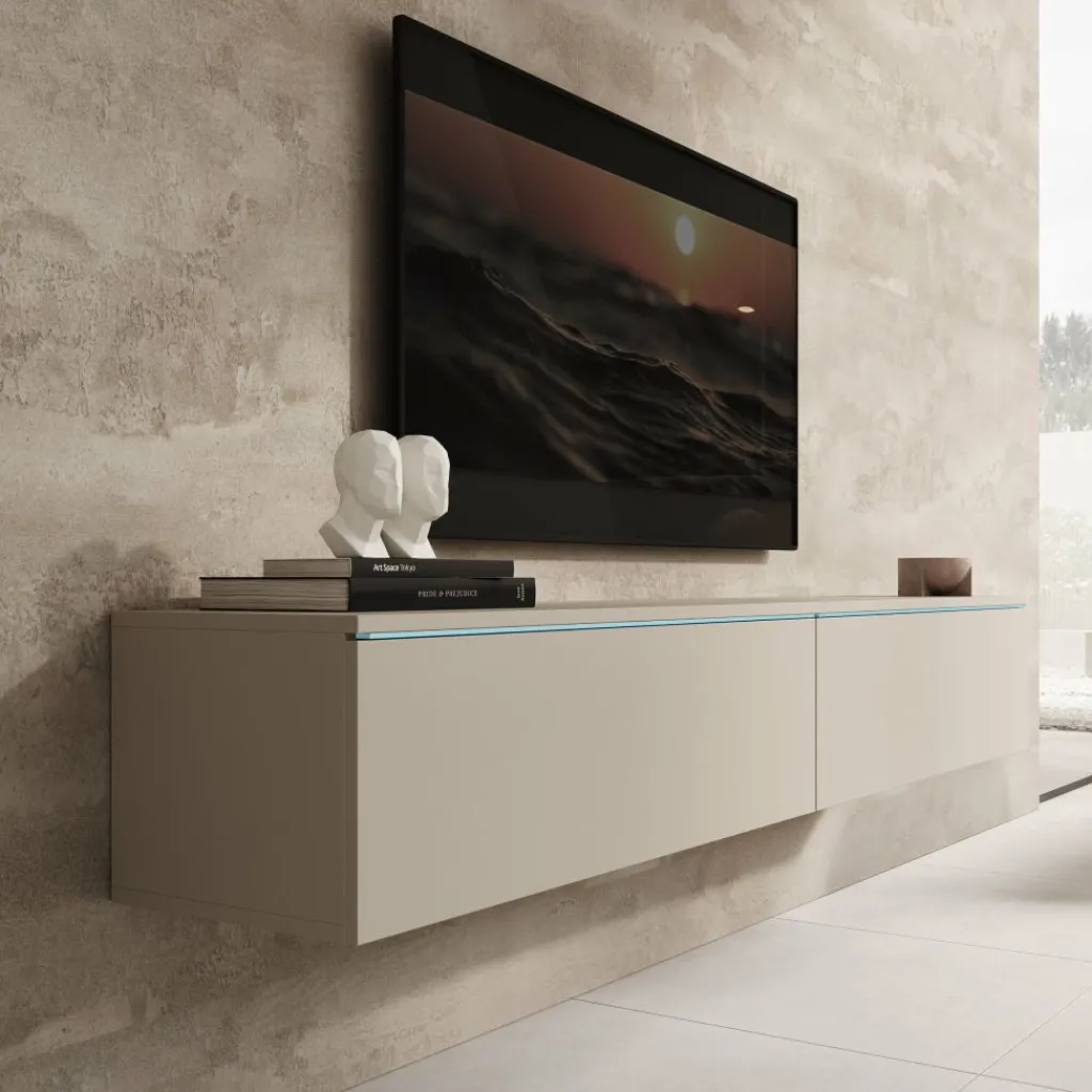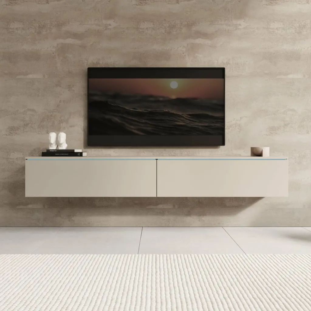 Het Dixon TV-meubel in beige heeft een strak en modern ontwerp dat goed aansluit bij verschillende woonstijlen. Boven de kleppen is LED-verlichting geïntegreerd, die een zachte gloed op de muur geeft en het meubel extra laat opvallen.