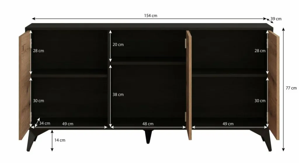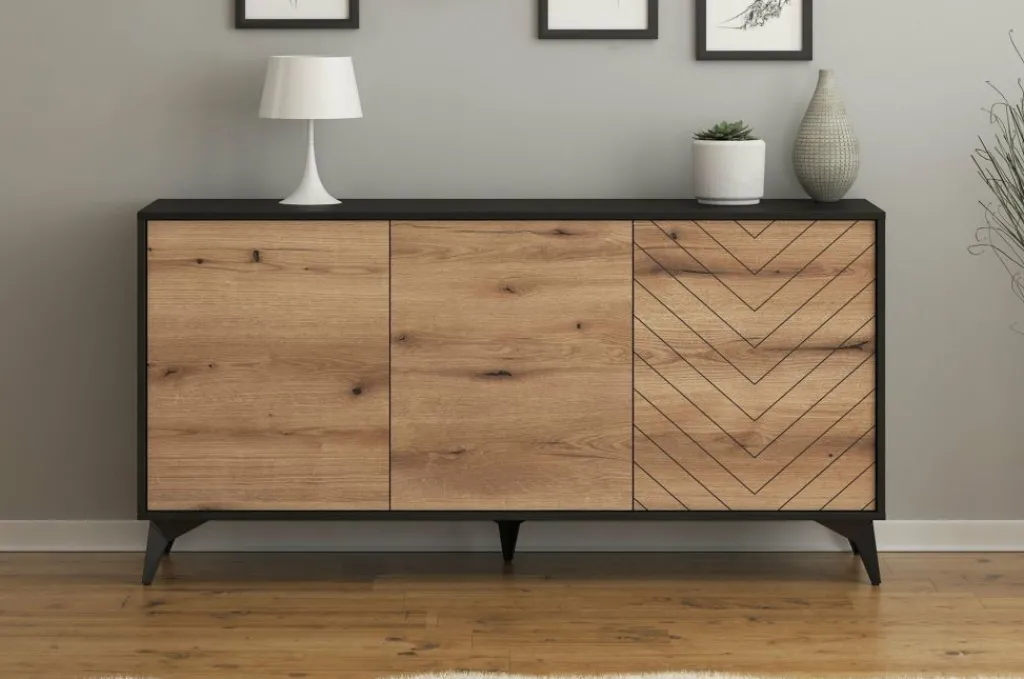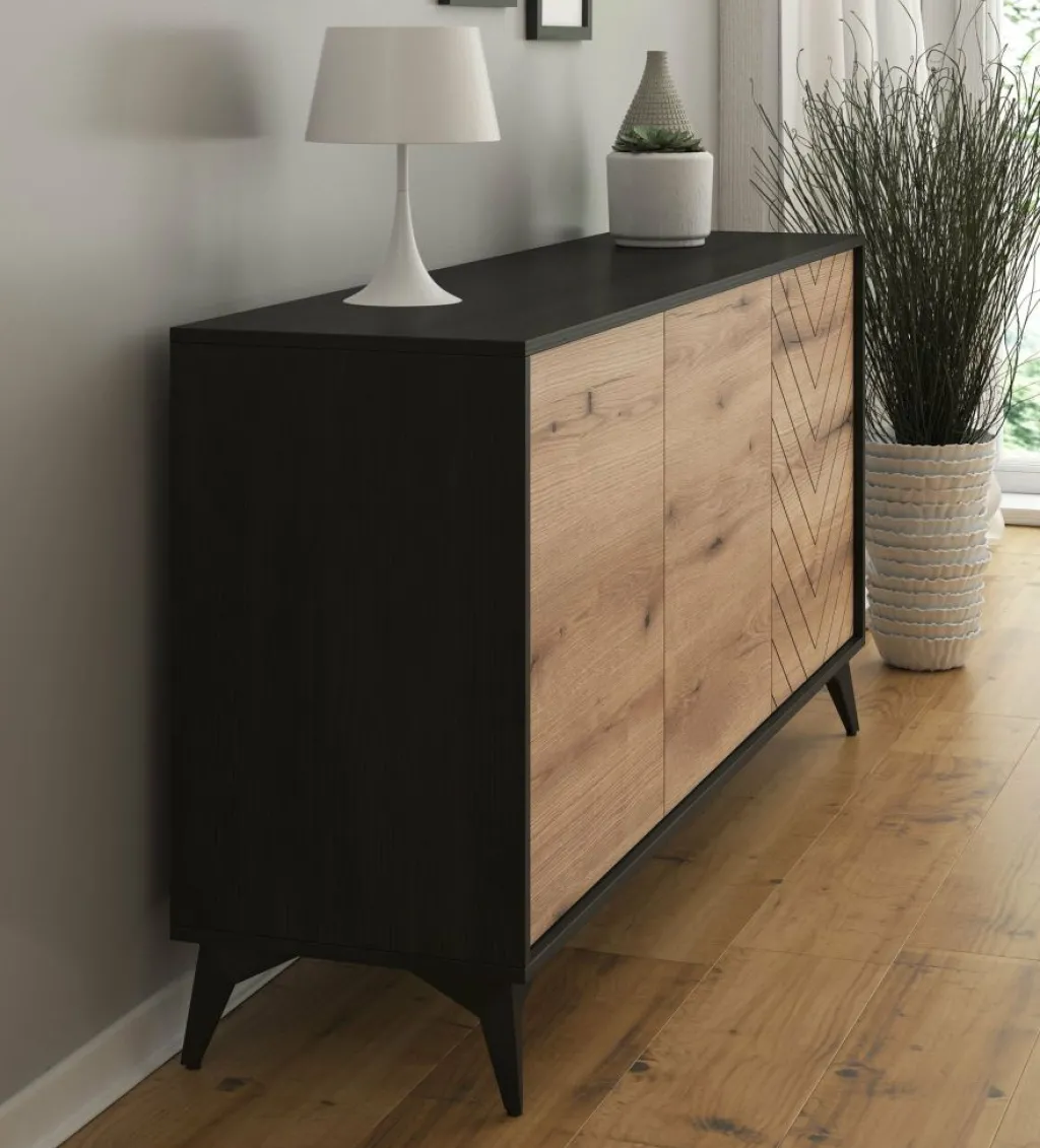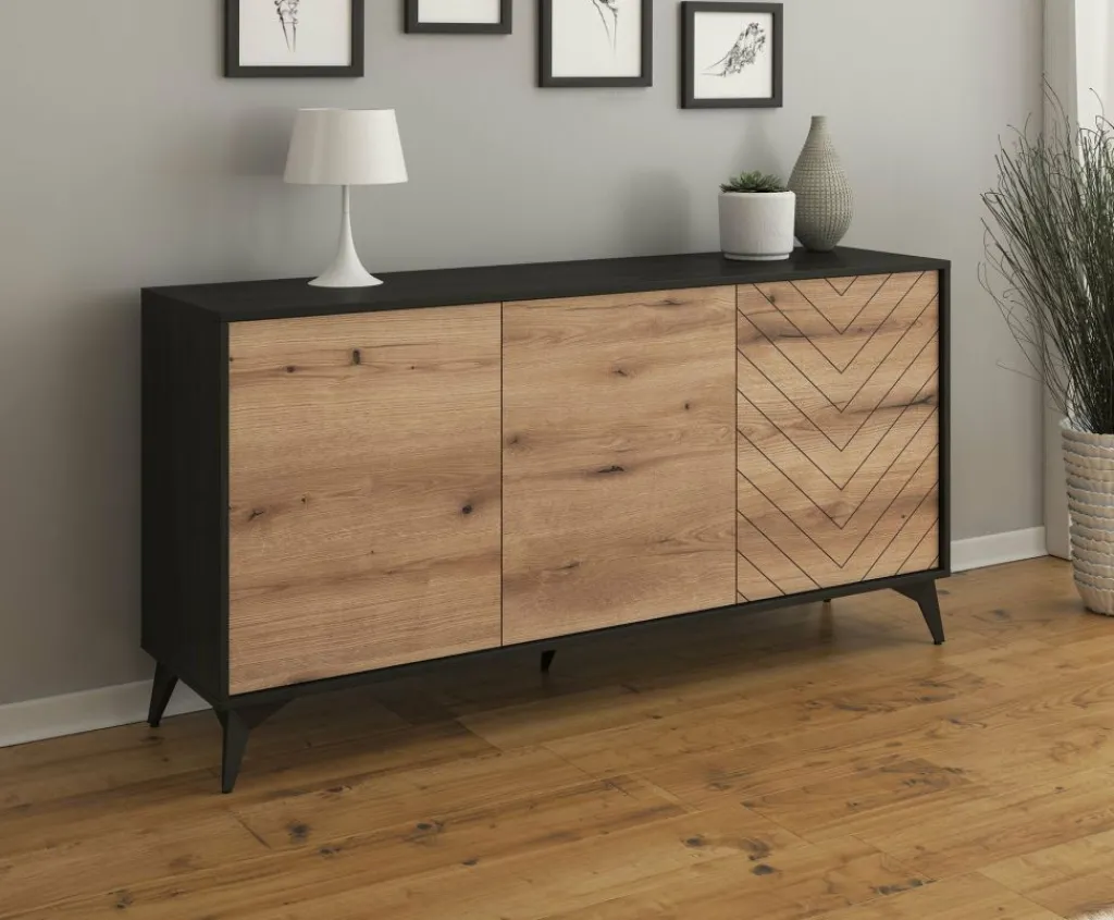 Dressoir Dolores is een moderne opbergkast, uitgevoerd in een eiken kleur met mat zwarte ombouw. De kast beschikt over drie deuren. Achter de deuren bevinden zich 6 opbergvakken. De kast staat op zwarte pootjes.