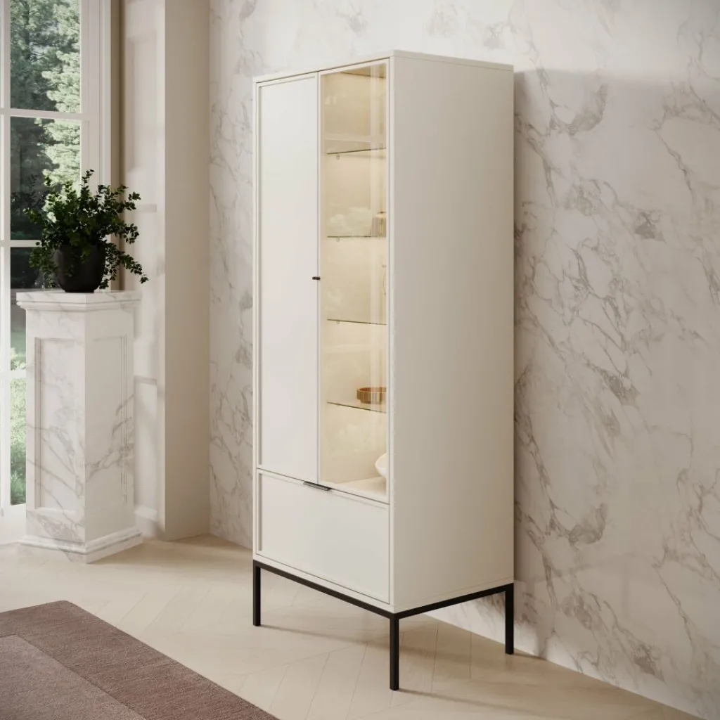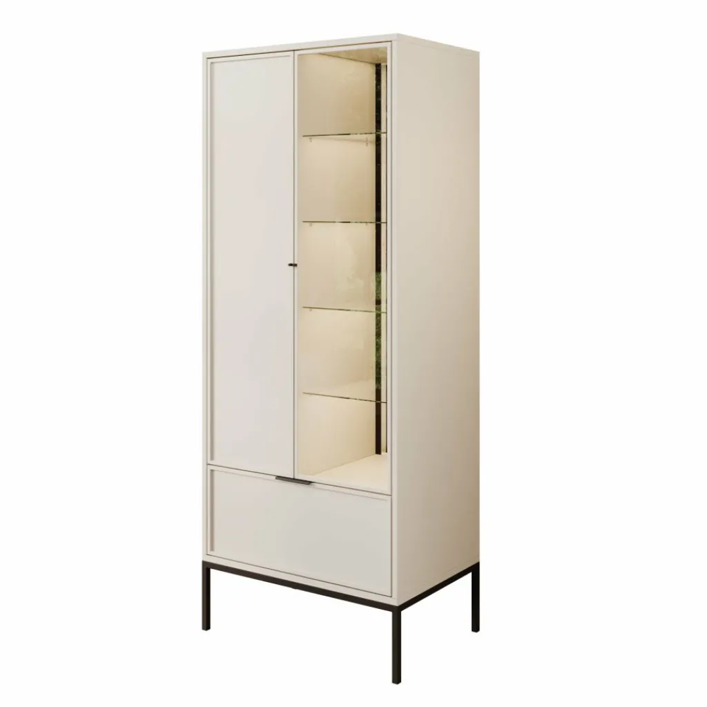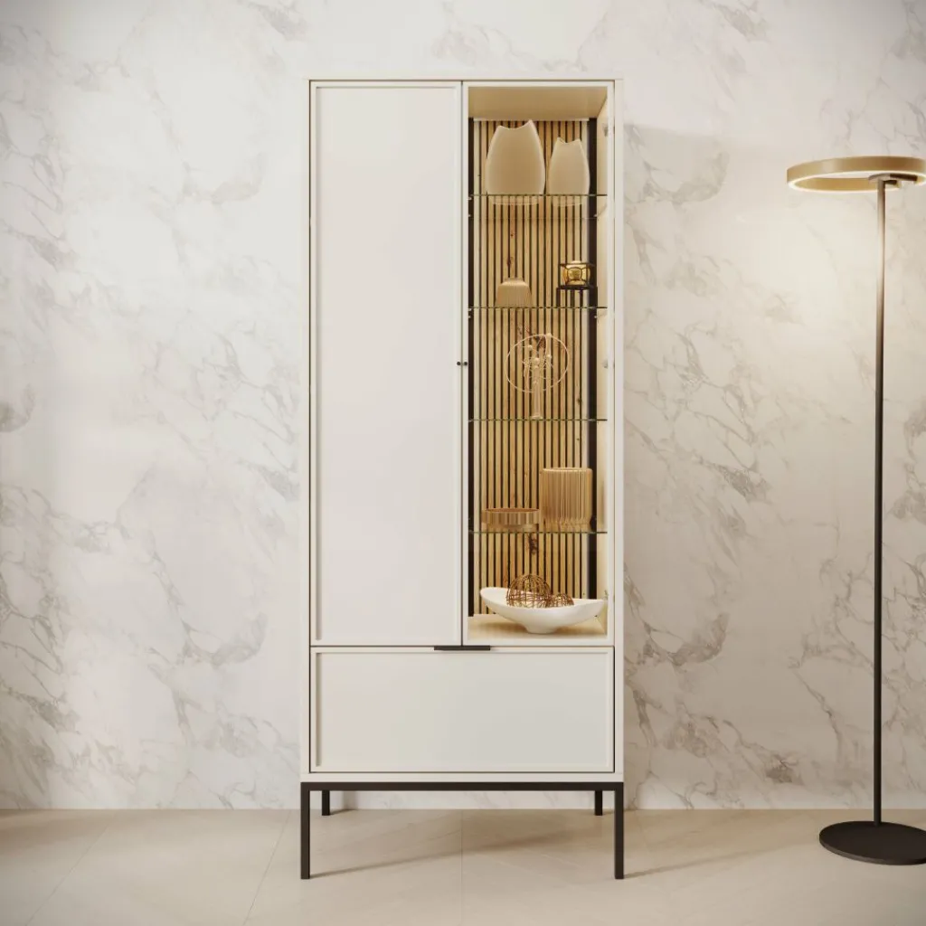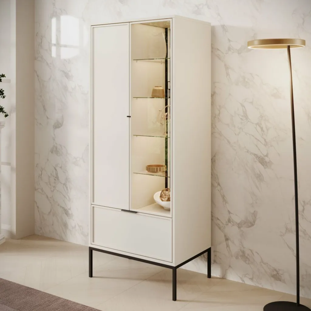 De vitrinekast biedt een combinatie van gesloten opbergruimte en een verlichte presentatieplek voor decoratieve items. Met een breedte van 76 cm, een diepte van 40 cm en een hoogte van 184 cm is dit meubel geschikt voor woonkamers, eetkamers of andere ruimtes waar je zowel wilt opbergen als presenteren.