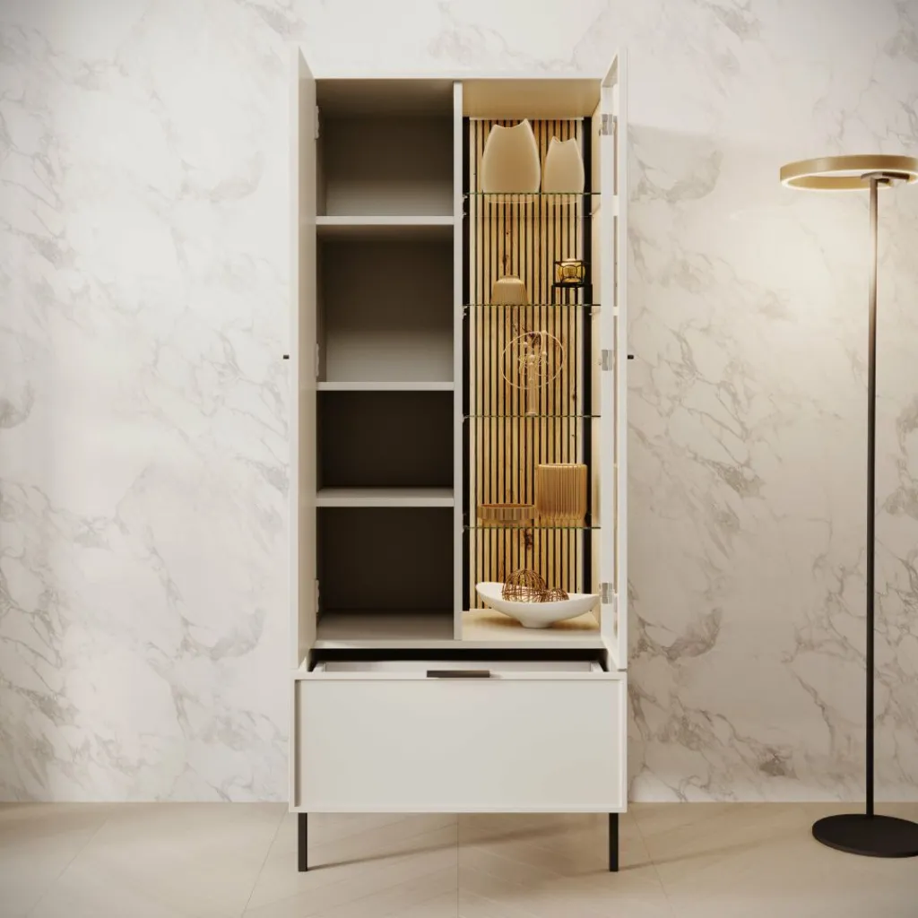 Achter de glazen deur bevinden zich meerdere glazen legplanken die geschikt zijn voor servies, decoratie of verzamelobjecten. De geïntegreerde LED-verlichting in dit vak zorgt ervoor dat de inhoud extra zichtbaar wordt en geeft een subtiel lichteffect in de kast. De verlichting is eenvoudig in en uit te schakelen via een voetdrukschakelaar. De achterwand van het vitrinedeel heeft een decoratief lattenpaneel waardoor de verlichting en de items in de kast extra opvallen.