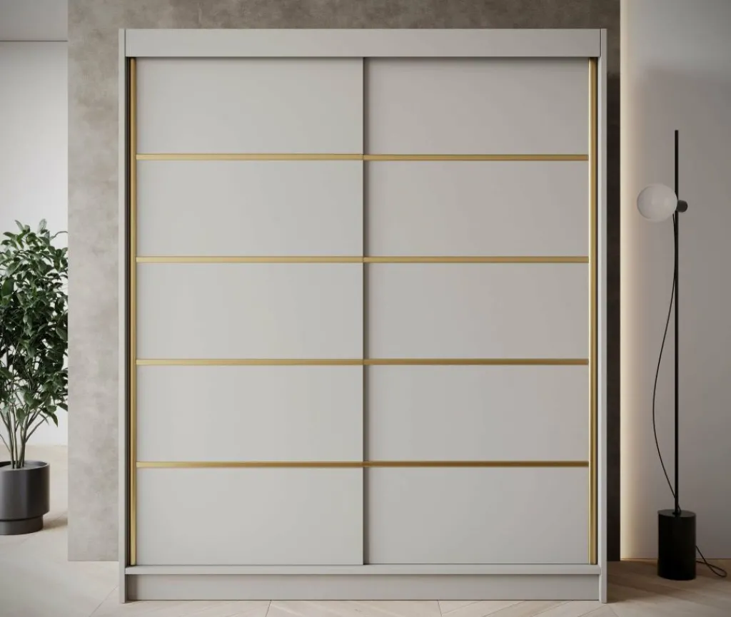 Kledingkast Eagle is een moderne garderobekast met ruime opbergmogelijkheden. Dit model is voorzien van 2 schuifdeuren. Deze hebben op de voorkant goudkleurige strepen. Verder is het meubel volledig uitgevoerd in beige. De binnenkant van de kast bestaat uit 6 opbergvakken en 1 kledingroede.