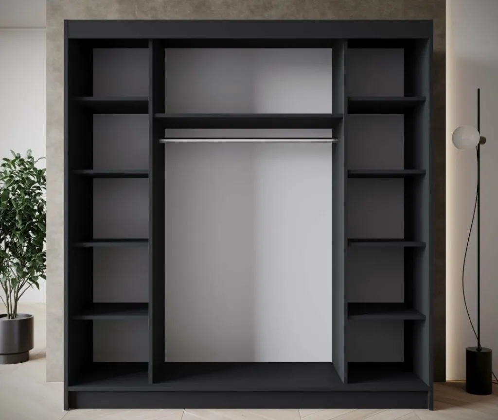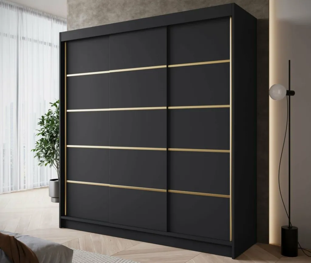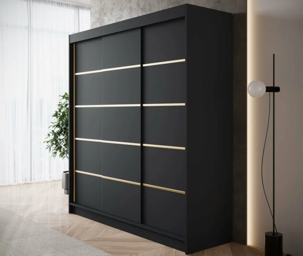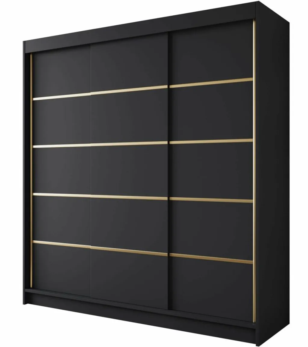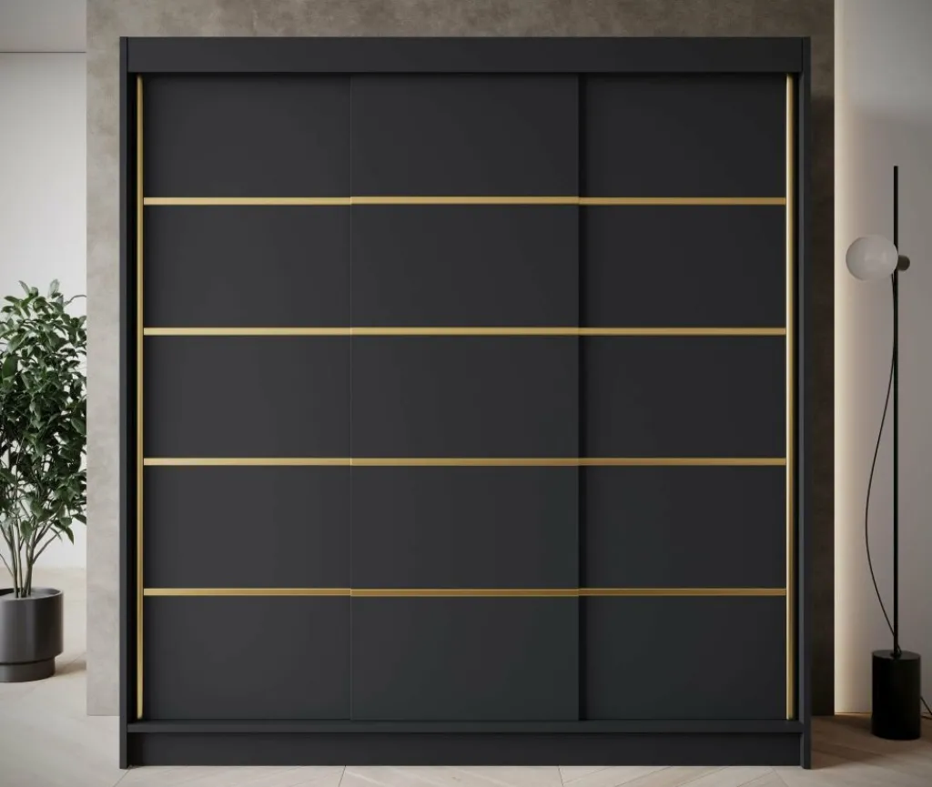 Kledingkast Eagle is een moderne garderobekast met ruime opbergmogelijkheden. Dit model is voorzien van 3 schuifdeuren. Deze hebben op de voorkant goudkleurige strepen. Verder is het meubel volledig uitgevoerd in mat zwart. De binnenkant van de kast bestaat uit 11 opbergvakken en 1 kledingroede.