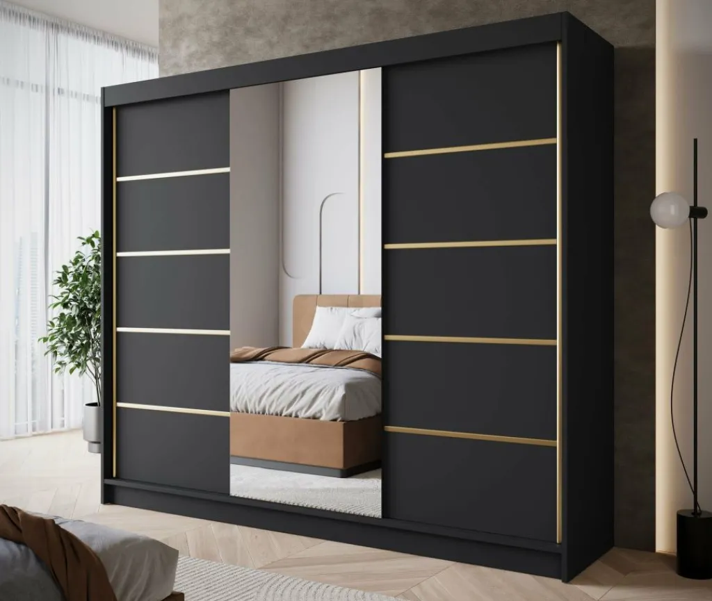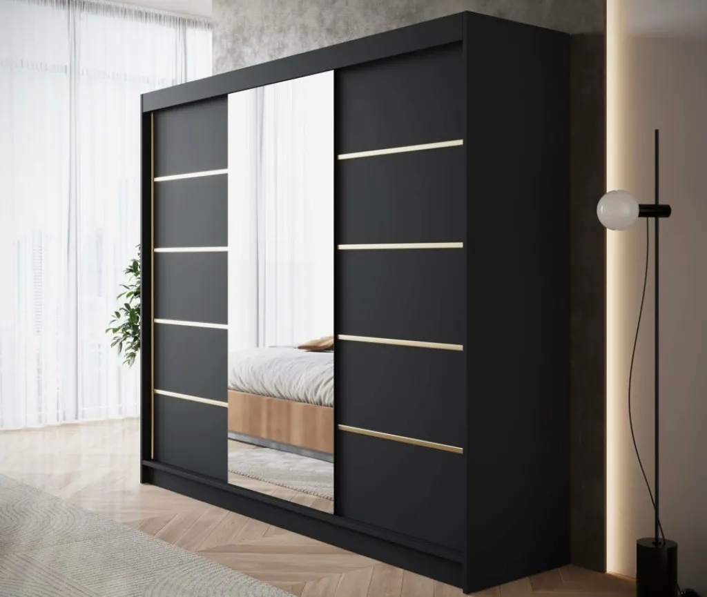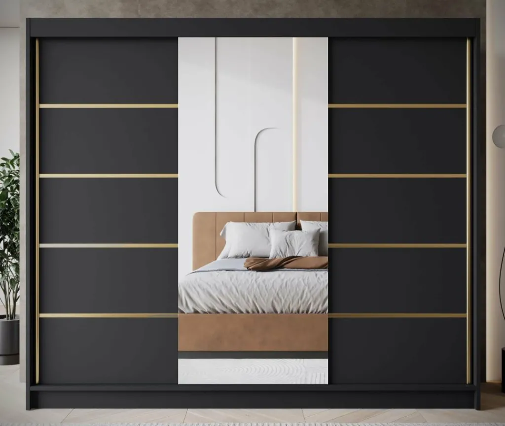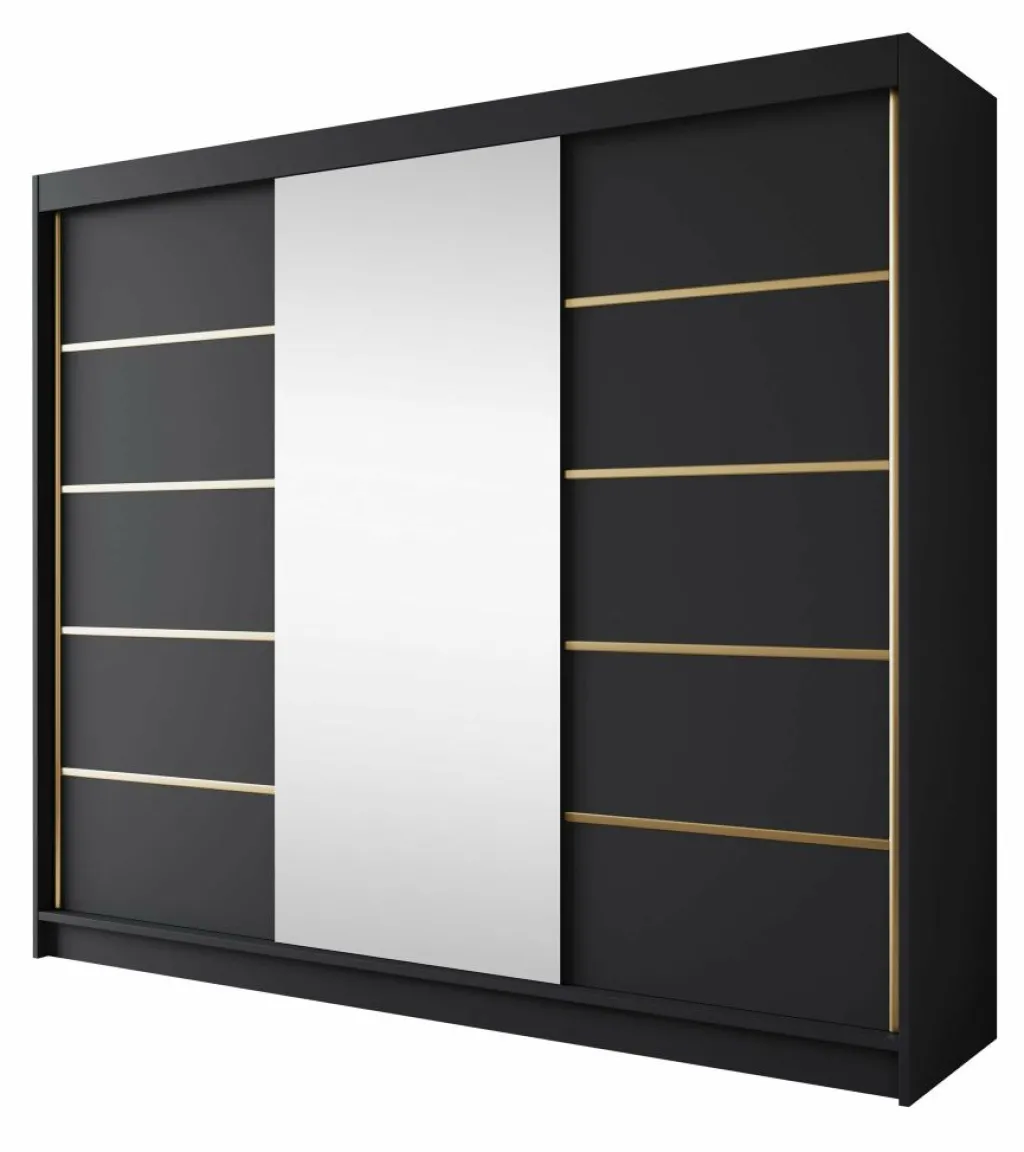 Kledingkast Eagle is een moderne garderobekast met ruime opbergmogelijkheden. Dit model is voorzien van 3 schuifdeuren waarvan de middelste een grote spiegel heeft. De linker- en rechter deur hebben goudkleurige strepen op de voorkant. Verder is het meubel volledig uitgevoerd in mat zwart. De binnenkant van de kast bestaat uit 11 opbergvakken en 1 kledingroede.
