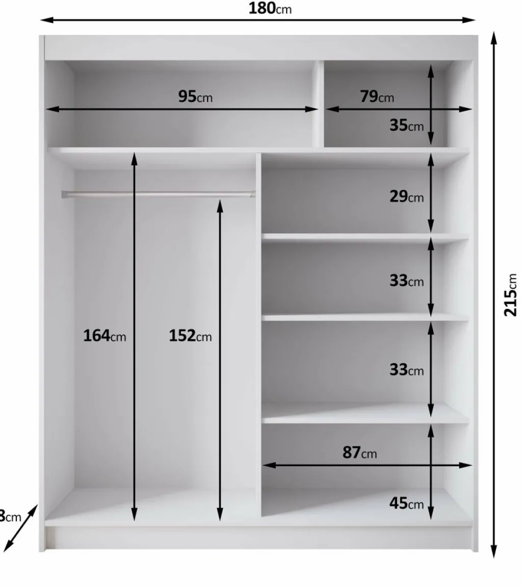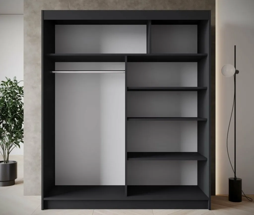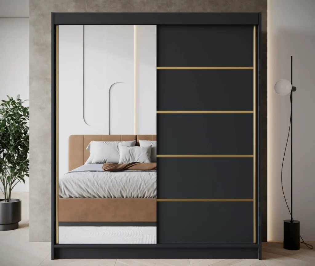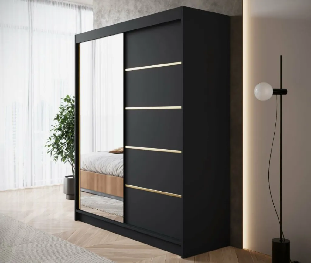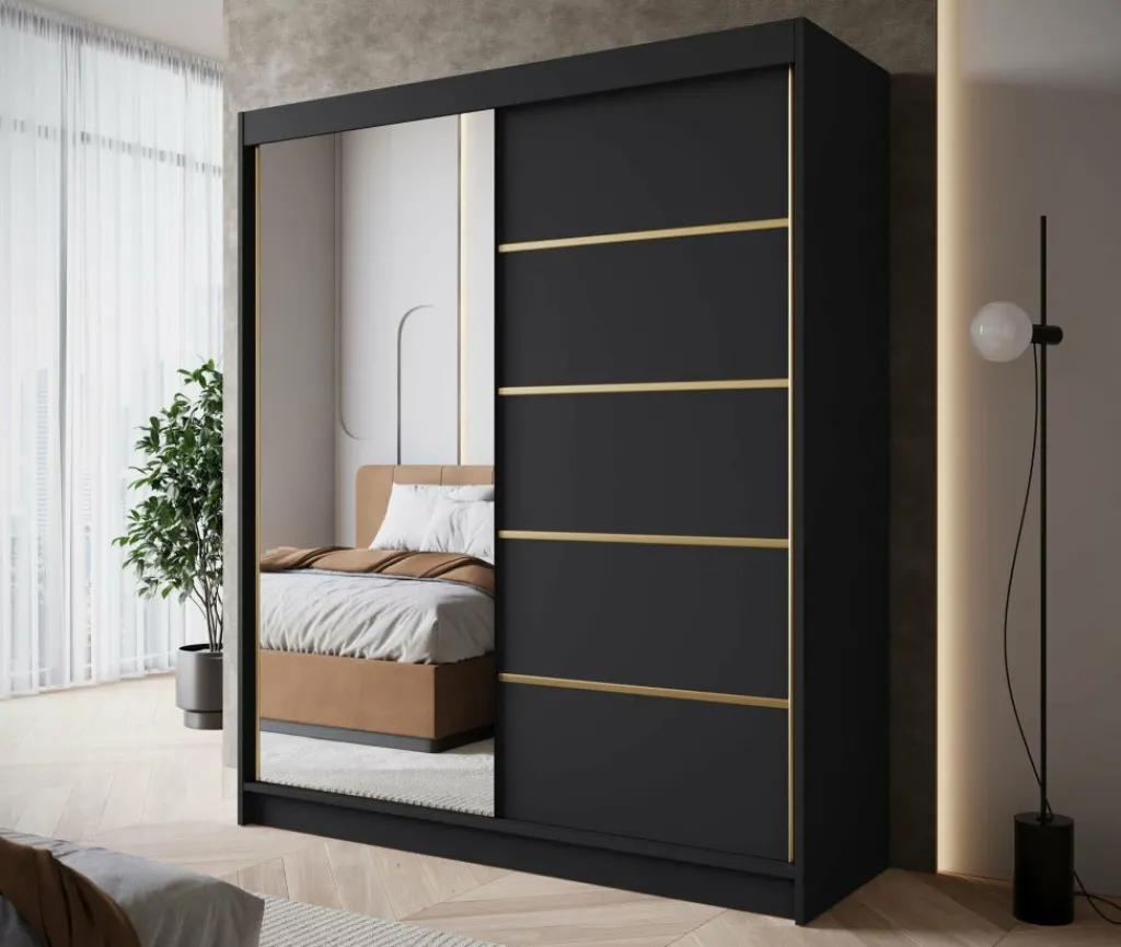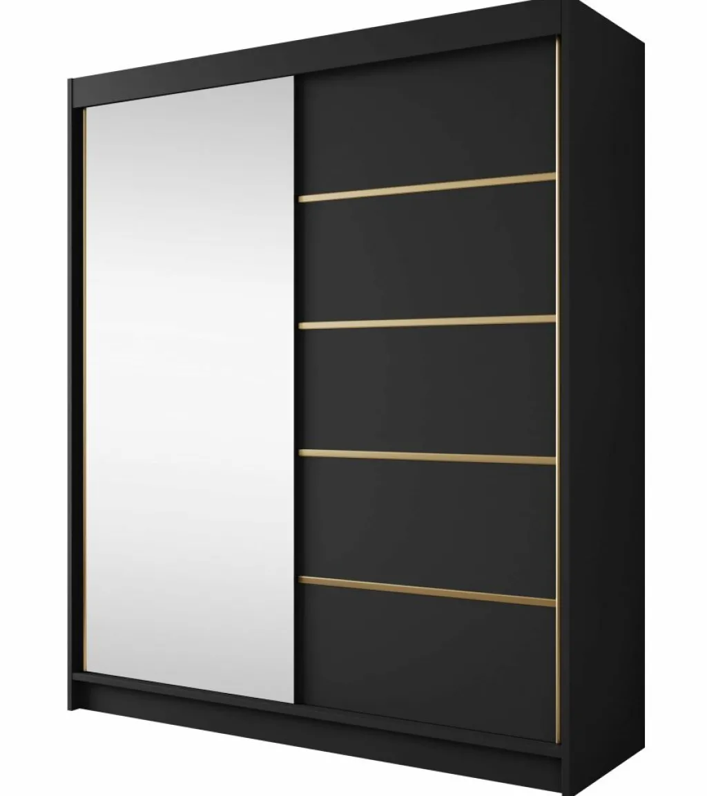Kledingkast Eagle is een moderne garderobekast met ruime opbergmogelijkheden. Dit model is voorzien van 2 schuifdeuren waarvan de linkerdeur een spiegel heeft. De rechterdeur heeft goudkleurige strepen. Verder is het meubel volledig uitgevoerd in mat zwart. De binnenkant van de kast bestaat uit 6 opbergvakken en 1 kledingroede.