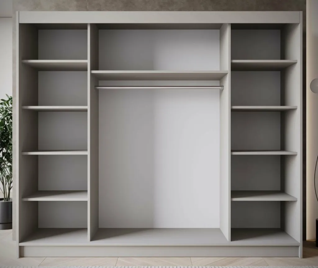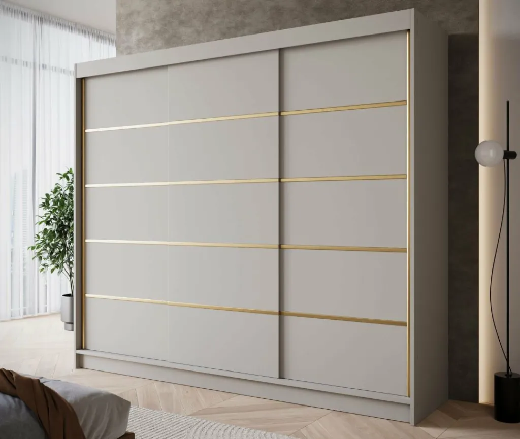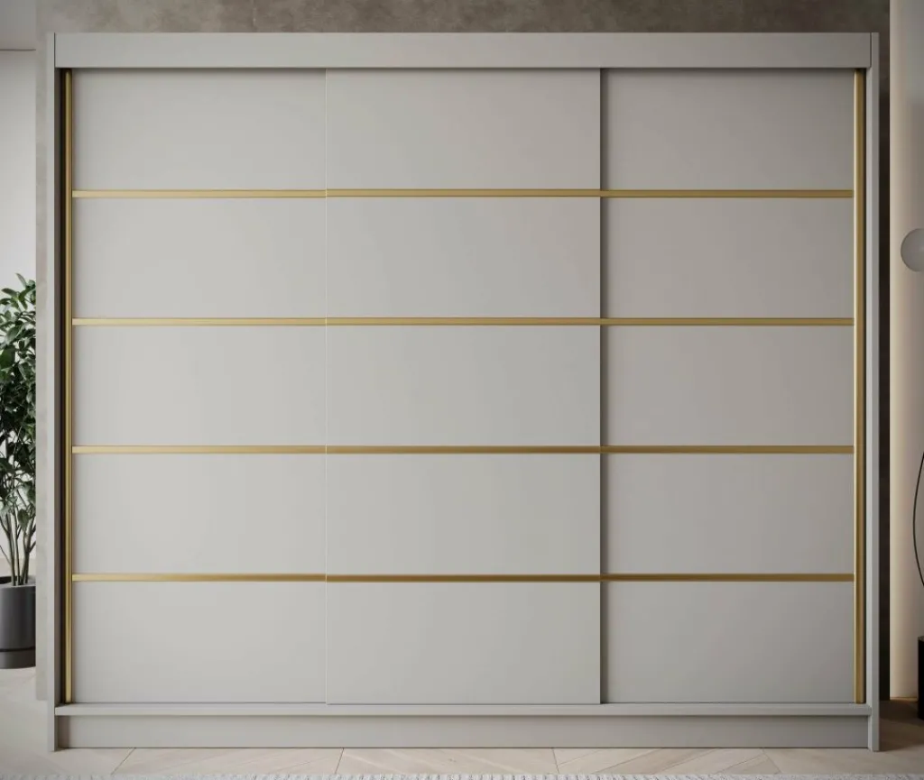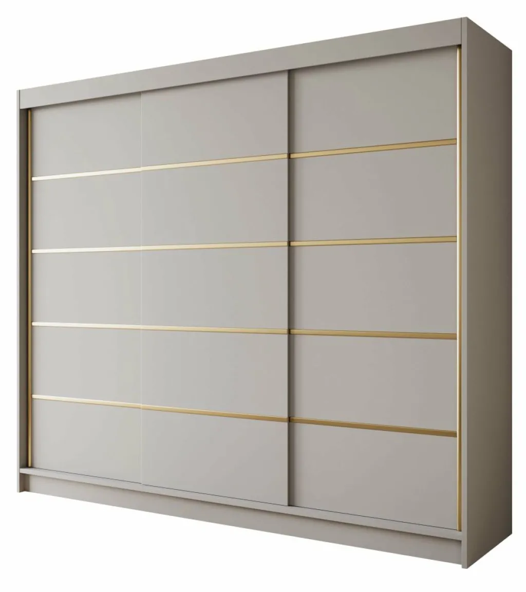 Kledingkast Eagle is een moderne garderobekast met ruime opbergmogelijkheden. Dit model is voorzien van 3 schuifdeuren. Deze hebben op de voorkant goudkleurige strepen. Verder is het meubel volledig uitgevoerd in beige. De binnenkant van de kast bestaat uit 11 opbergvakken en 1 kledingroede.