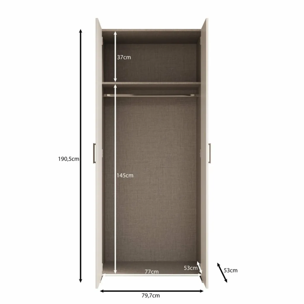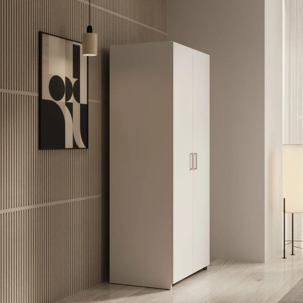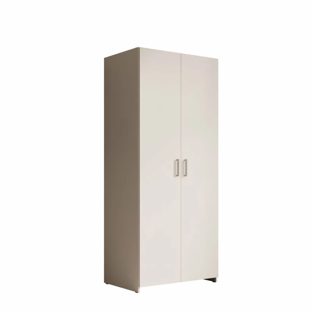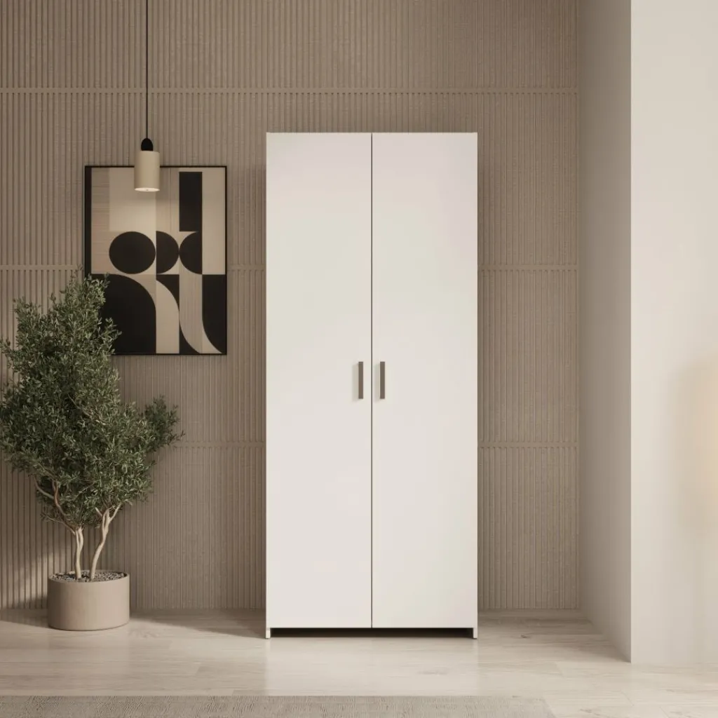 Elario kledingkast is een staande 2-deurs kast voor de slaapkamer of hal, uitgevoerd in wit. De kast heeft een breedte van 80 cm, een diepte van 54 cm en een hoogte van 191 cm en biedt een praktische opbergoplossing voor kleding en accessoires.