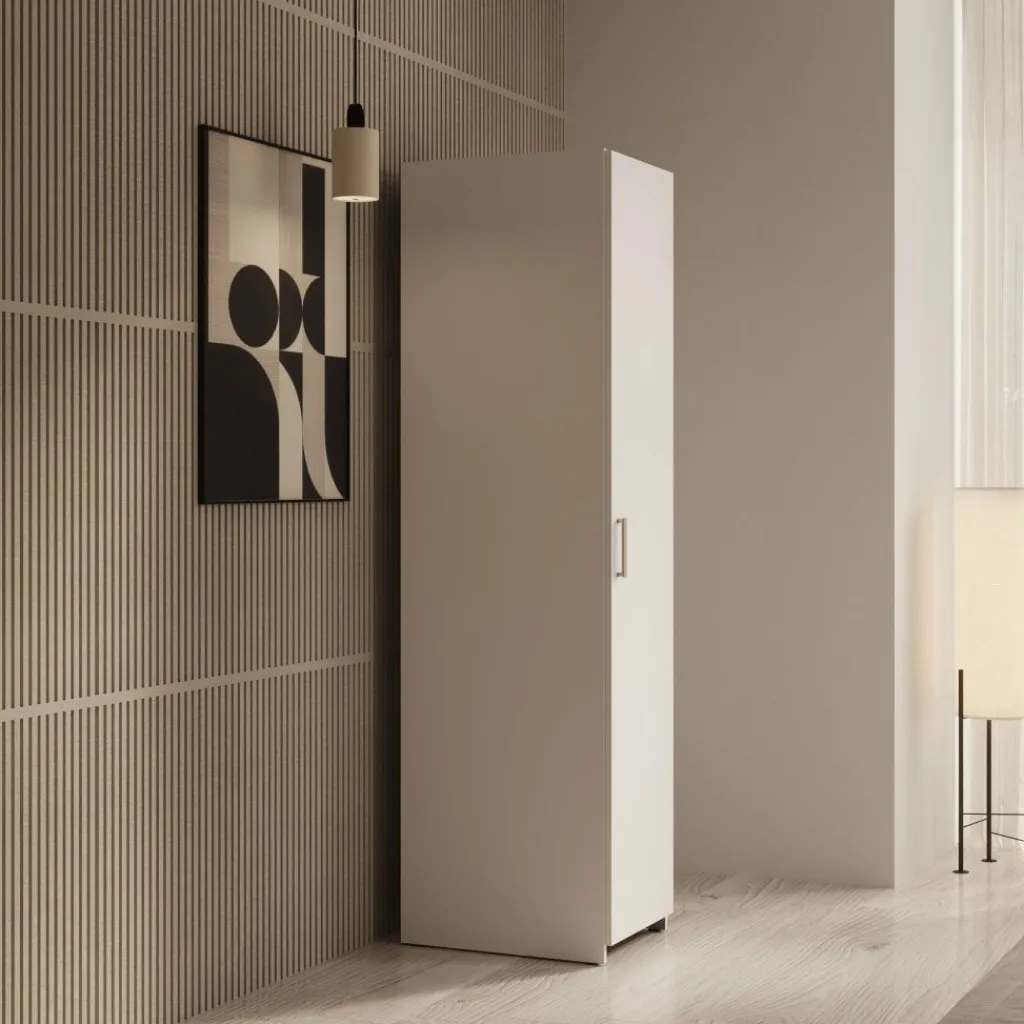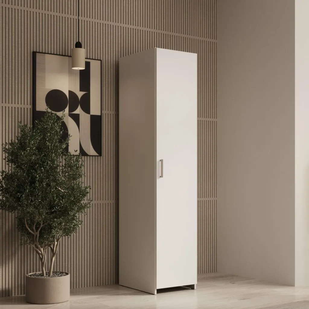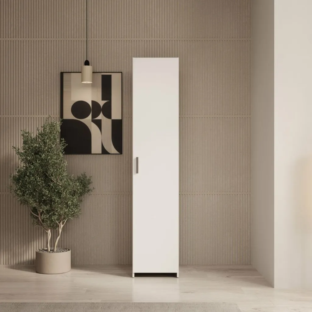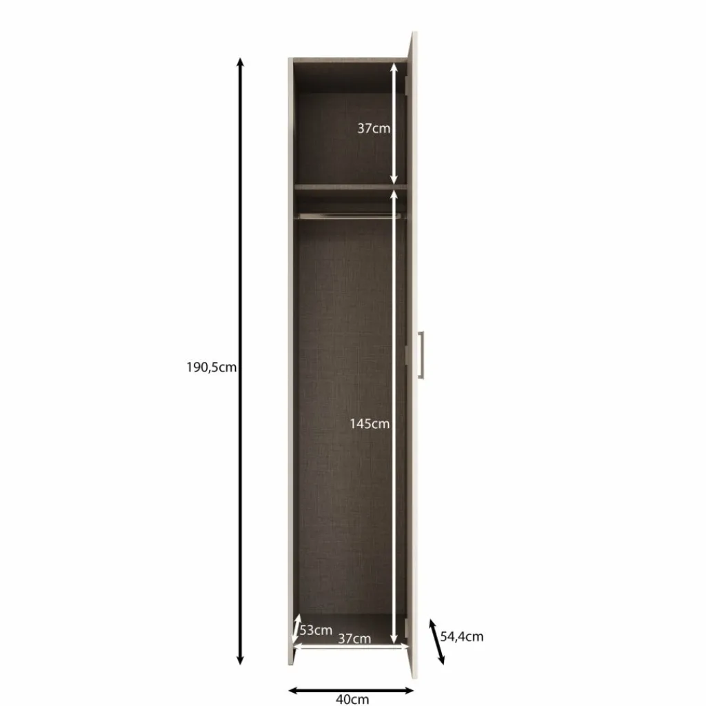 Elario kledingkast is een staande 1-deurs kast voor de slaapkamer of hal, uitgevoerd in wit. De kast heeft een breedte van 40 cm, een diepte van 54 cm en een hoogte van 191 cm en is bedoeld voor het overzichtelijk opbergen van kleding in kleinere ruimtes.