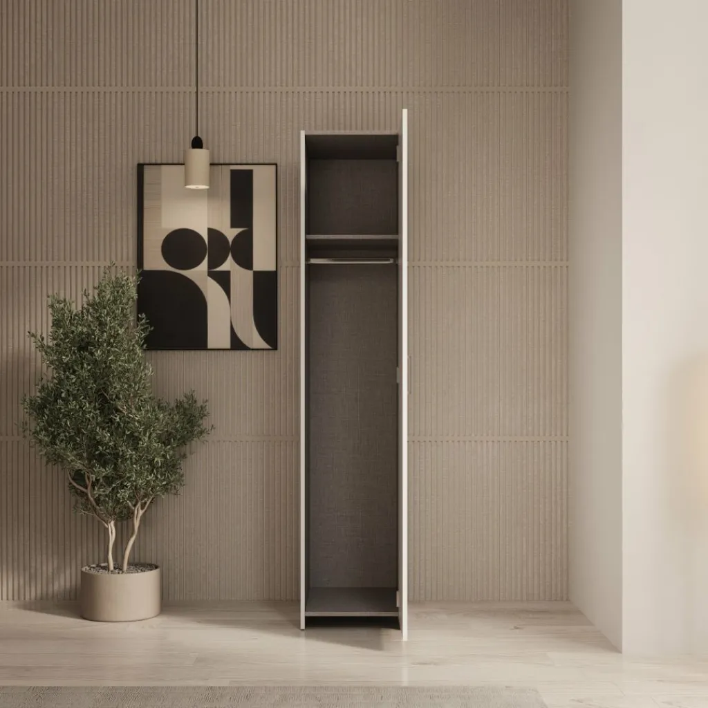 De kledingkast is gemaakt van spaanplaat en staat op lage pootjes. Door het slanke formaat is Elario goed te plaatsen in smalle kamers, logeerkamers of gangen waar je toch een volwaardige opbergoplossing nodig hebt.
