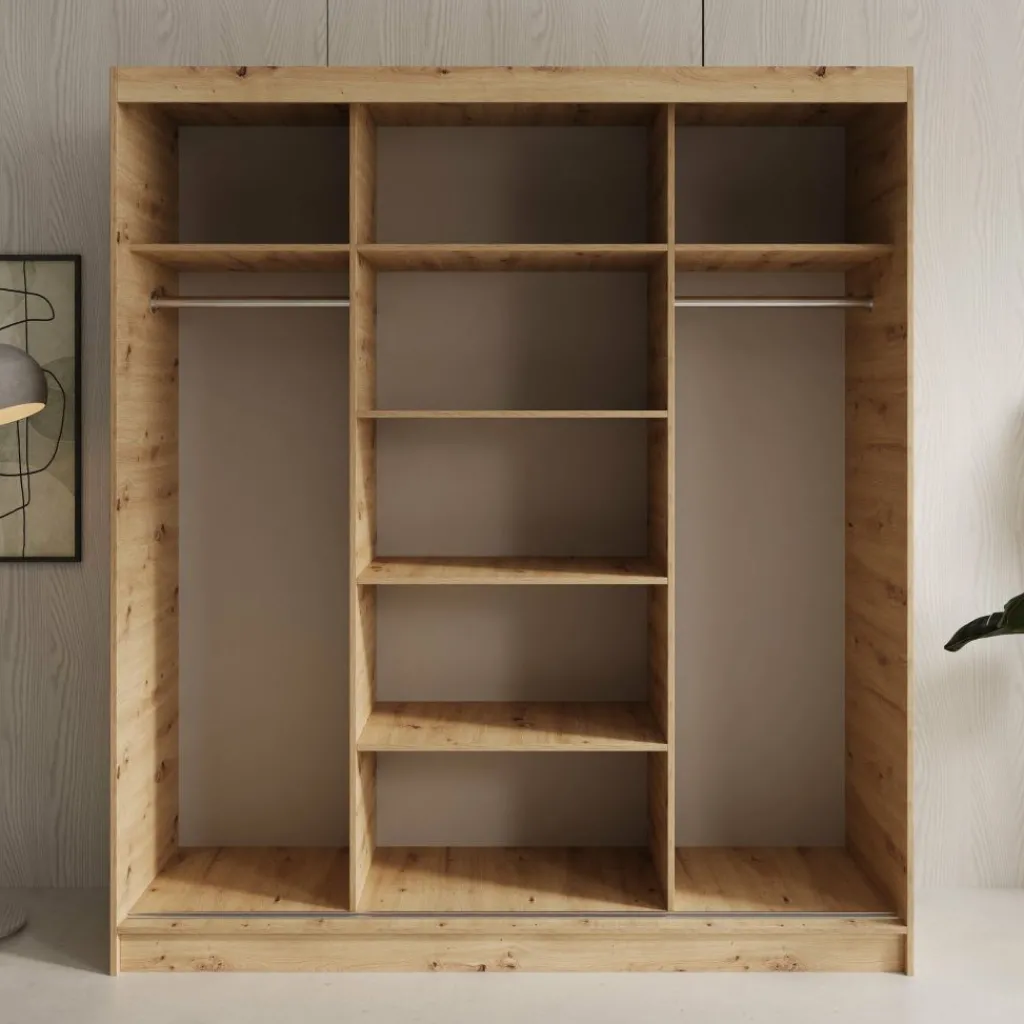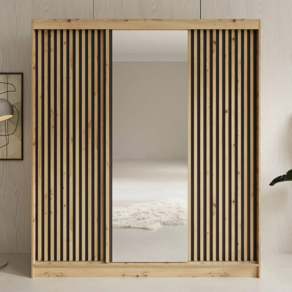 De Elles kledingkast met 3 schuifdeuren is een stijlvolle en praktische toevoeging aan elke slaapkamer. De warme eiken afwerking en verticale lattenstructuur geven het ontwerp een moderne, natuurlijke uitstraling, terwijl de spiegeldeur zorgt voor extra licht en een ruimtelijk gevoel in de kamer.