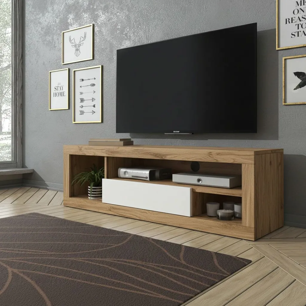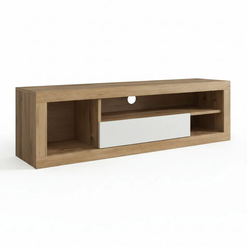 De Elyse is een strak TV-meubel dat de combinatie van eikenpatroon en wit op een rustige manier samenbrengt. Het warme eikenpatroon en de witte klap geven het meubel karakter zonder dat het te zwaar oogt.