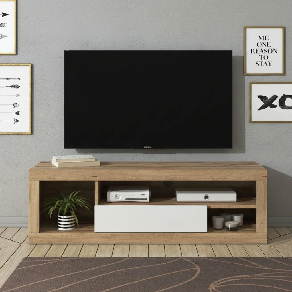 Overzichtelijke opbergruimte Het meubel heeft een groot open vak aan de linkerzijde en twee kleinere vakken rechts, ideaal voor een mediaspeler, spelconsole of decoratie. De witte valdeur in het midden verbergt extra opbergruimte netjes uit het zicht. Achter in het meubel zit een kabelgat zodat kabels netjes weggewerkt kunnen worden.