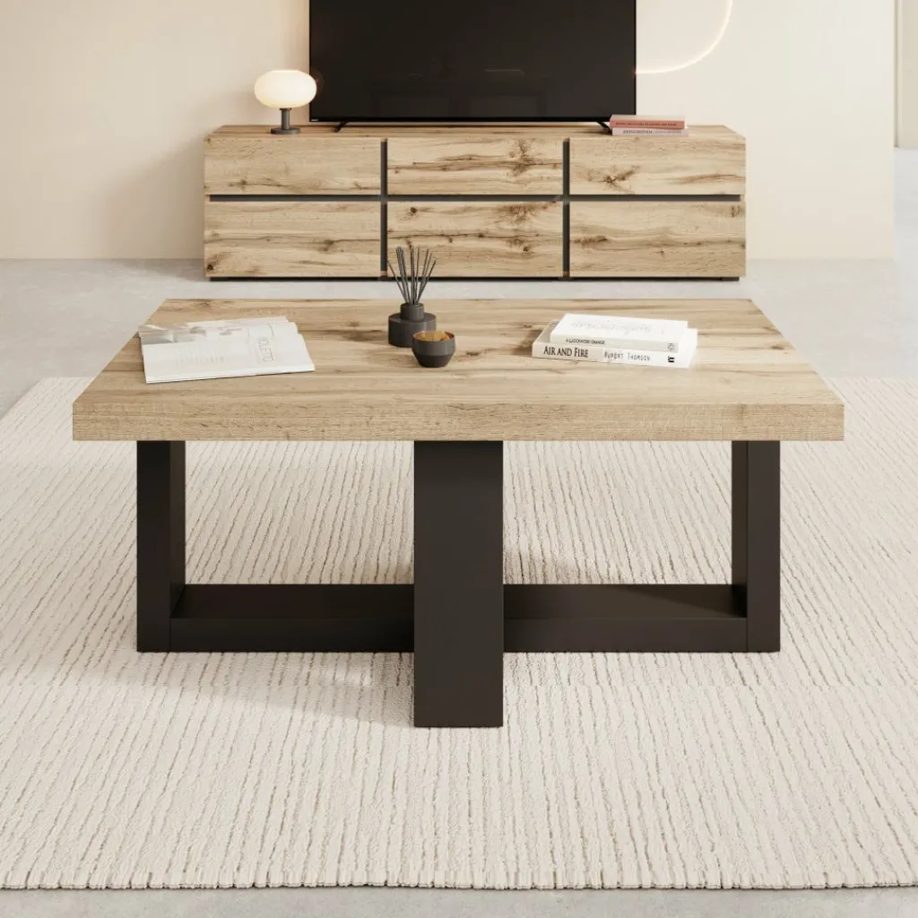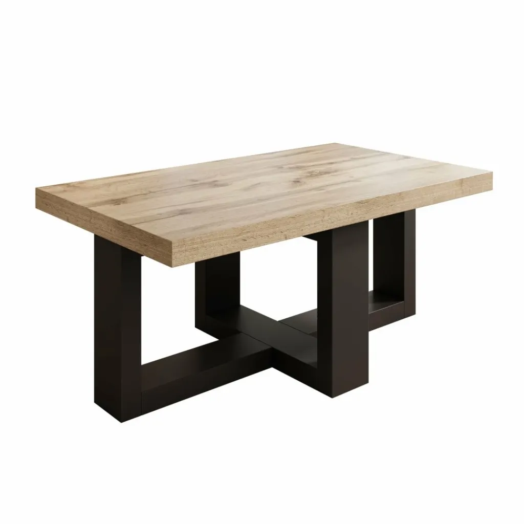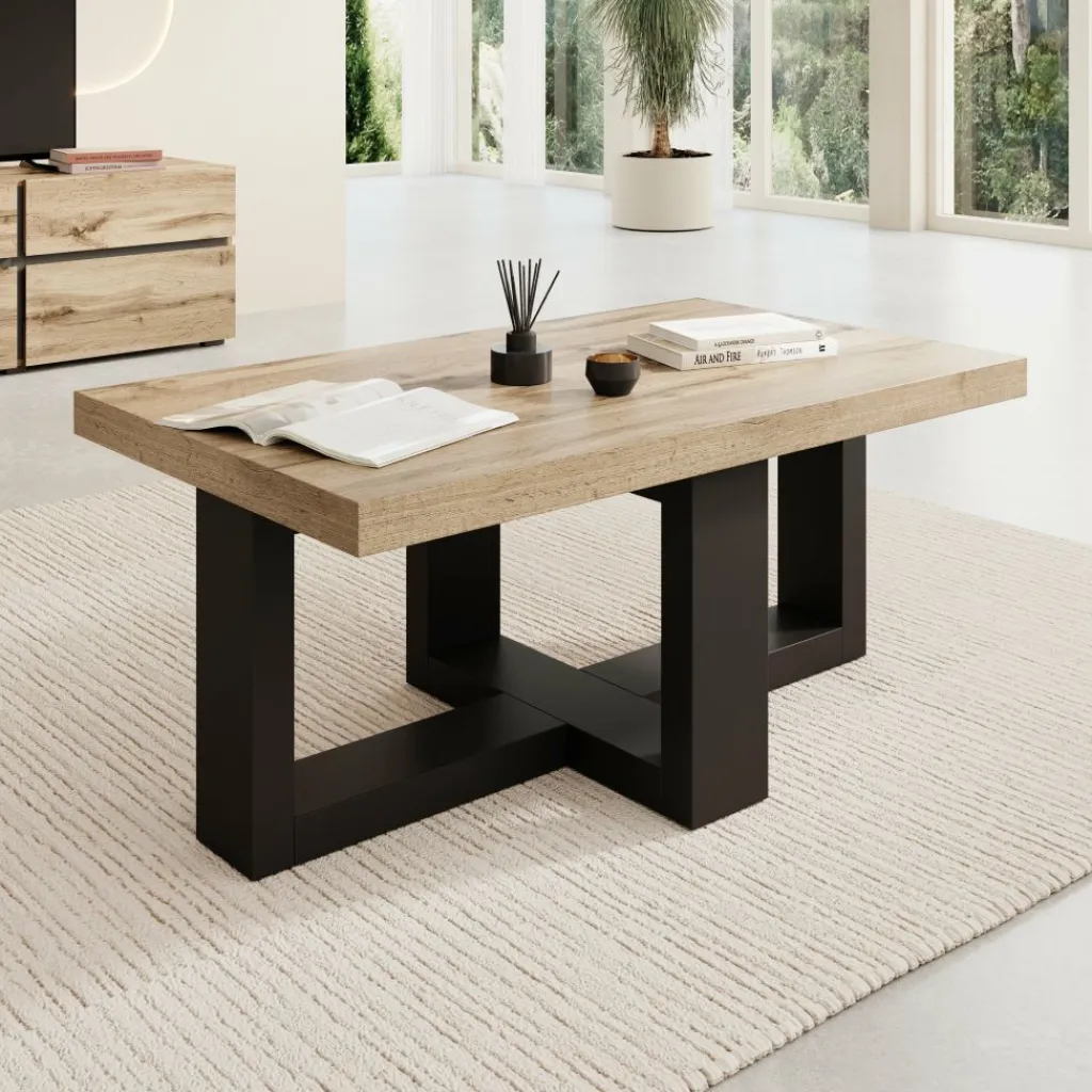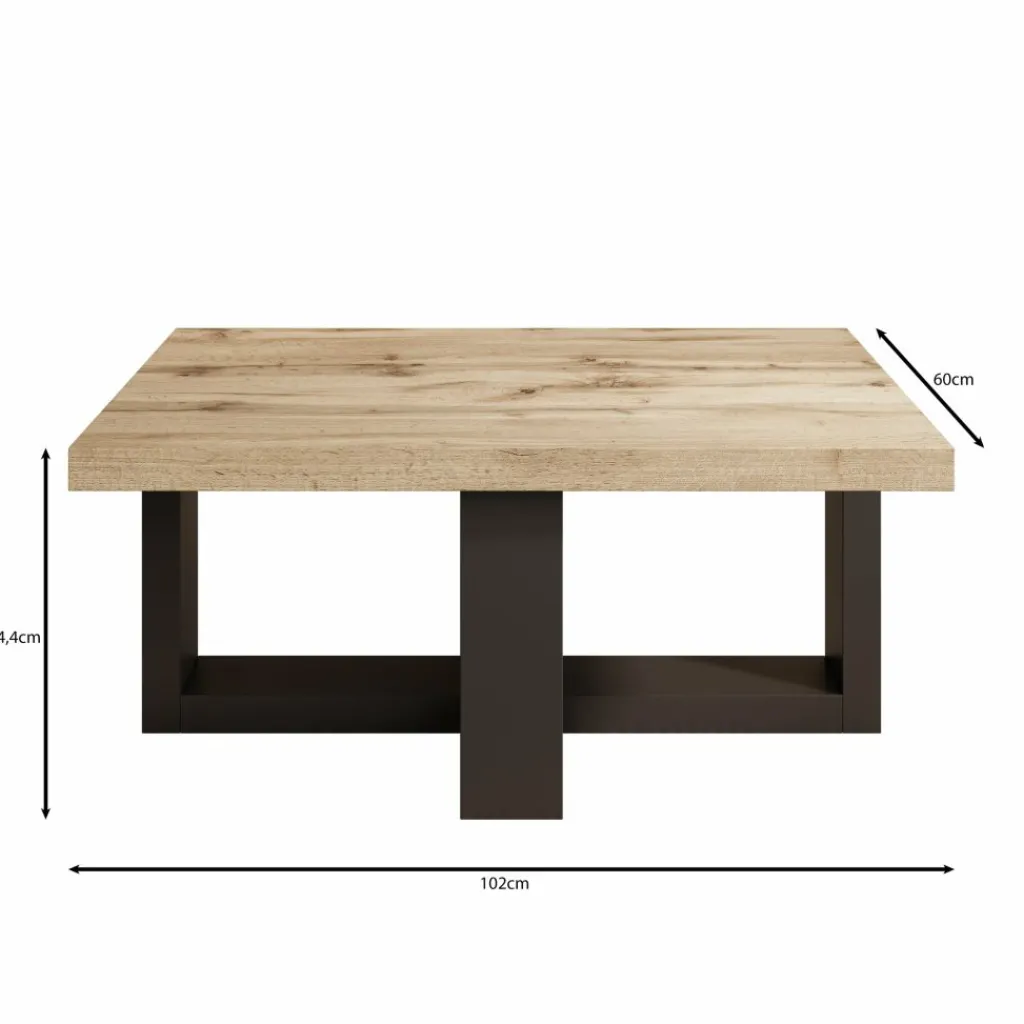 De Elys salontafel in eikenpatroon combineert een warme, natuurlijke uitstraling met een strak modern onderstel. Het robuuste tafelblad met authentiek eikenpatroon contrasteert mooi met het donkere kruisframe, waardoor de tafel een opvallend en tegelijkertijd tijdloos karakter krijgt. Zowel het tafelblad als het onderstel zijn vervaardigd uit 38 mm dik gelamineerd spaanplaat, wat de tafel niet alleen een stevige en solide uitstraling geeft, maar ook zorgt voor uitzonderlijke duurzaamheid bij dagelijks gebruik. Het unieke kruisframe geeft de tafel een kenmerkende look en zorgt voor een stabiele basis. Het ingebouwde legvlak onderin biedt handige extra ruimte voor boeken, tijdschriften of decoratieve accessoires. Met afmetingen van 102 x 60 x 44 cm heeft de tafel een ruim en comfortabel formaat, perfect voor de woonkamer. De combinatie van het warme houtpatroon en het donkere onderstel maakt de Elys geschikt voor zowel moderne als industriële interieurs.
