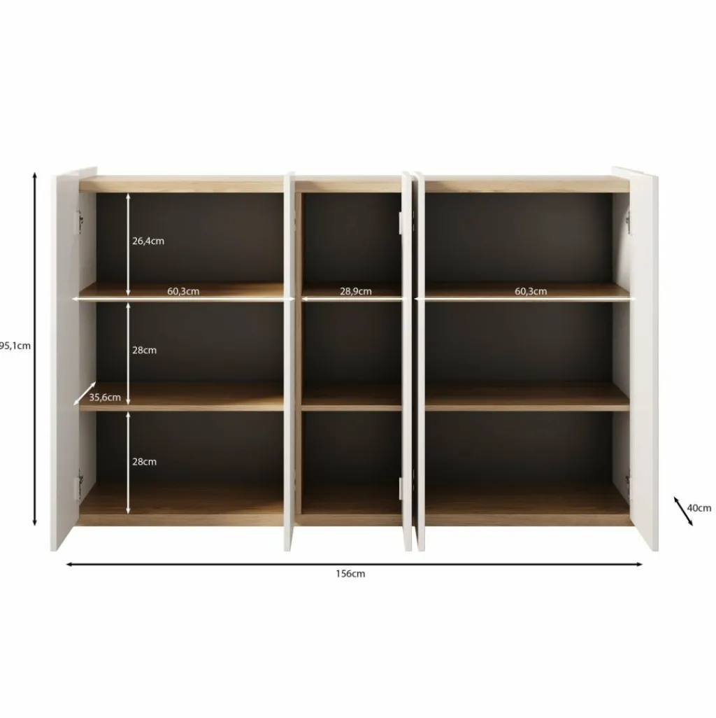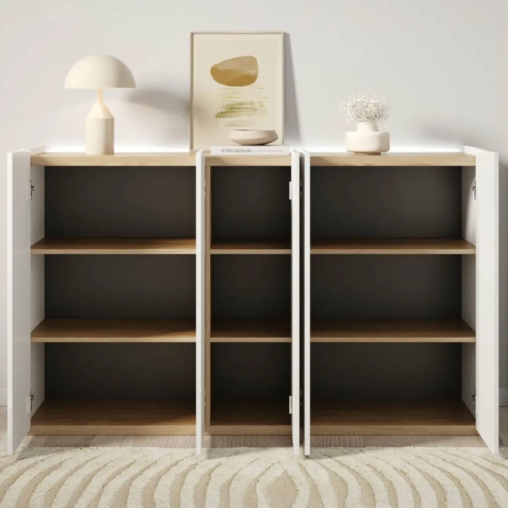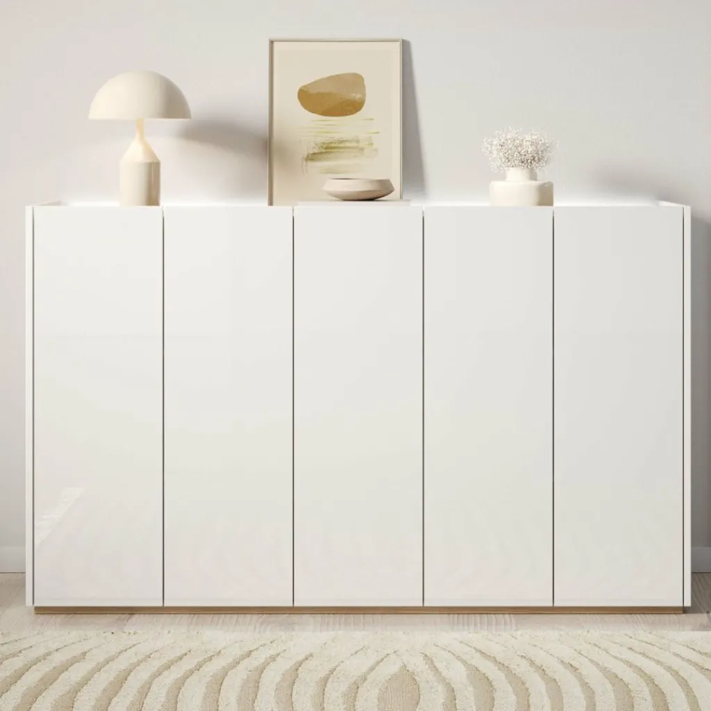 Schoenenkast Encore is een modern meubel die geschikt is voor het opbergen van je schoenen. De kast is voorzien van 5 greeploze deuren die te openen zijn via de bovenkant. Achter deze deuren zitten 9 opbergvakken. Aan de achterzijde aan de bovenkant kan je LED-verlichting plaatsen. Het meubel is uitgevoerd in wit met hoogglans witte voorkant. Het bovenblad is in een eiken kleur.