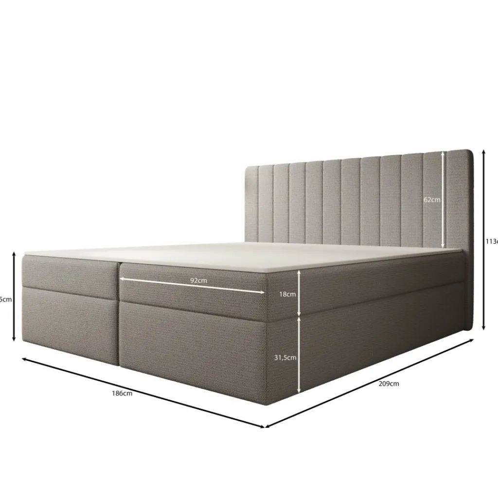 De Ensono boxspring in 180×200 cm combineert een ruim ligoppervlak met praktische opbergruimte. Het bed is opgebouwd uit 16 mm gelamineerde meubelplaat, 15 mm spaanplaat, 4 mm HDF en massief hout van 22–24 mm dik. Het hoofdbord heeft dezelfde opbouw, aangevuld met 1–2 cm T21-schuim voor comfortabele ondersteuning.
