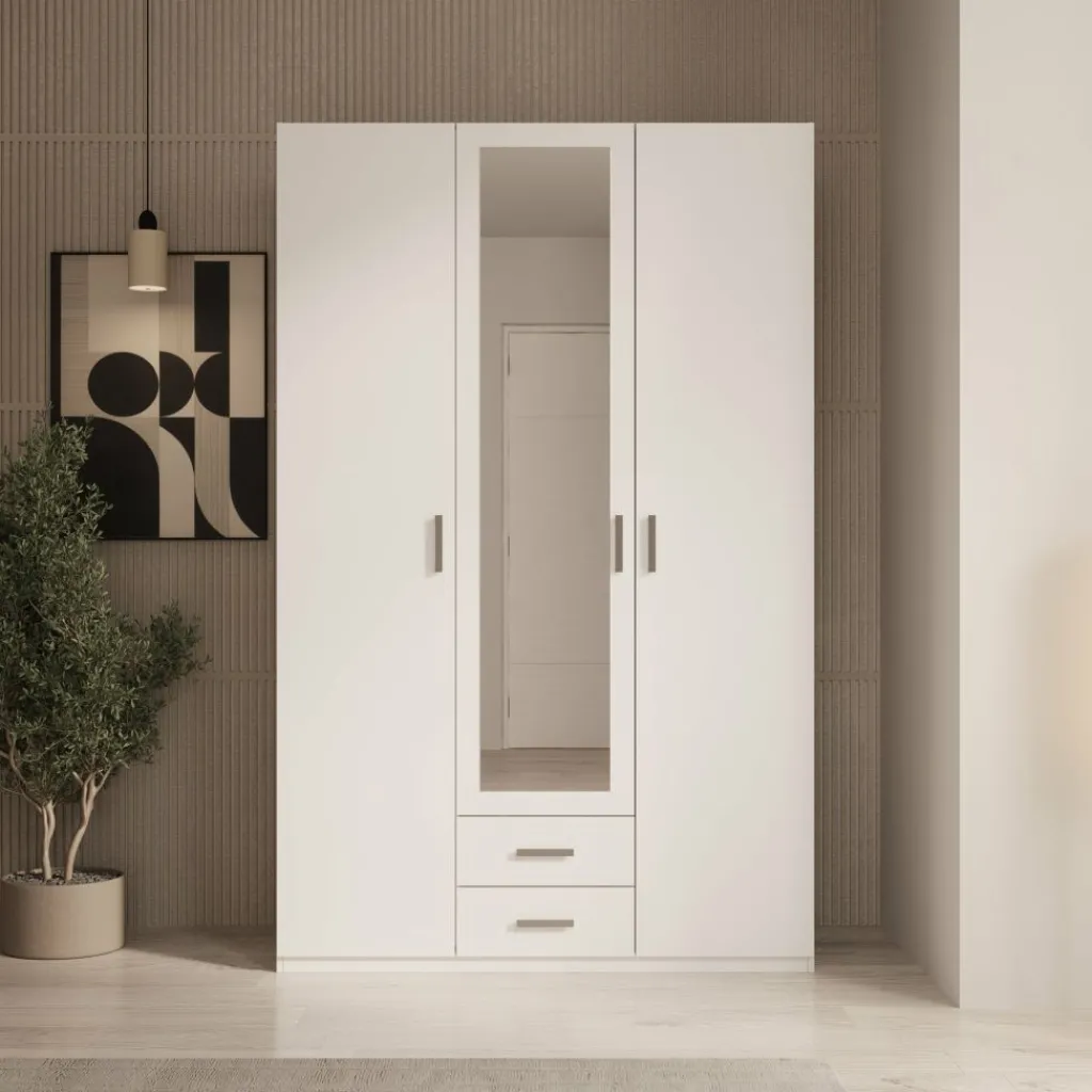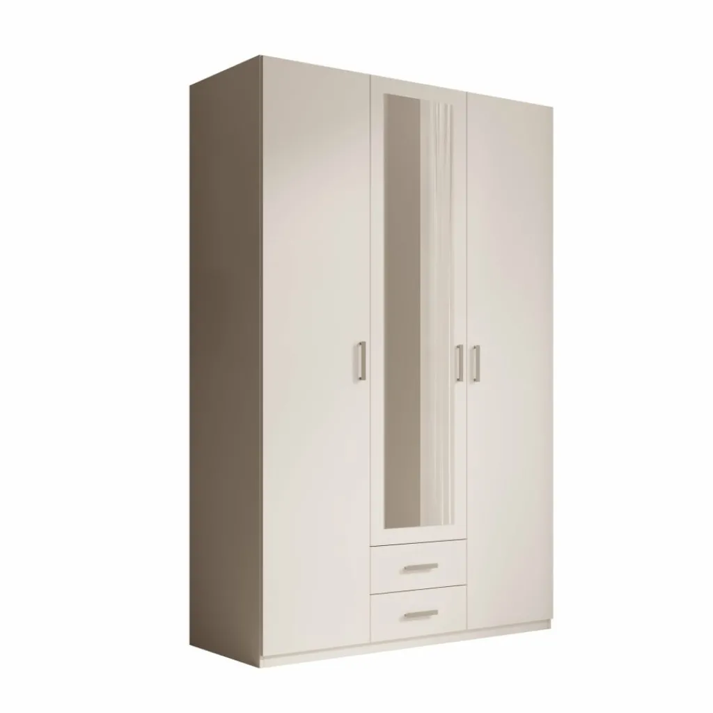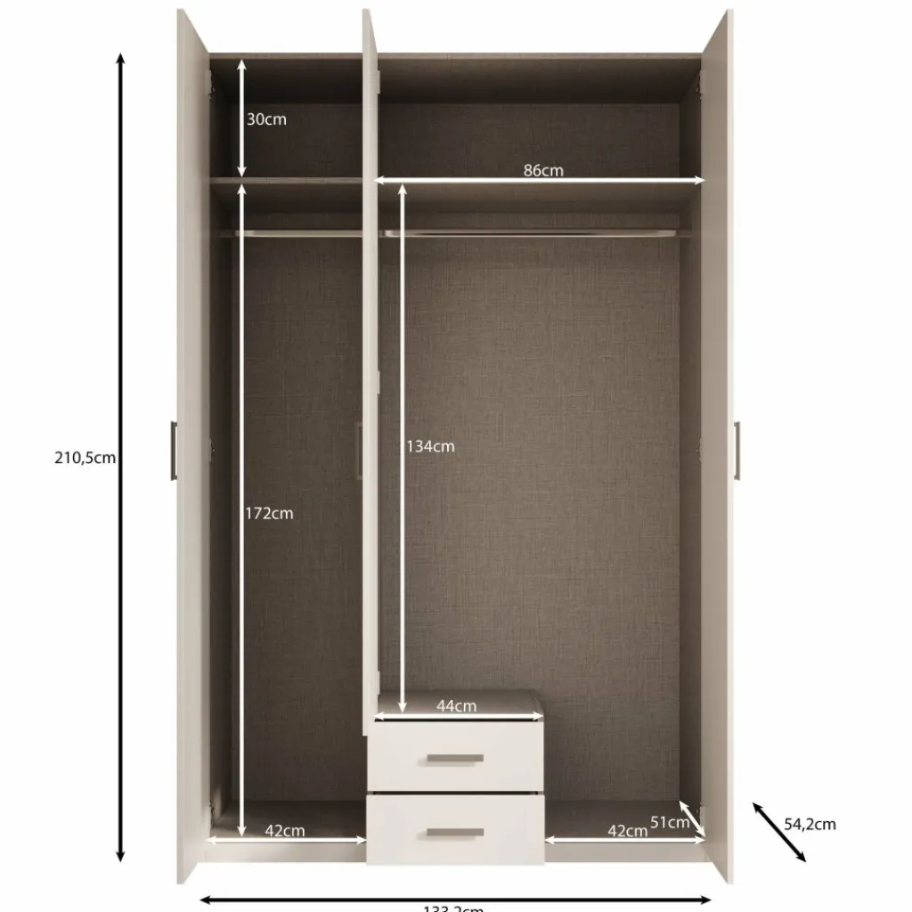 Enzio is een kledingkast met drie draaideuren en een praktische, overzichtelijke indeling. Het witte model heeft een strakke, neutrale afwerking die gemakkelijk te combineren is met verschillende interieurstijlen. De middelste deur is voorzien van een verticale spiegel, wat handig is bij het aankleden en de ruimte optisch groter laat ogen. Met een breedte van 133 cm, een diepte van 54 cm en een hoogte van 211 cm biedt deze kast veel functionele opbergruimte.