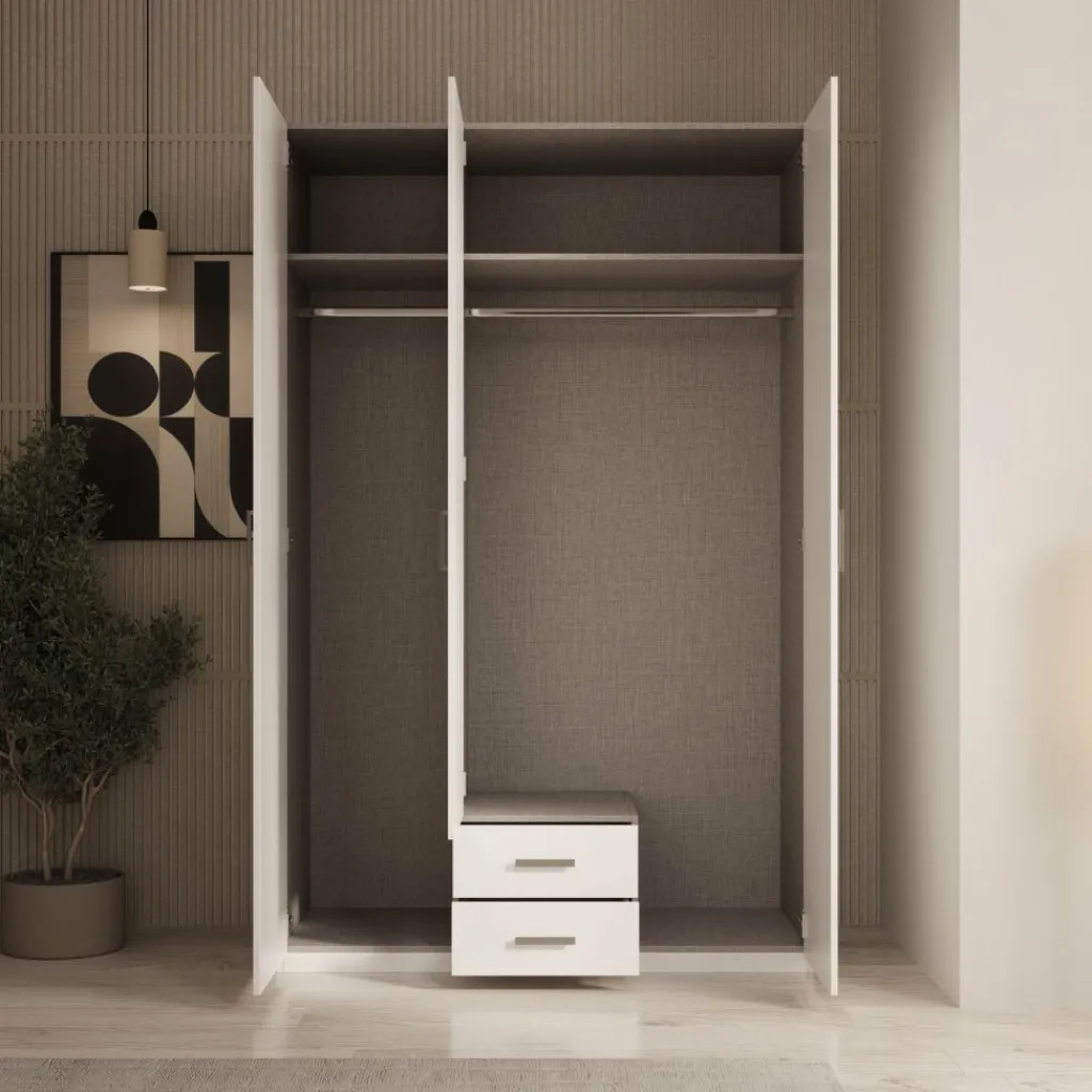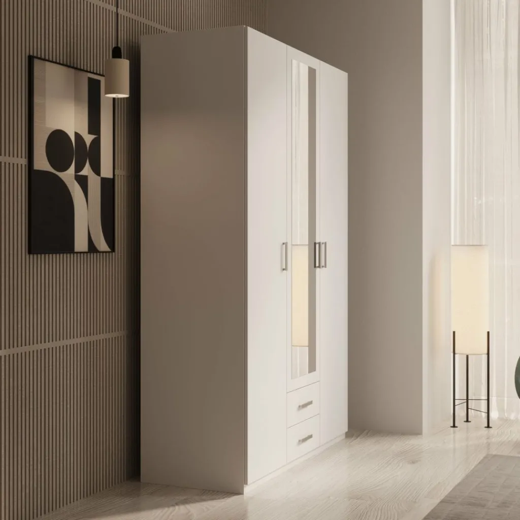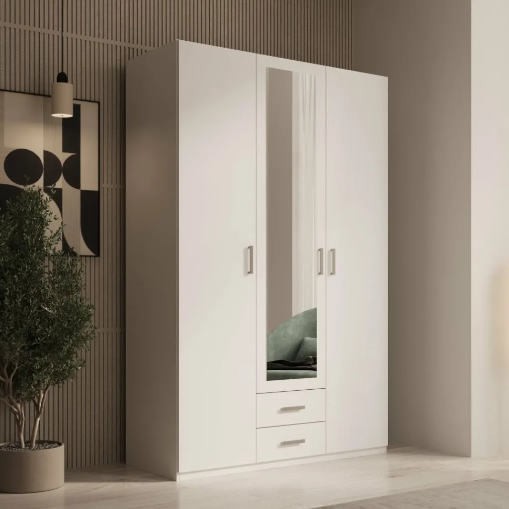 Enzio is een kledingkast met drie draaideuren en een praktische, overzichtelijke indeling. Het witte model heeft een strakke, neutrale afwerking die gemakkelijk te combineren is met verschillende interieurstijlen. De middelste deur is voorzien van een verticale spiegel, wat handig is bij het aankleden en de ruimte optisch groter laat ogen. Met een breedte van 133 cm, een diepte van 54 cm en een hoogte van 211 cm biedt deze kast veel functionele opbergruimte.