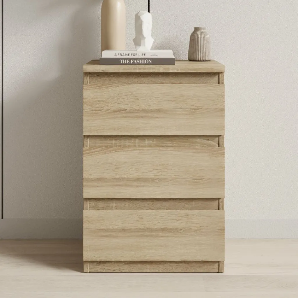 Deze variant is uitgevoerd in een eikenpatroon en heeft een strak, gesloten ontwerp zonder zichtbare grepen. Aan de voorzijde zijn drie lades boven elkaar geplaatst. Op de open foto is te zien dat de lades diep zijn uitgevoerd, wat zorgt voor praktische opbergruimte voor kleding, accessoires of andere spullen. Het bovenblad is geschikt voor decoratie of dagelijkse items.