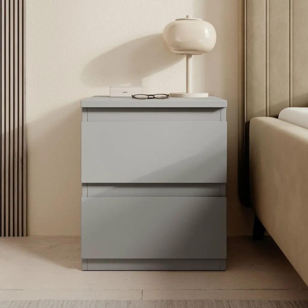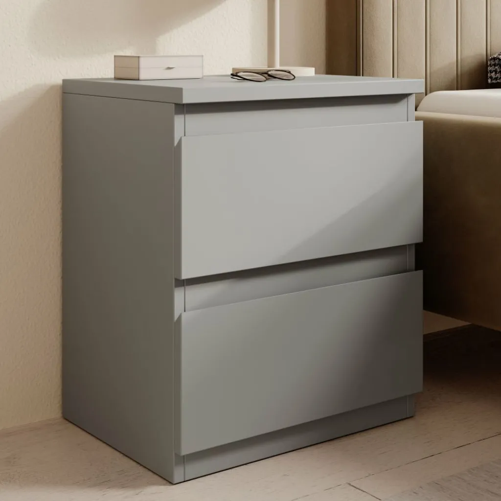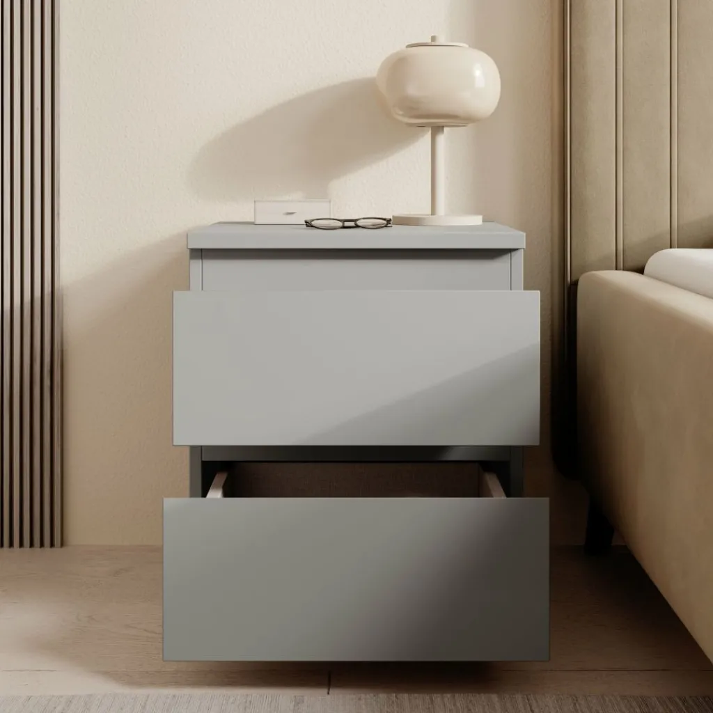 Het nachtkastje is uitgevoerd in grijs en heeft een strak, gesloten ontwerp zonder zichtbare grepen. Aan de voorzijde zijn twee lades geplaatst, boven elkaar. Op de open foto is te zien dat de onderste lade dieper is uitgevoerd en geschikt is voor het opbergen van grotere items zoals boeken of accessoires. De bovenste lade is bedoeld voor kleinere spullen die je graag binnen handbereik houdt. Het bovenblad biedt ruimte voor een lamp, telefoon of andere dagelijkse items.