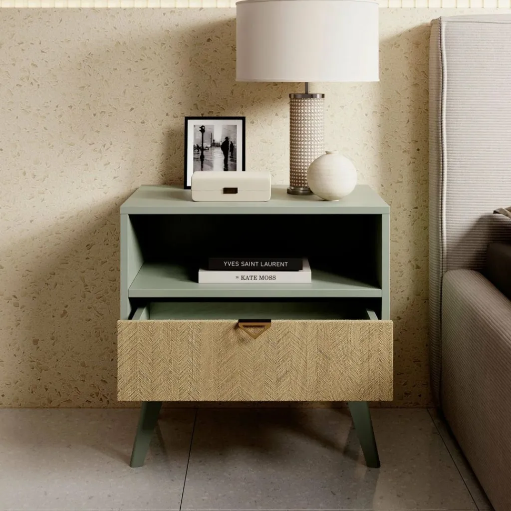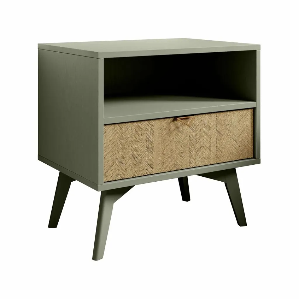 Het nachtkastje staat op hoge, groen gekleurde pootjes, waardoor het geheel een luchtige uitstraling krijgt en eenvoudig te combineren is binnen verschillende interieurstijlen.