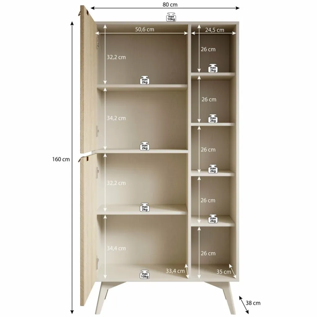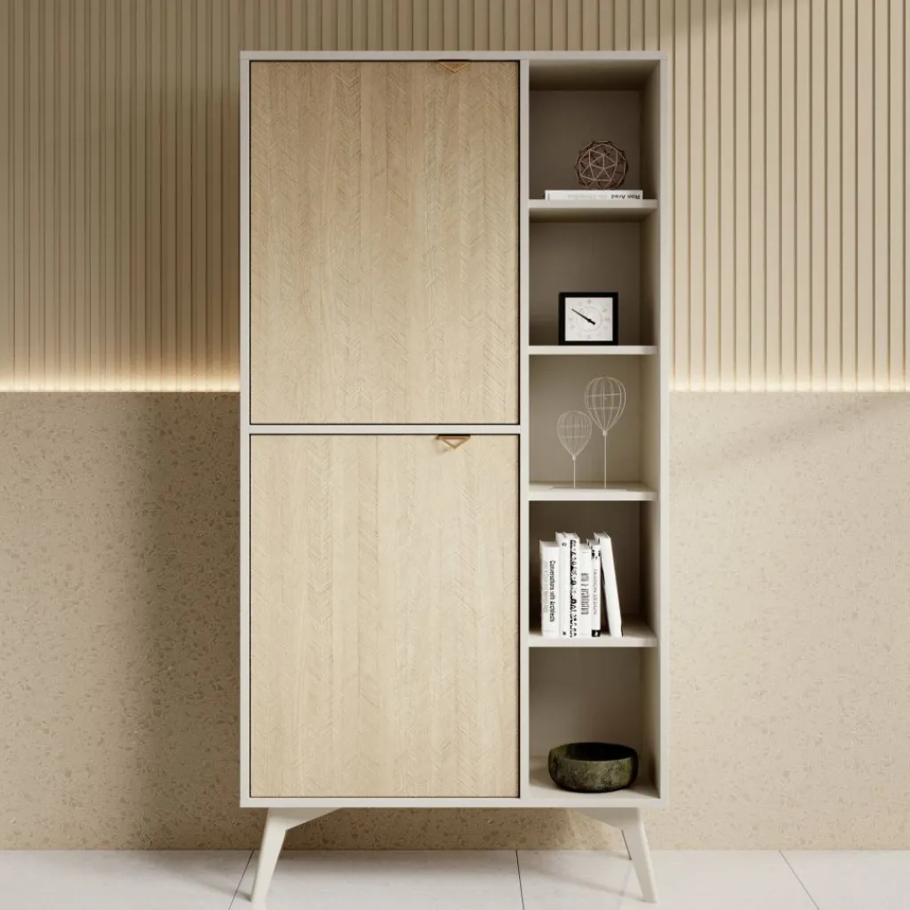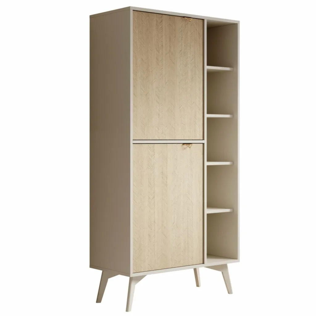 De Essence staat op hoge, beige pootjes. De voorkant van de deurtjes hebben een visgraat patroon in subtiele, licht eiken kleur.