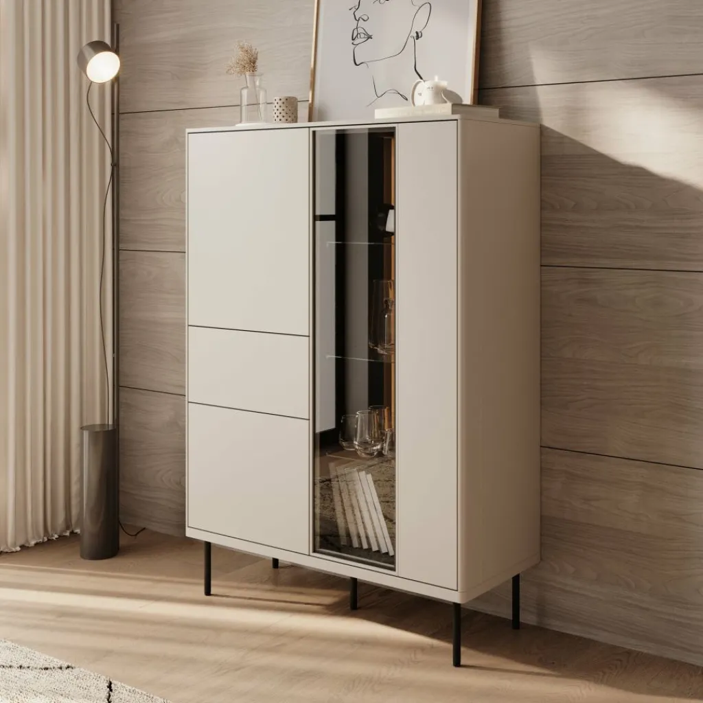 De vitrinekast Estrella heeft een strak en eigentijds ontwerp dat goed aansluit bij moderne interieurs. De beige kleur in combinatie met zwarte accenten geeft het meubel een verzorgde en evenwichtige uitstraling.