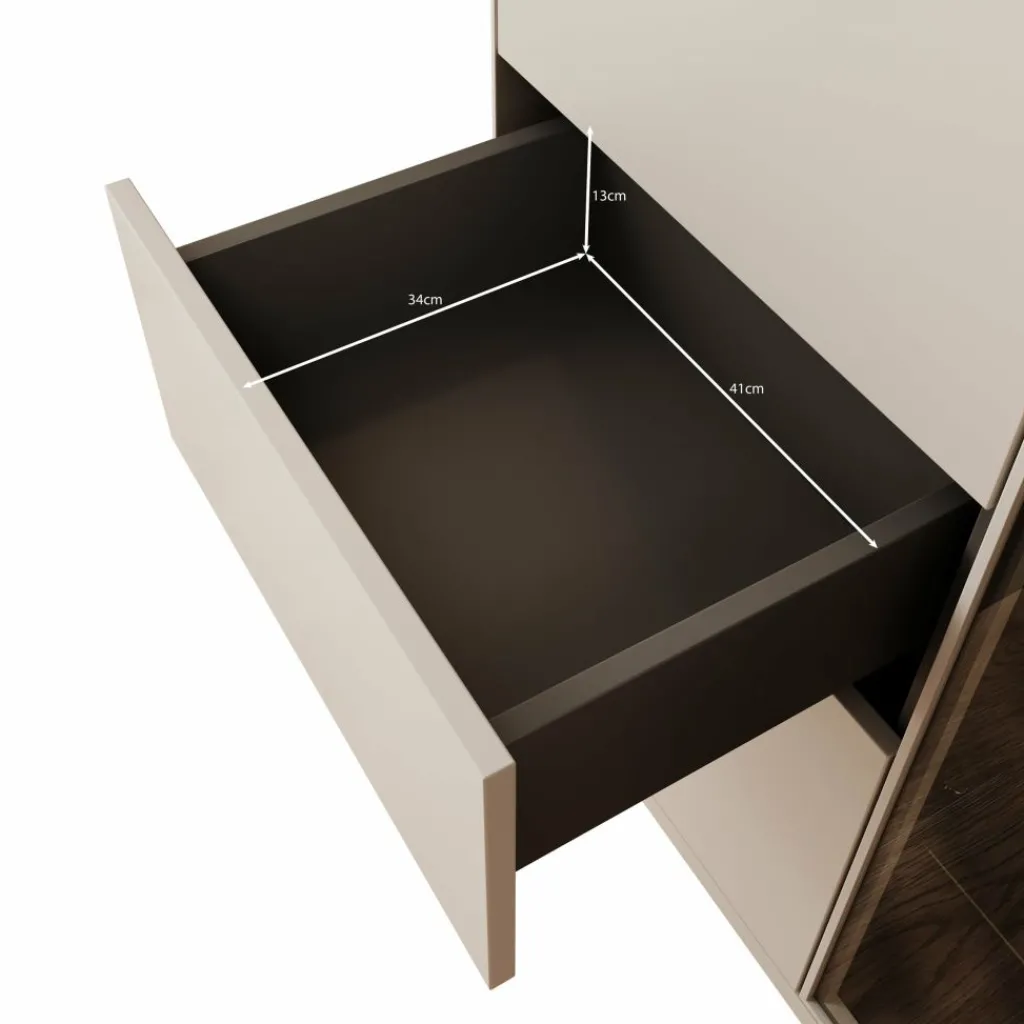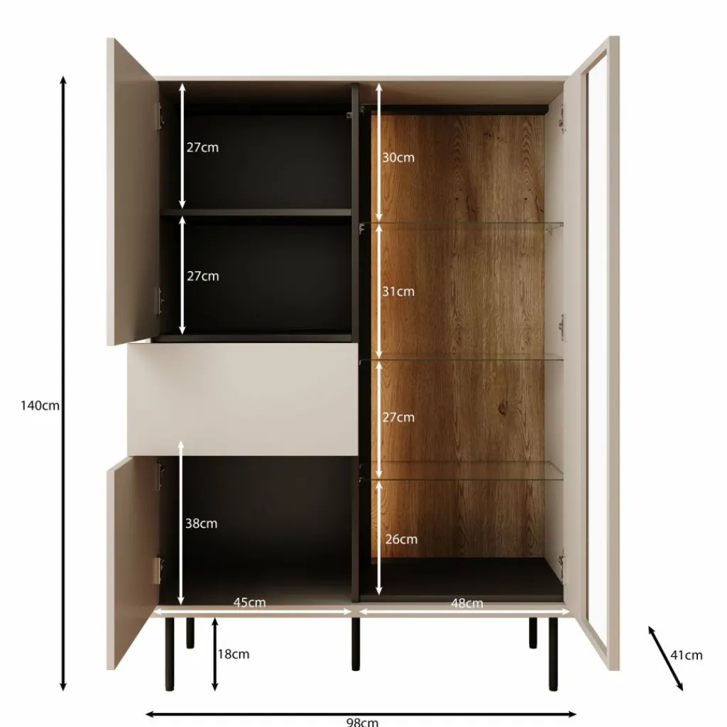 De kast bestaat uit twee deuren, twee lades en een glazen vak in het midden. Achter de deuren bevinden zich ruime opbergvakken voor servies, glaswerk of andere items die je netjes wilt opbergen. Het centrale glazen gedeelte is voorzien van glazen legplanken, een houten achterwand en geïntegreerde ledverlichting, waardoor decoratie en accessoires duidelijk zichtbaar worden en extra worden benadrukt.