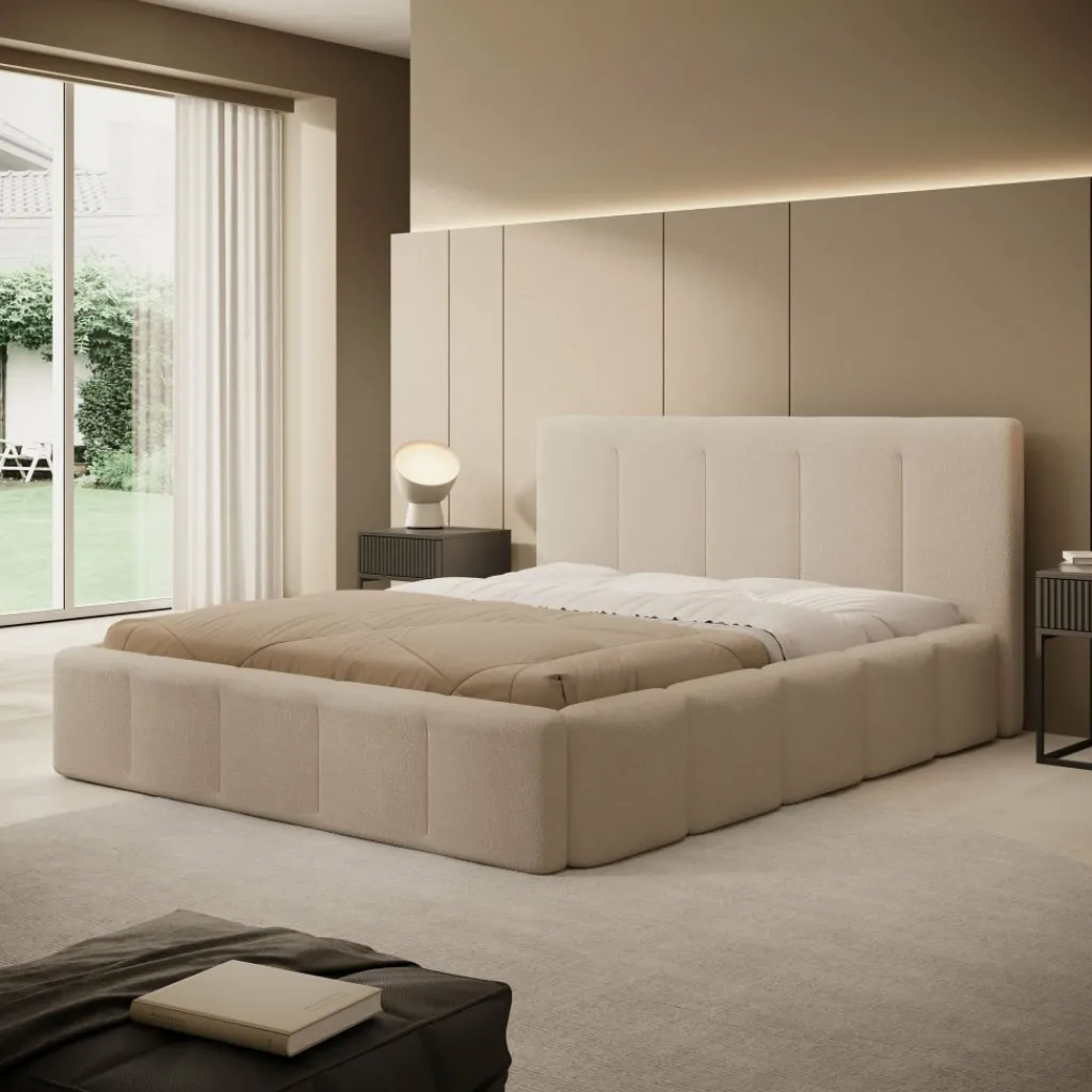 Bed Excalibur is een modern bed, bekleed met een zachte teddystof in de kleur beige.
