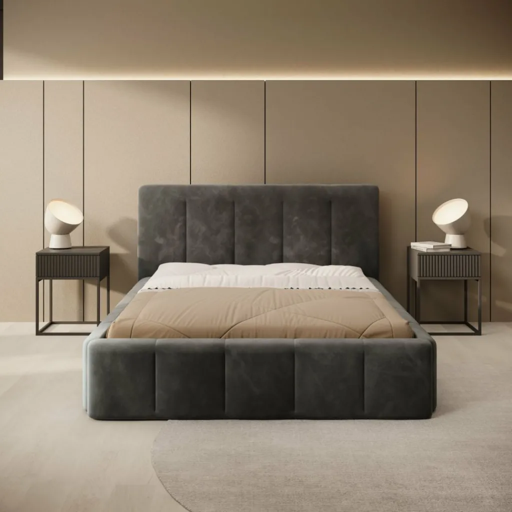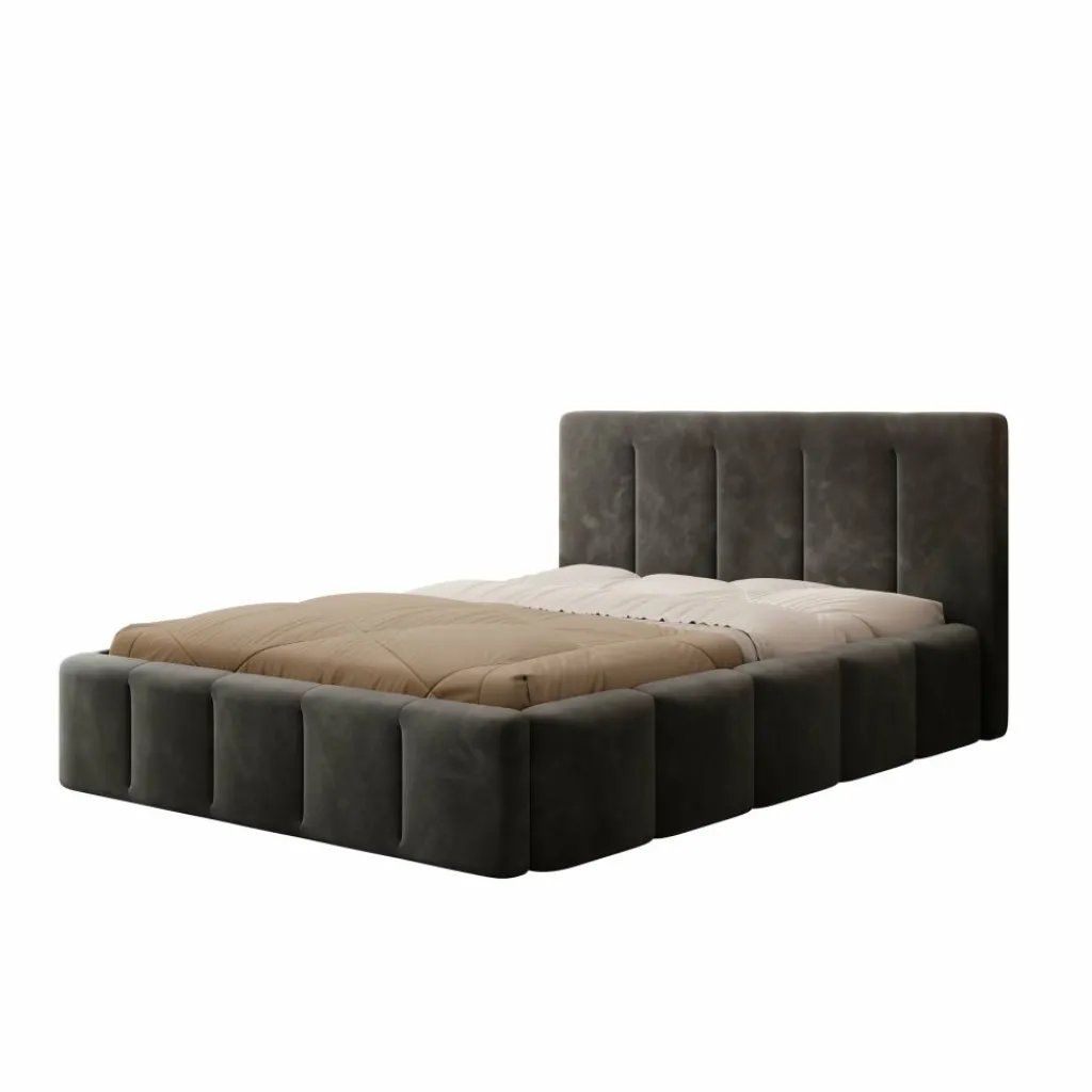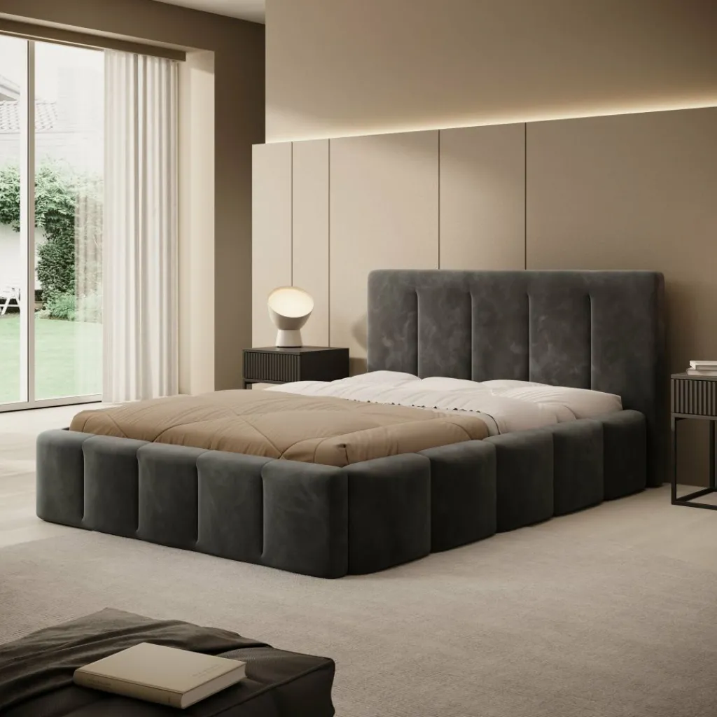 Tweepersoonsbed Excalibur is een stijlvolle blikvanger voor de slaapkamer. De volle, afgeronde vormen geven het bed een robuuste uitstraling, terwijl de zwarte velvet stof zorgt voor een zachte, luxe touch. Het verticaal gestikte hoofdbord is niet alleen decoratief, maar ook prettig als rugsteun tijdens het lezen.