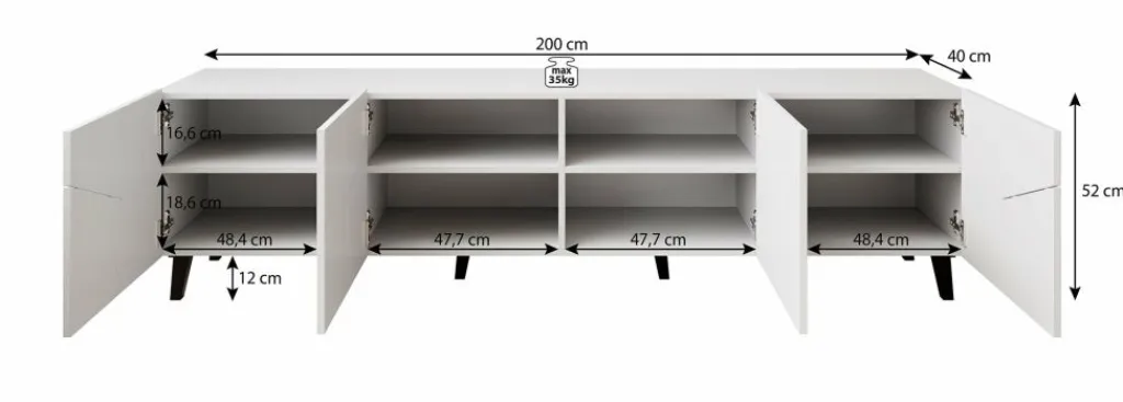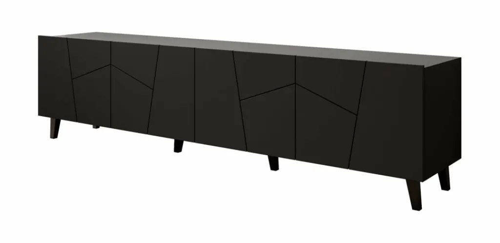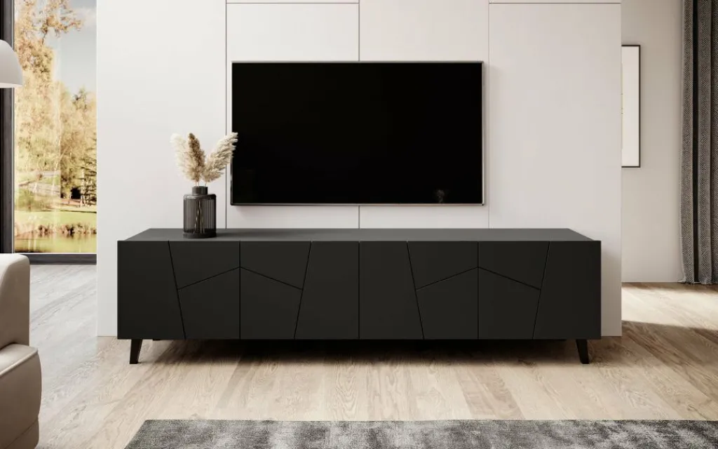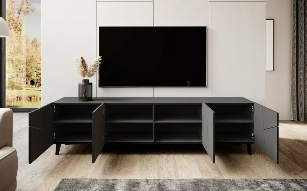 TV-Meubel Ezer is een opbergkast voor onder de tv in een moderne, hotel chique stijl. De tv kast beschikt over 4 deuren die via de bovenkant te openen zijn. Daarachter zitten maar liefst 8 opbergvakken. De voorkant heeft een strak lijnenpatroon wat de kast nog meer laat opvallen. Het meubel staat op zwart metalen pootjes.
