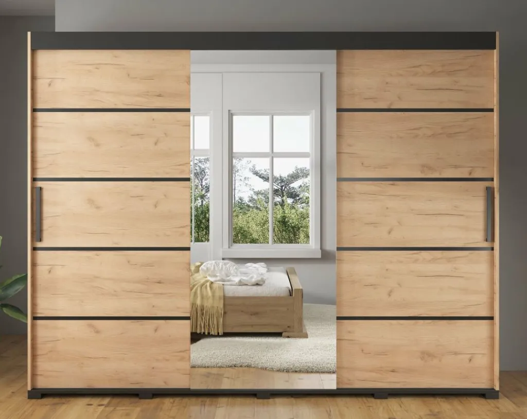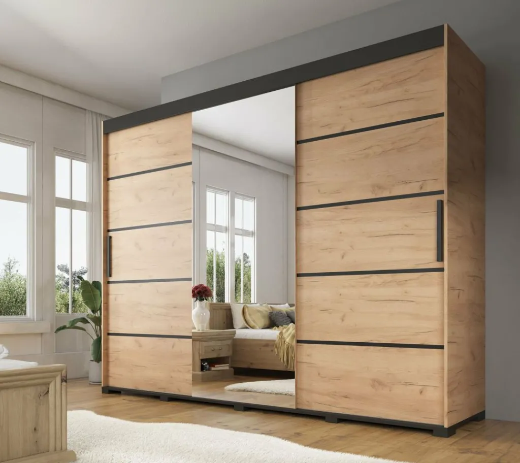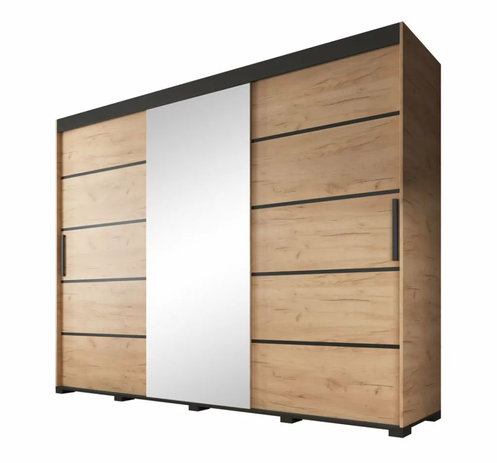 Kledingkast Fabio is een stijlvolle garderobekast uitgevoerd in eiken met zwarte details. De kledingkast heeft in totaal drie schuifdeuren met in het midden een spiegel. Kledingkast Fabio heeft veel opbergruimte. In het midden vind je twee stangen om kleding op te hangen. Daarnaast beschikt de kast over totaal 10 vakken om kleding op te bergen.