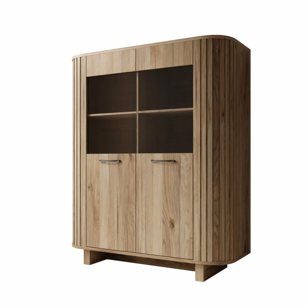 De deuren zijn uitgevoerd met rechte, donkere handgrepen. De kast staat op een lage plint en is volledig vrij van de vloer geplaatst. De afgeronde zijkanten en verticale belijning aan de zijkant zijn duidelijk zichtbaar en doorgevoerd in het ontwerp. De eikenafwerking loopt door over het gehele meubel, wat zorgt voor een consistent geheel.