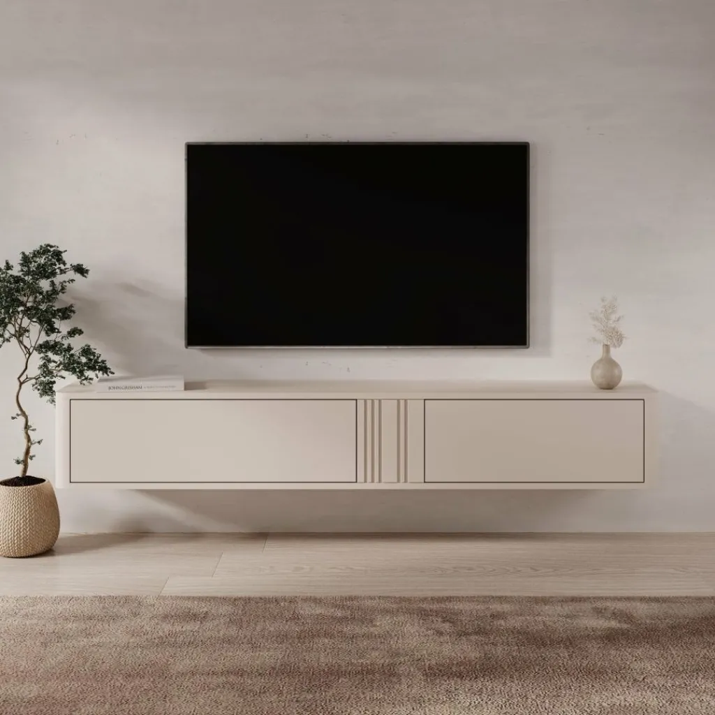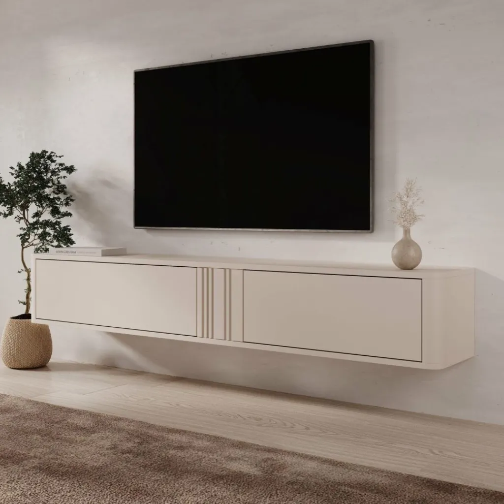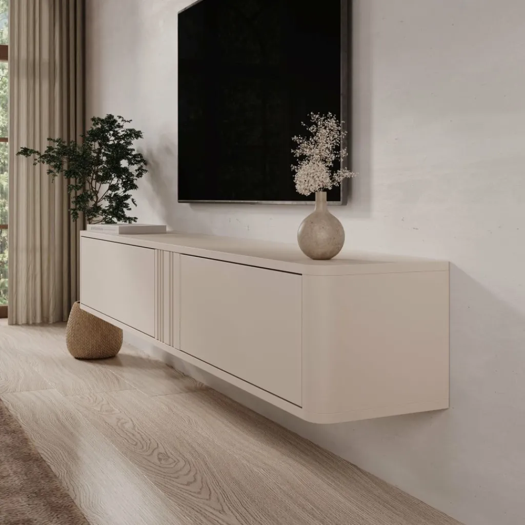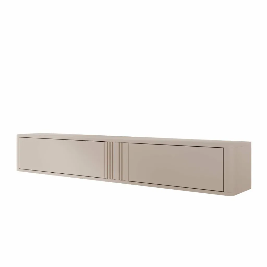 Het ontwerp kenmerkt zich door afgeronde hoeken en subtiele verticale lijnen in het midden van het front. De egale beige afwerking zorgt voor een rustige en strakke uitstraling aan de wand. Dankzij het zwevende model blijft de vloer vrij en creëer je een overzichtelijke opstelling onder je televisie.