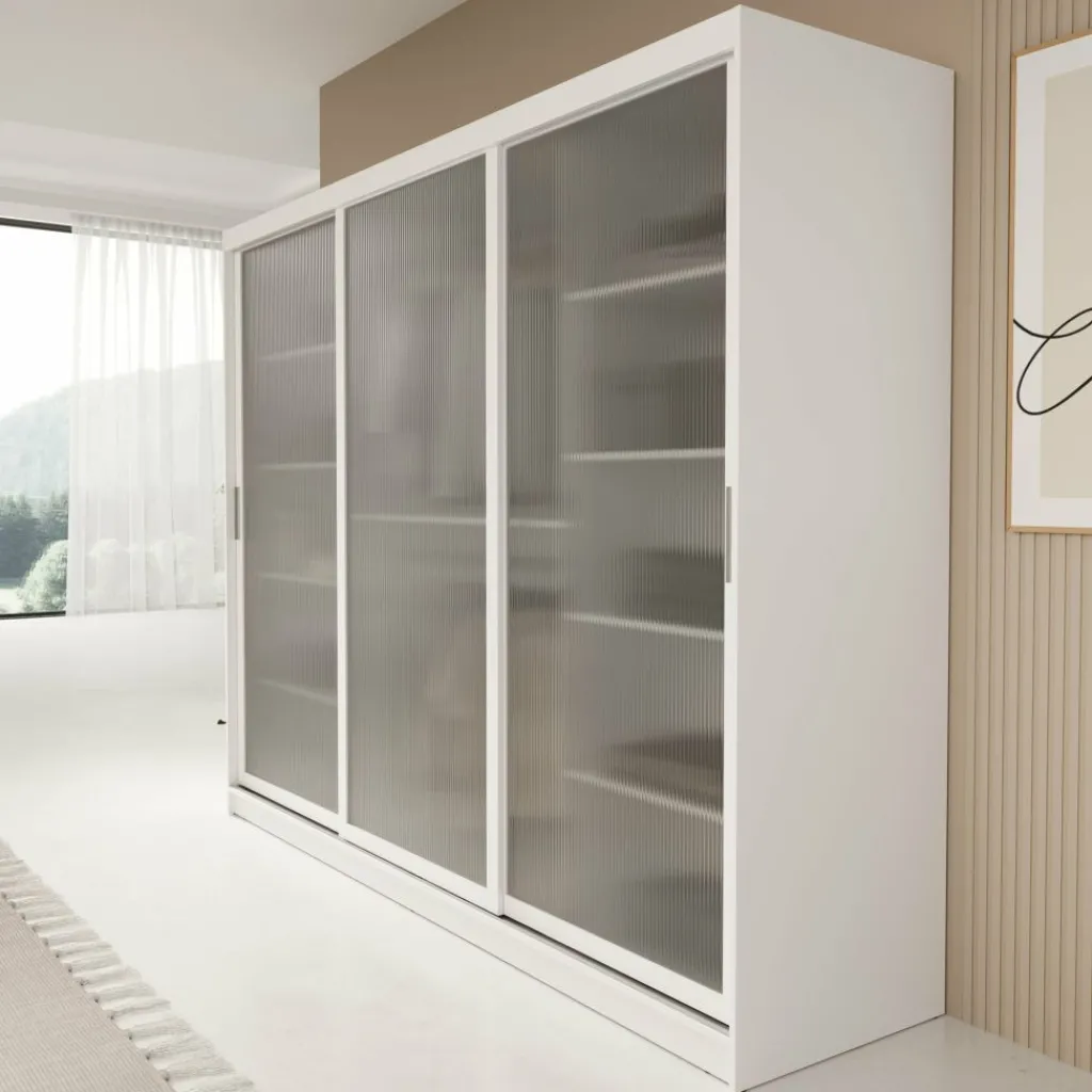 Kledingkast Fessaro is een royale en elegante kast die ideaal is voor het opbergen van een complete garderobe. Met een afmeting van 250x62x200 cm biedt deze kast uitzonderlijk veel ruimte voor kleding, schoenen en accessoires. De witte uitvoering zorgt voor een frisse, lichte uitstraling, terwijl de schuifdeuren met luxe ribglas de kast een chique en moderne look geven.