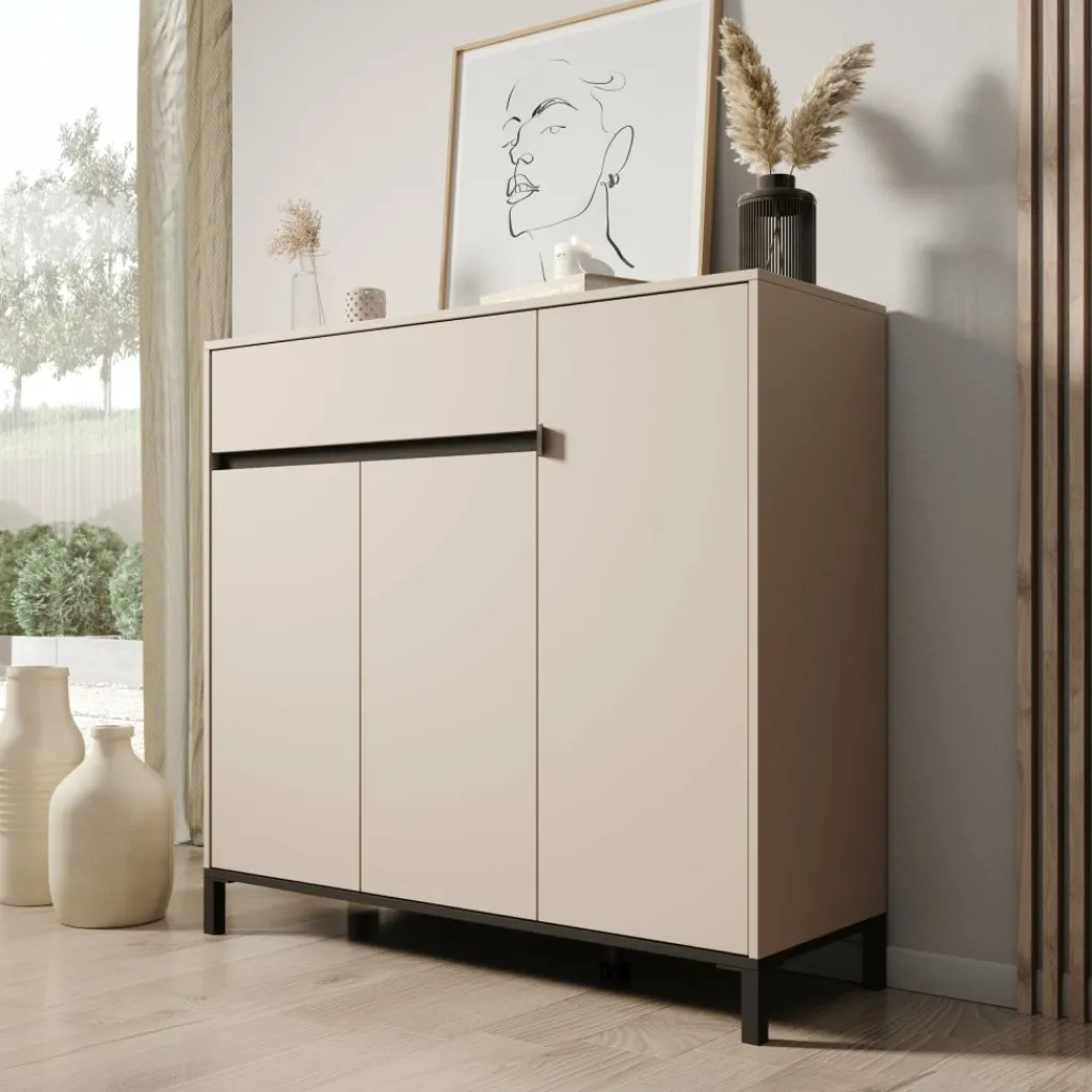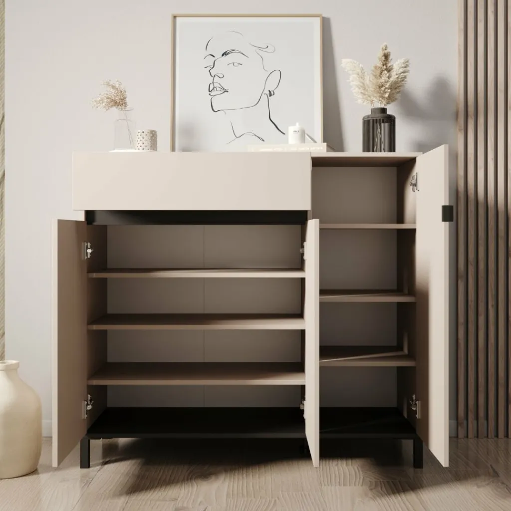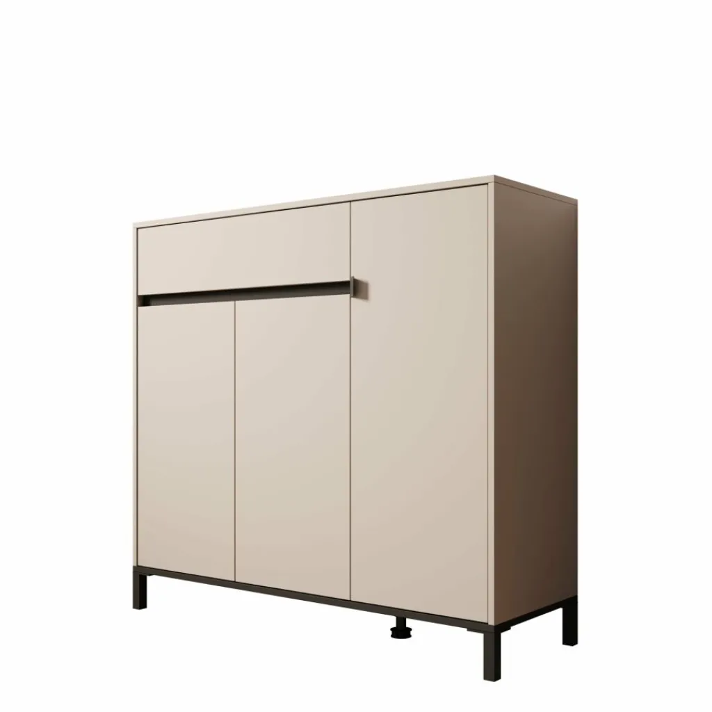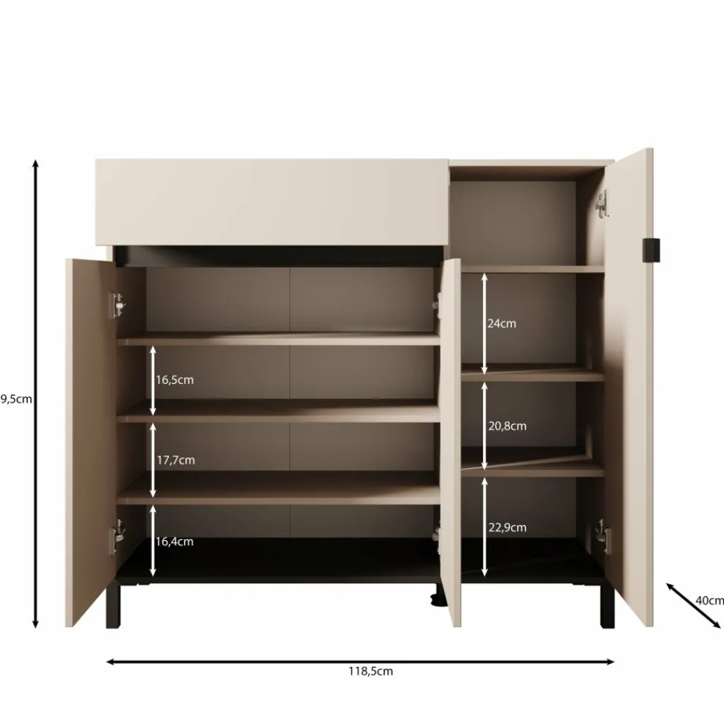 De Finta schoenenkast in beige heeft een strakke vormgeving met een brede lade bovenin en drie deuren daaronder. De kast is 119 cm breed en 110 cm hoog en biedt dankzij de indeling met meerdere schappen ruime opbergmogelijkheden voor schoenen en accessoires. De brede lade is geschikt voor kleinere items zoals sleutels, onderhoudsproducten of opvouwbare accessoires.