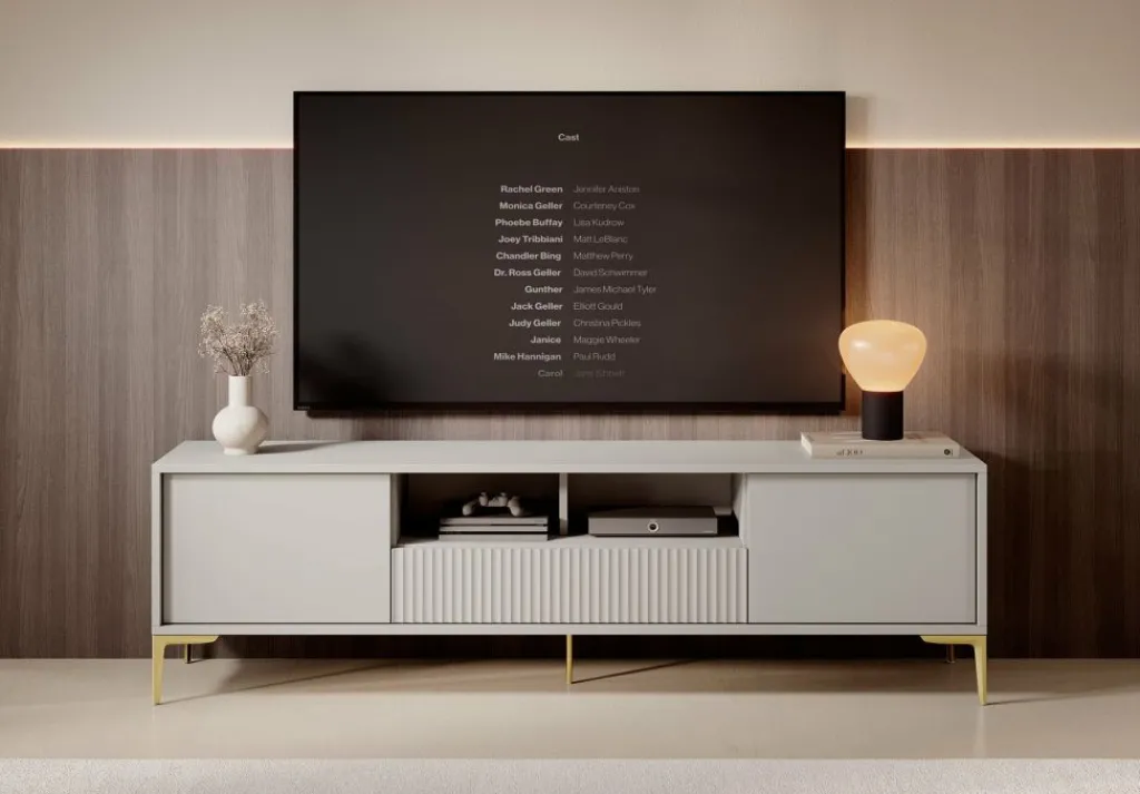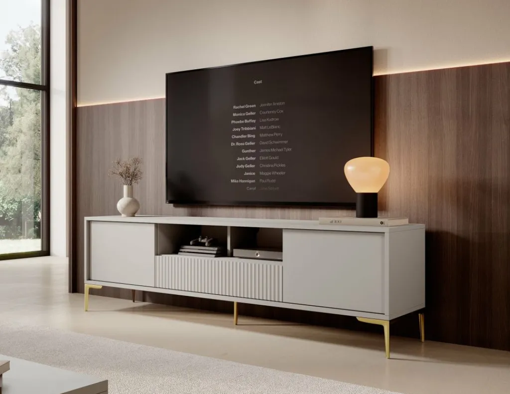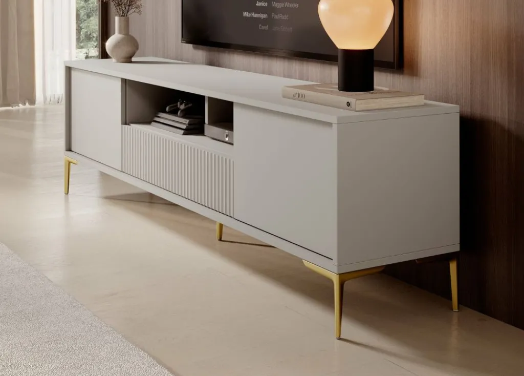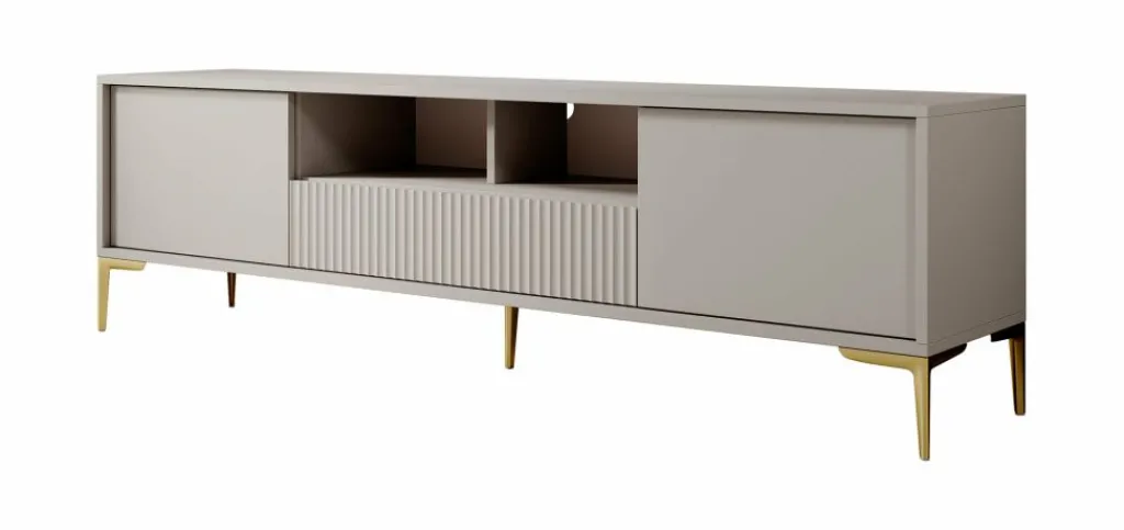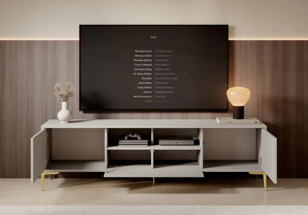 TV-Meubel Five beschikt over 1 klep en 2 deuren die te openen zijn met het push to open systeem. Boven de klep, die op de voorkant een latten patroon heeft, zitten nog 2 open vakken. De achterwand beschikt over een uitsparing om eventuele bedrading weg te kunnen werken.