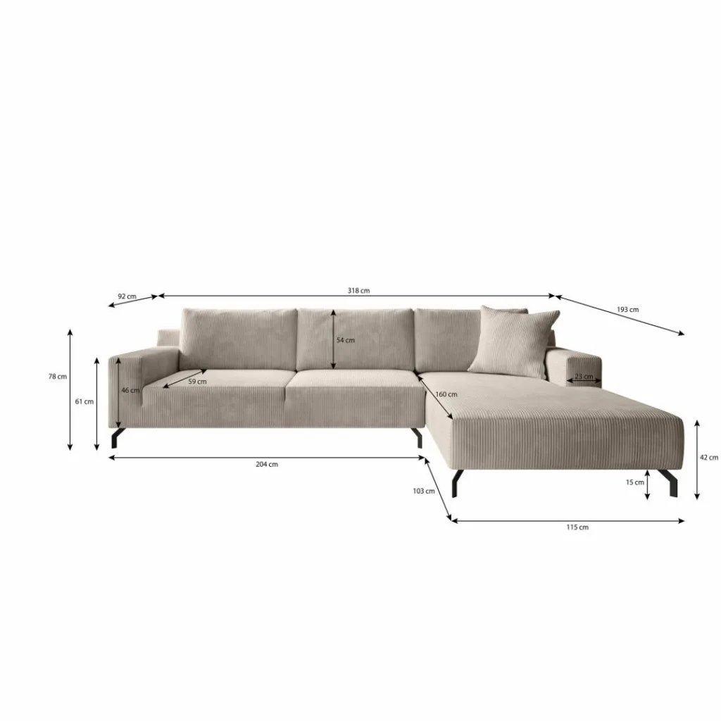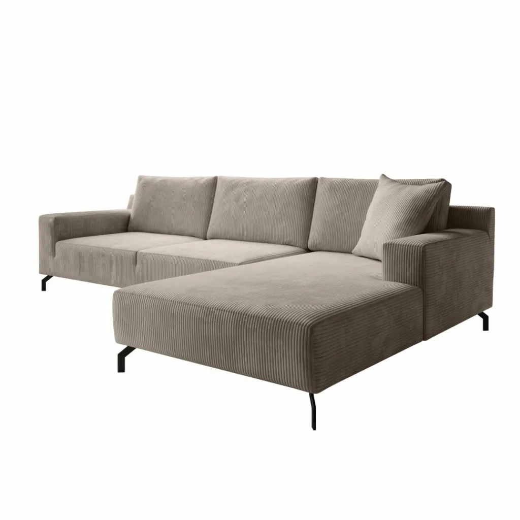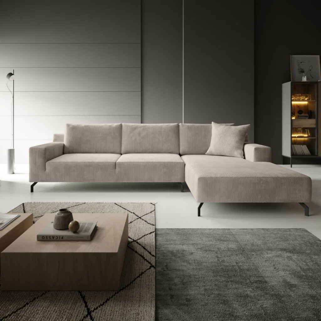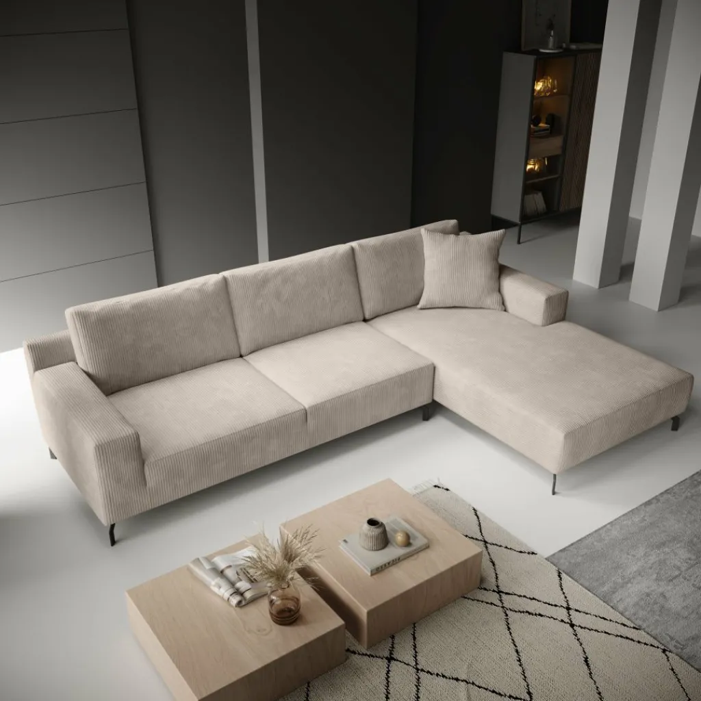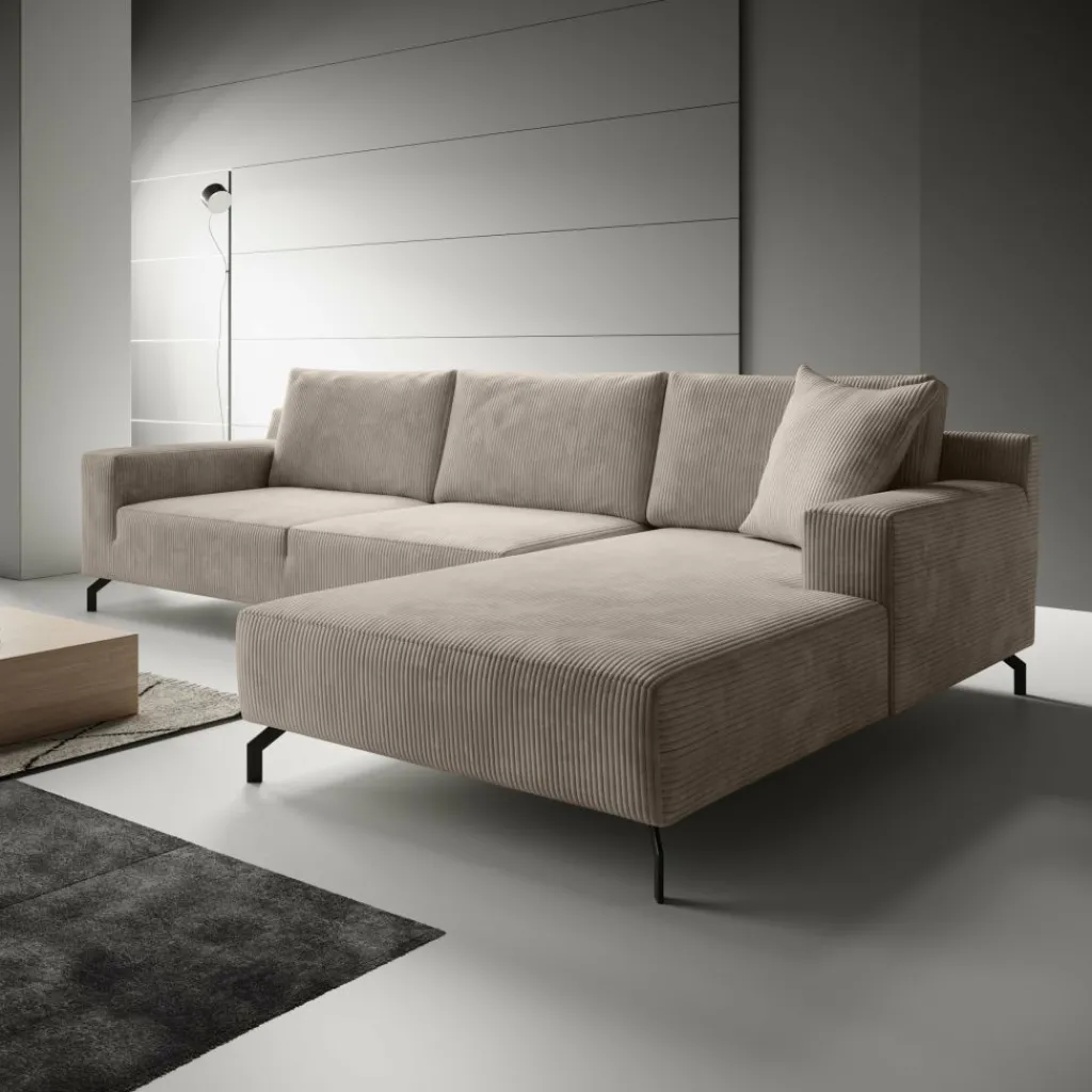 Hoekbank Florencio is een moderne, L-vormige bank met een rustige en tijdloze uitstraling. De combinatie van het strakke ontwerp en de zachte ribstof zorgt voor een comfortabele zitplek voor 2 tot 3 personen.