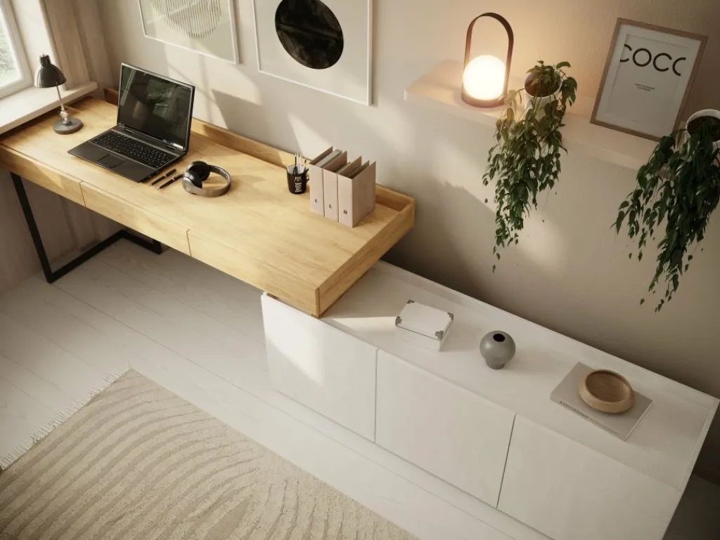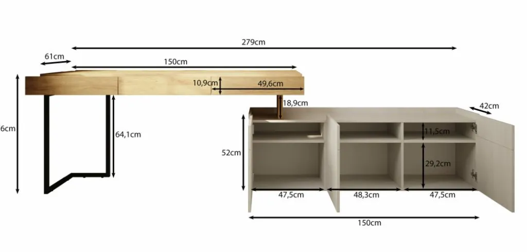 Tijdens het monteren heb je de keuze om er een L-vorm van te maken of een lang bureau. Ook kan je beslissen of je de poten aan de linker- of rechterkant monteert, ditzelfde geldt dus ook voor het dressoir.
