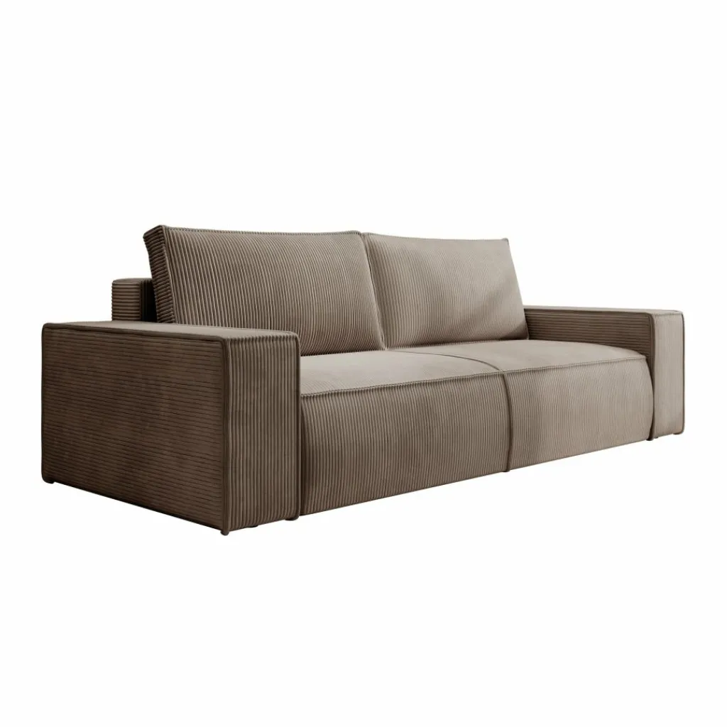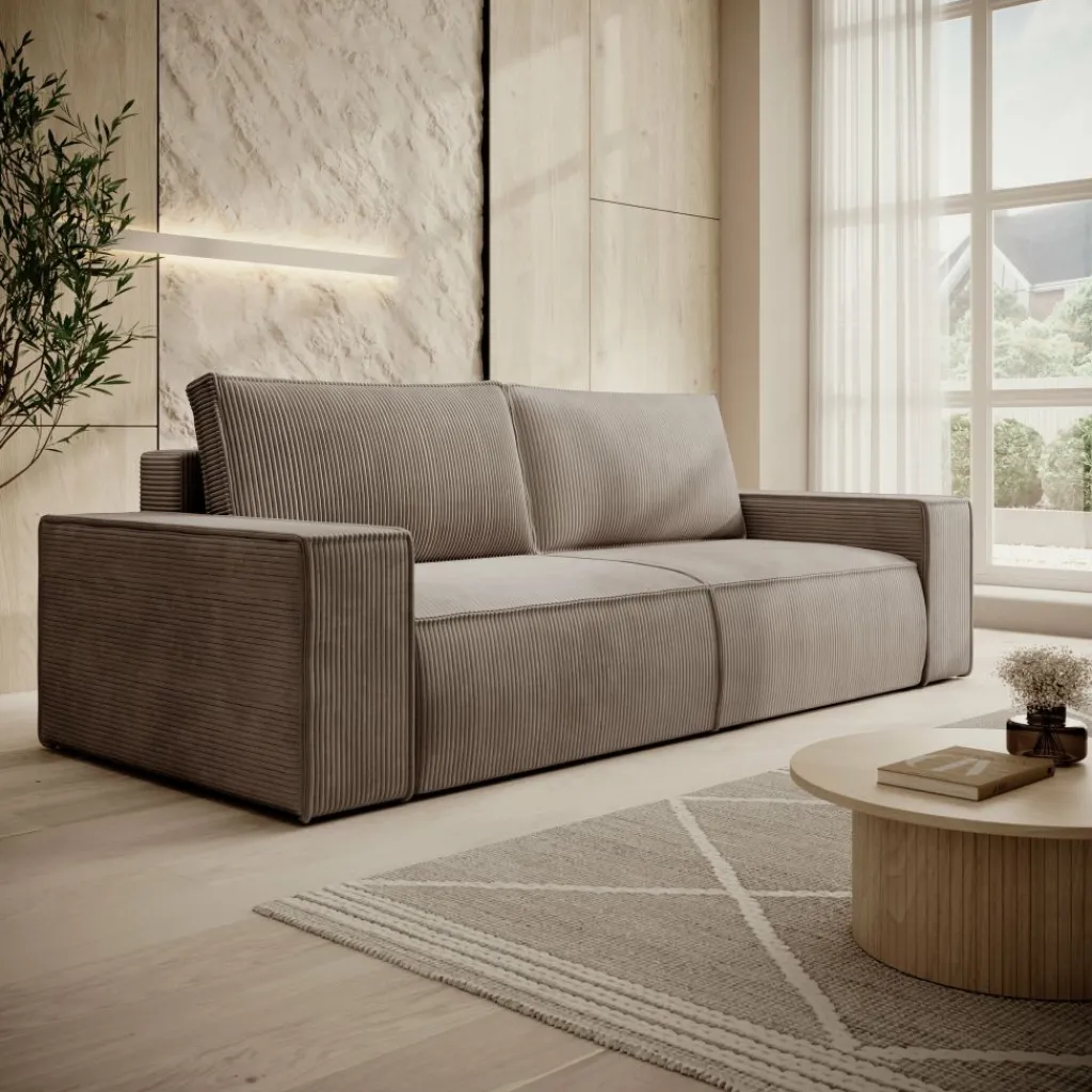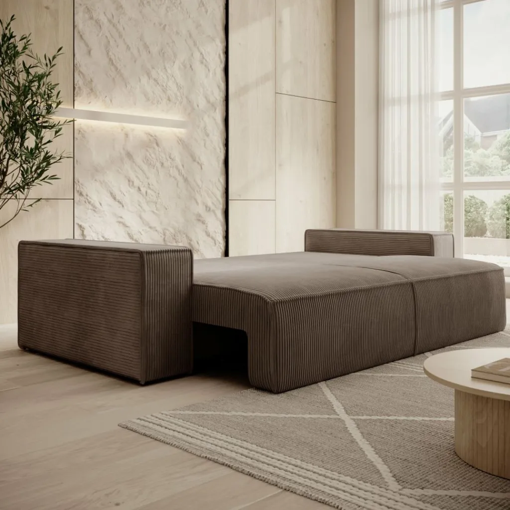 De Foster 3-zitsbank is een ruime slaapbank met een duidelijke vormgeving en een stevige uitstraling. Met een breedte van 257 cm biedt dit model voldoende zitruimte voor meerdere personen en is hij geschikt voor grotere woonkamers. De bruine ribstof geeft de bank een herkenbare structuur en sluit goed aan bij interieurs waarin textuur een rol speelt.